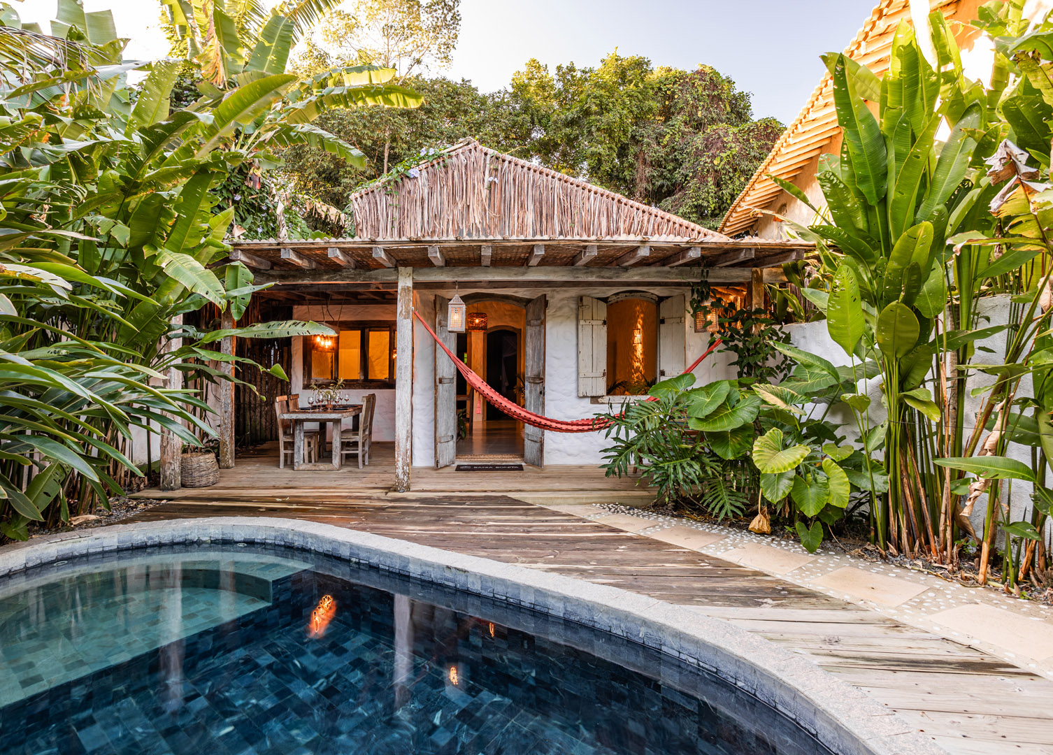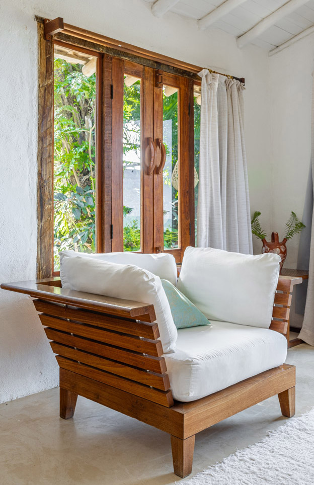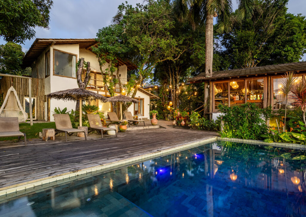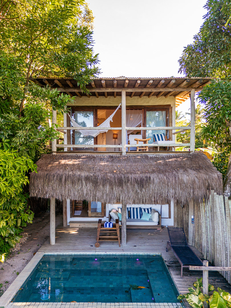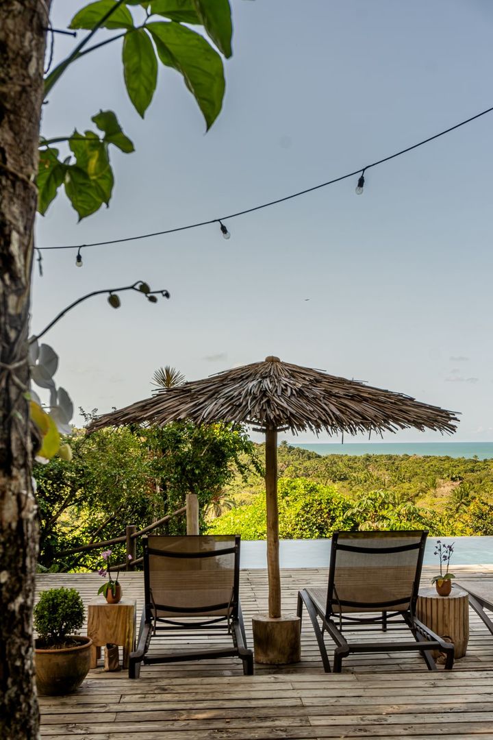 Com 100m², 3 suítes king-size e mosquiteiros dossel, piscina privativa cercada por jardim tropical. Arquitetura baiana com espaços amplos e integrados à natureza. Serviços completos de hotel boutique para até 6 pessoas em Trancoso.