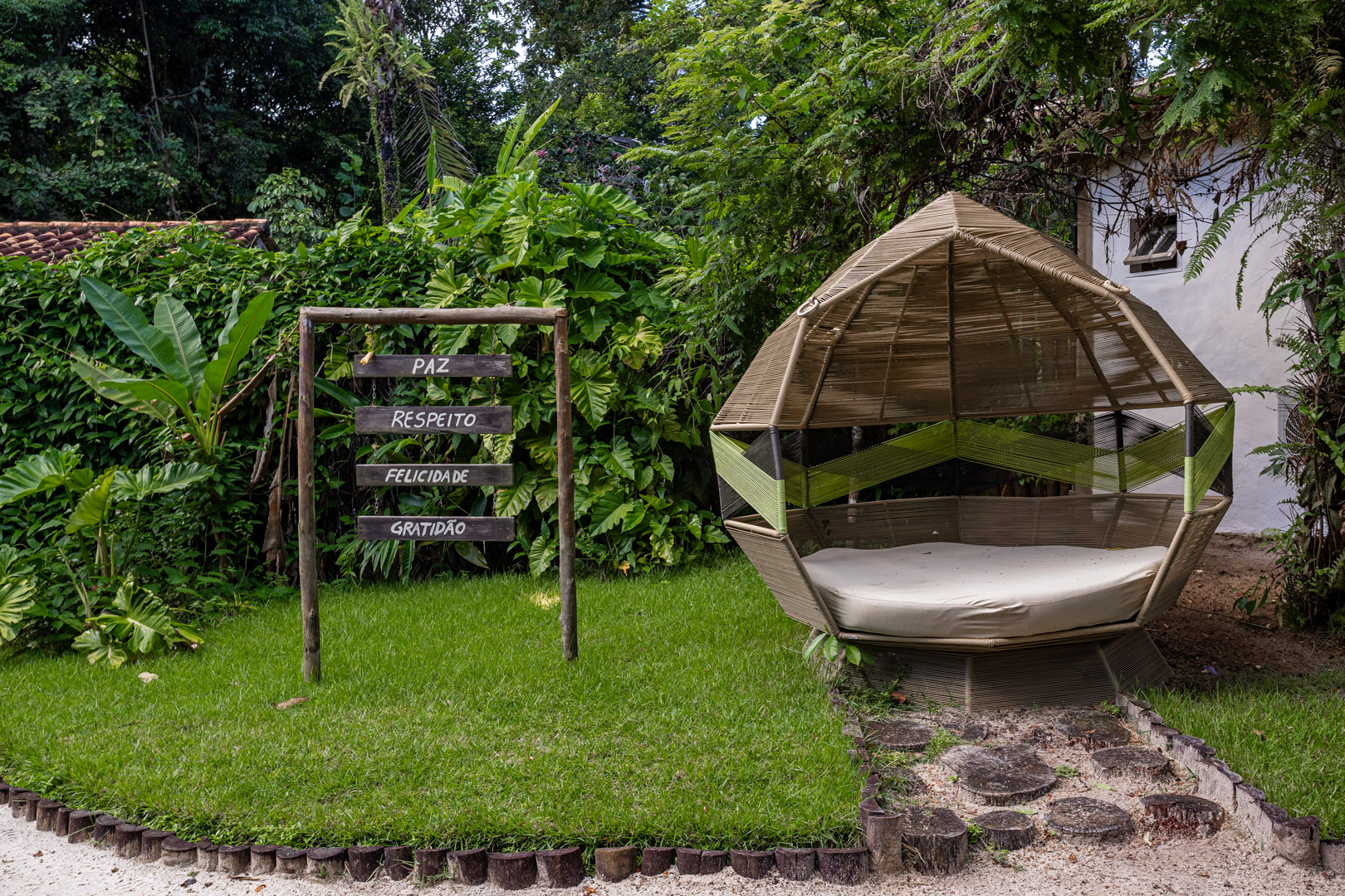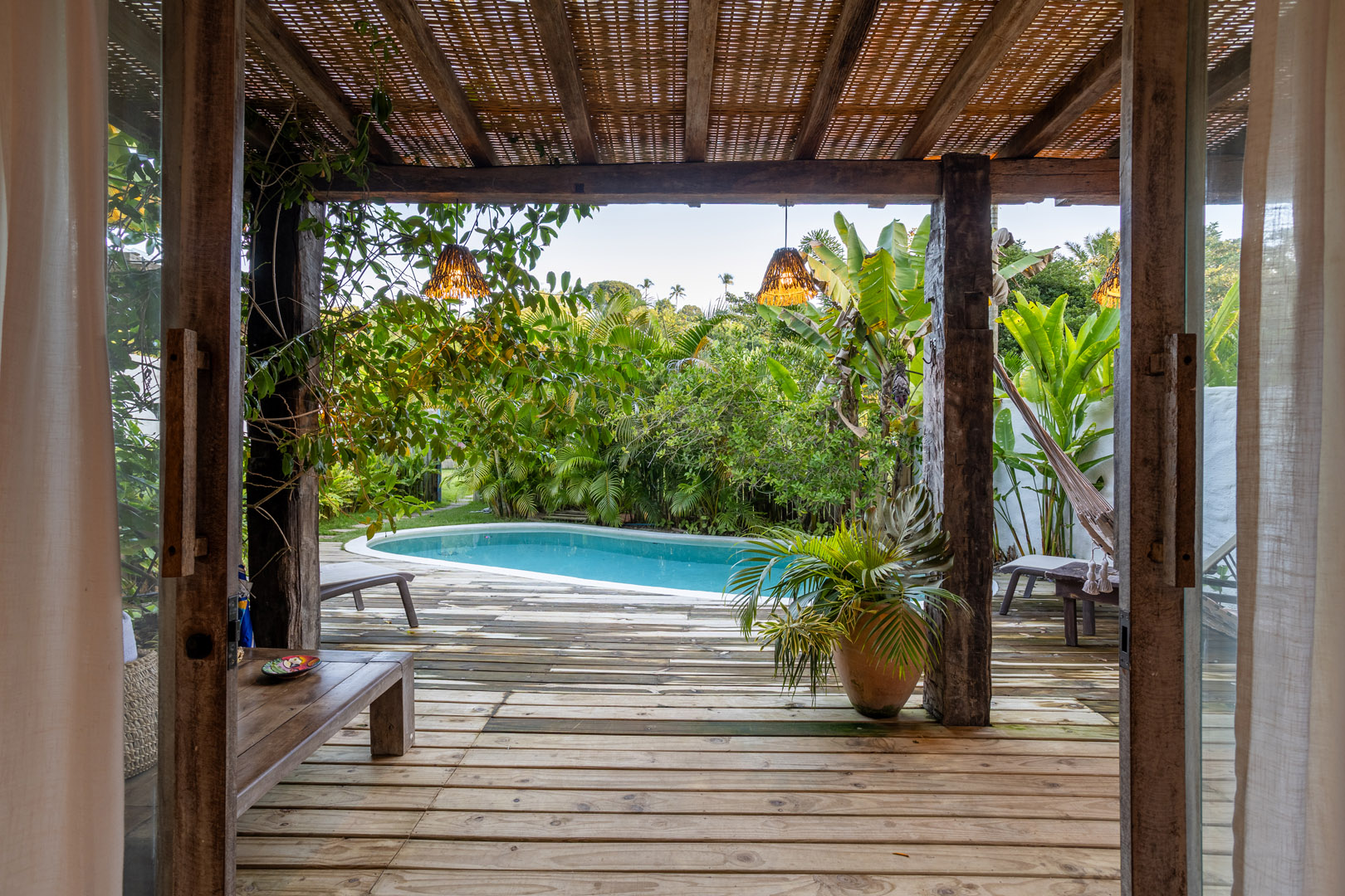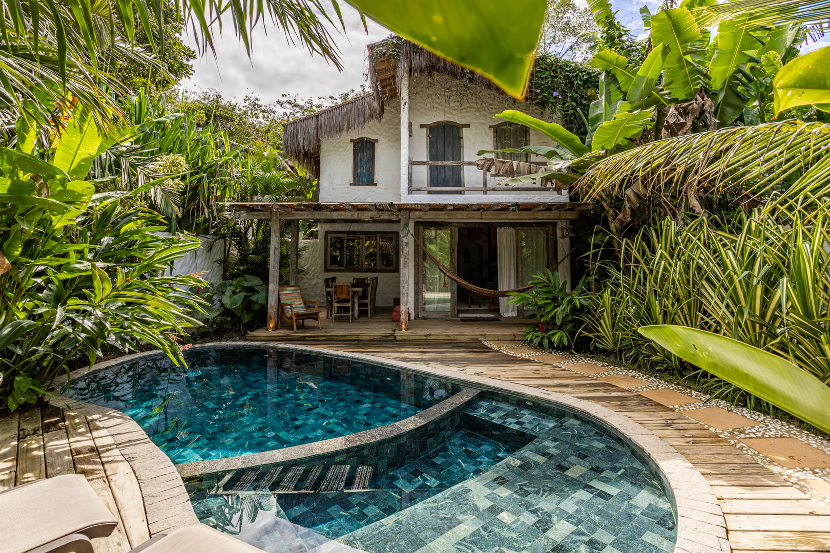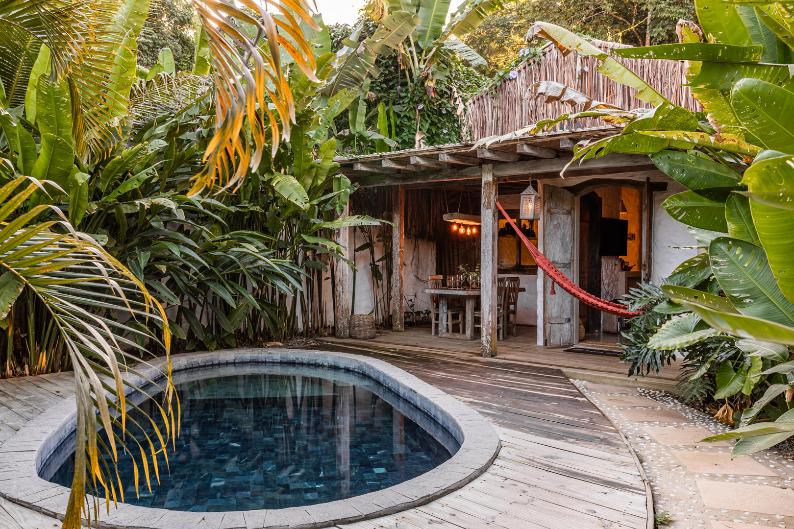 Com 100m², 3 suítes king-size e mosquiteiros dossel, piscina privativa cercada por jardim tropical. Arquitetura baiana com espaços amplos e integrados à natureza. Serviços completos de hotel boutique para até 6 pessoas em Trancoso.