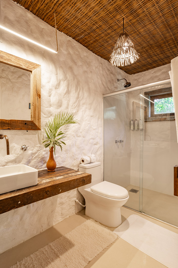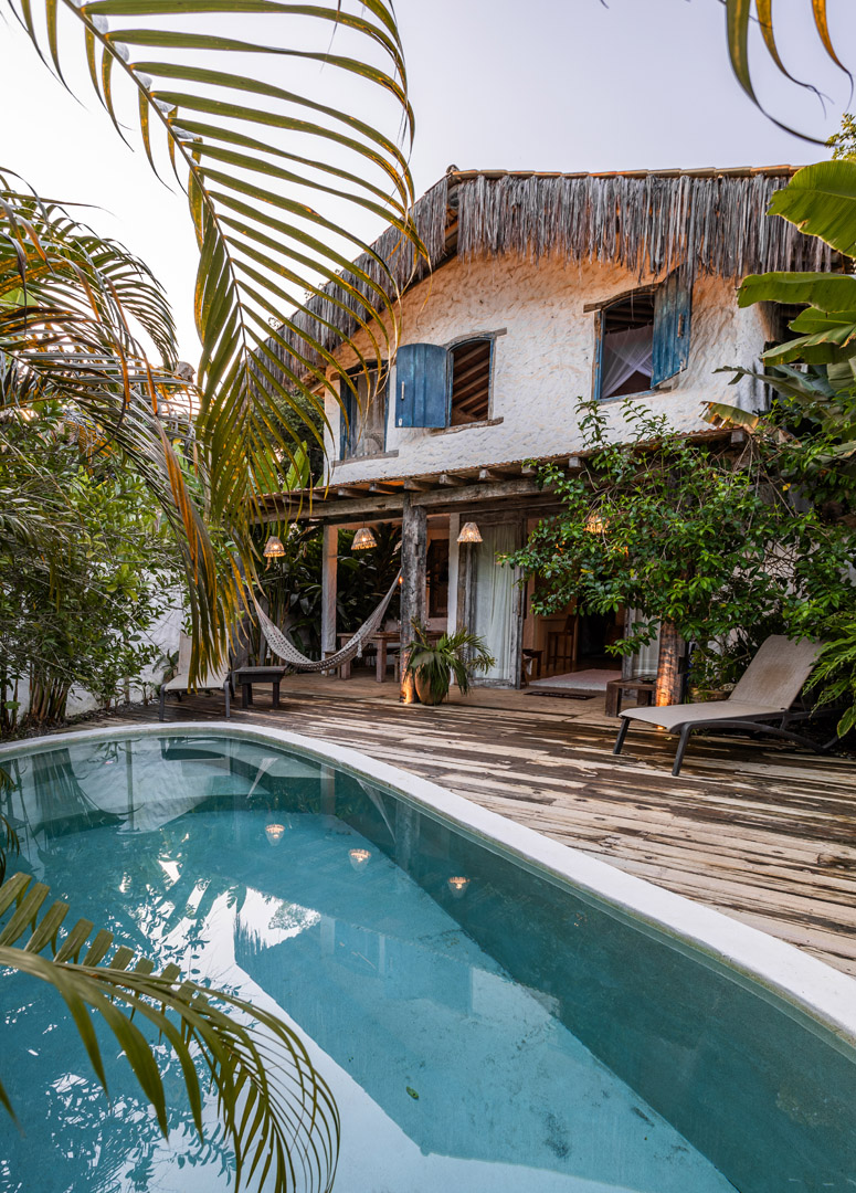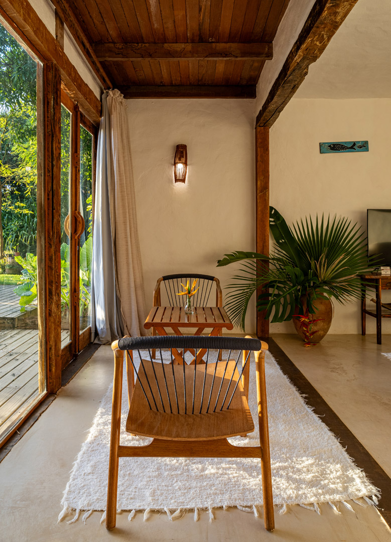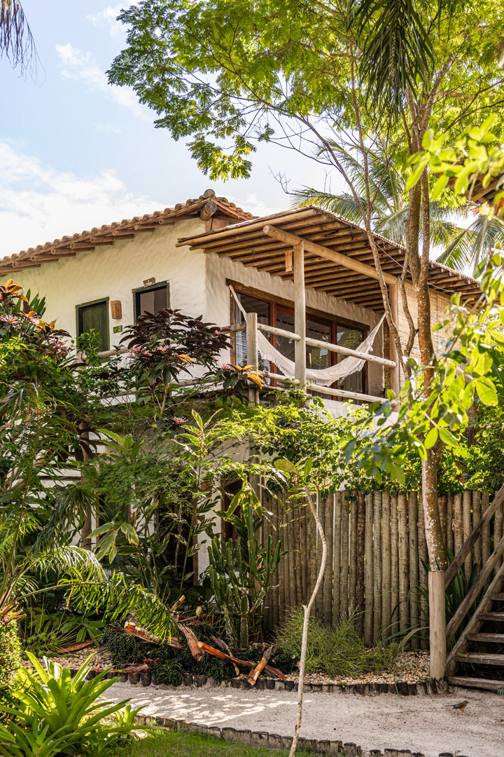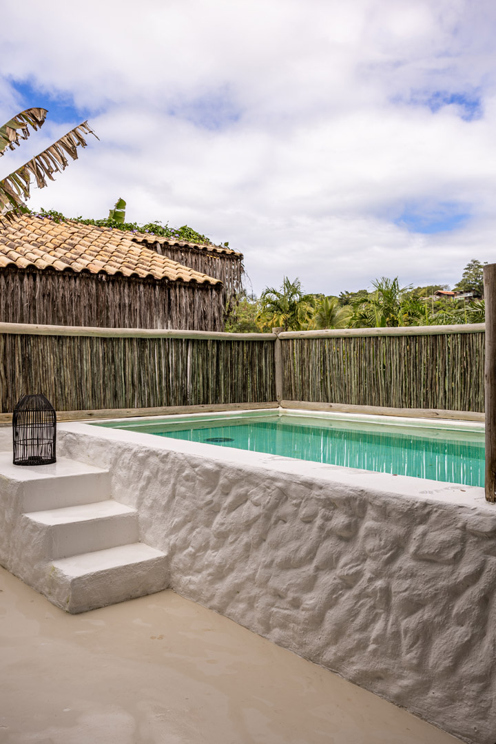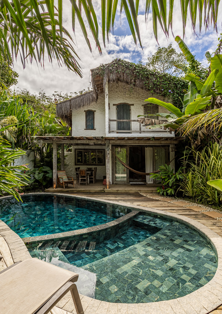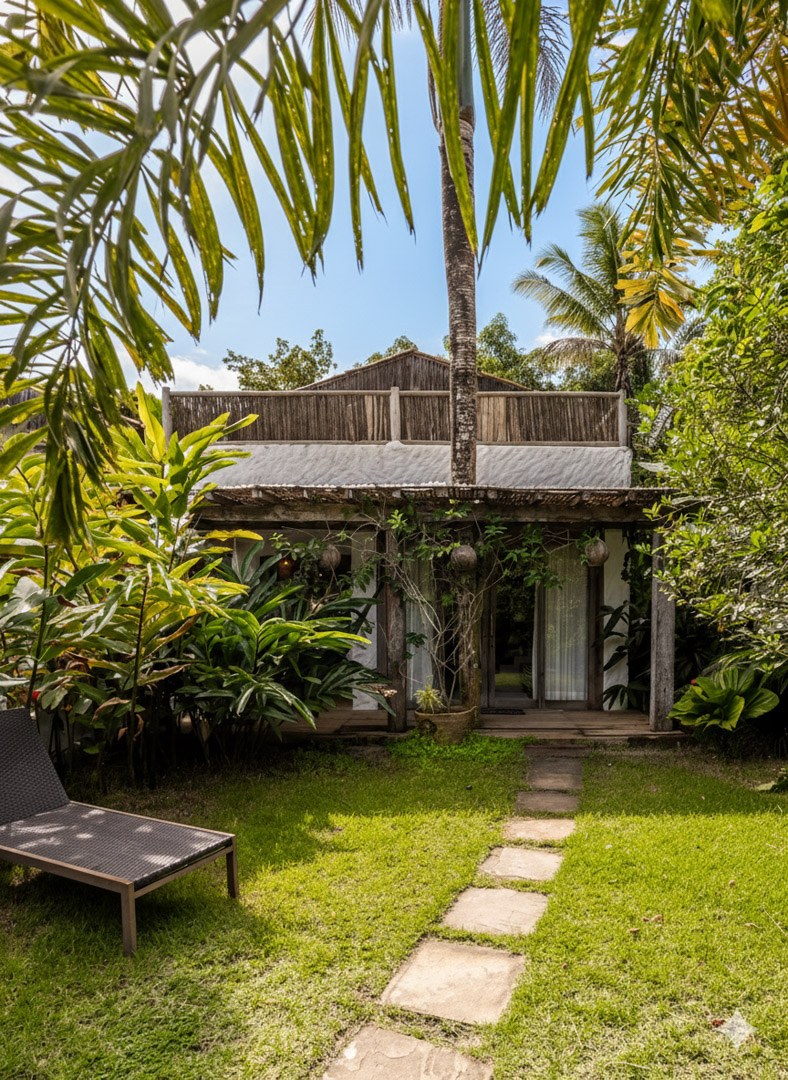 Com 100m², 2 suítes king-size amplas e piscina privativa cercada por jardim tropical. Arquitetura baiana que valoriza luminosidade e simplicidade elegante. Combina privacidade de casa com serviços completos de hotel boutique em Trancoso.
