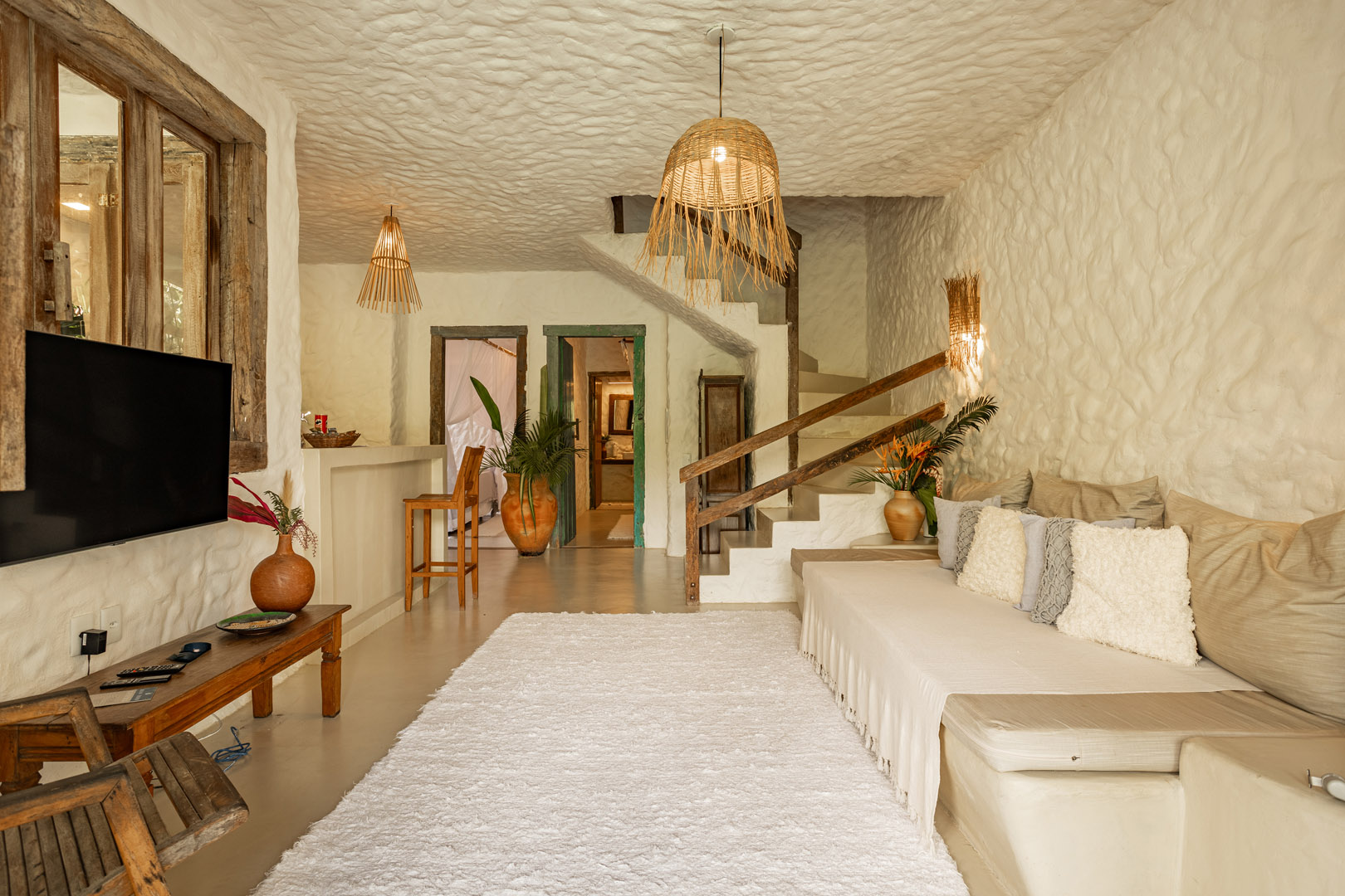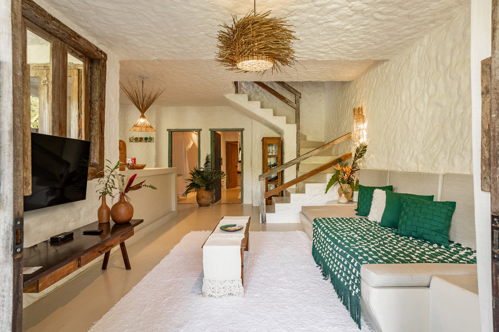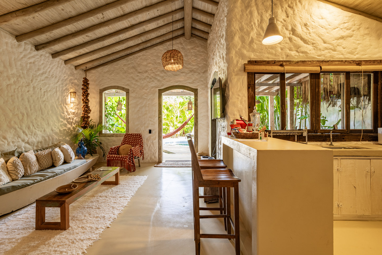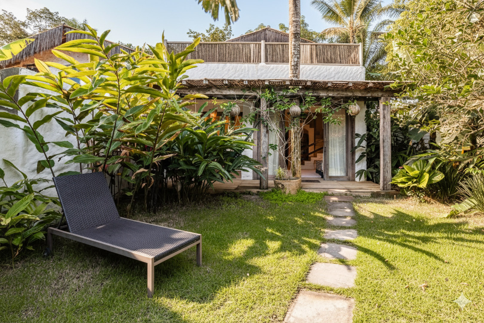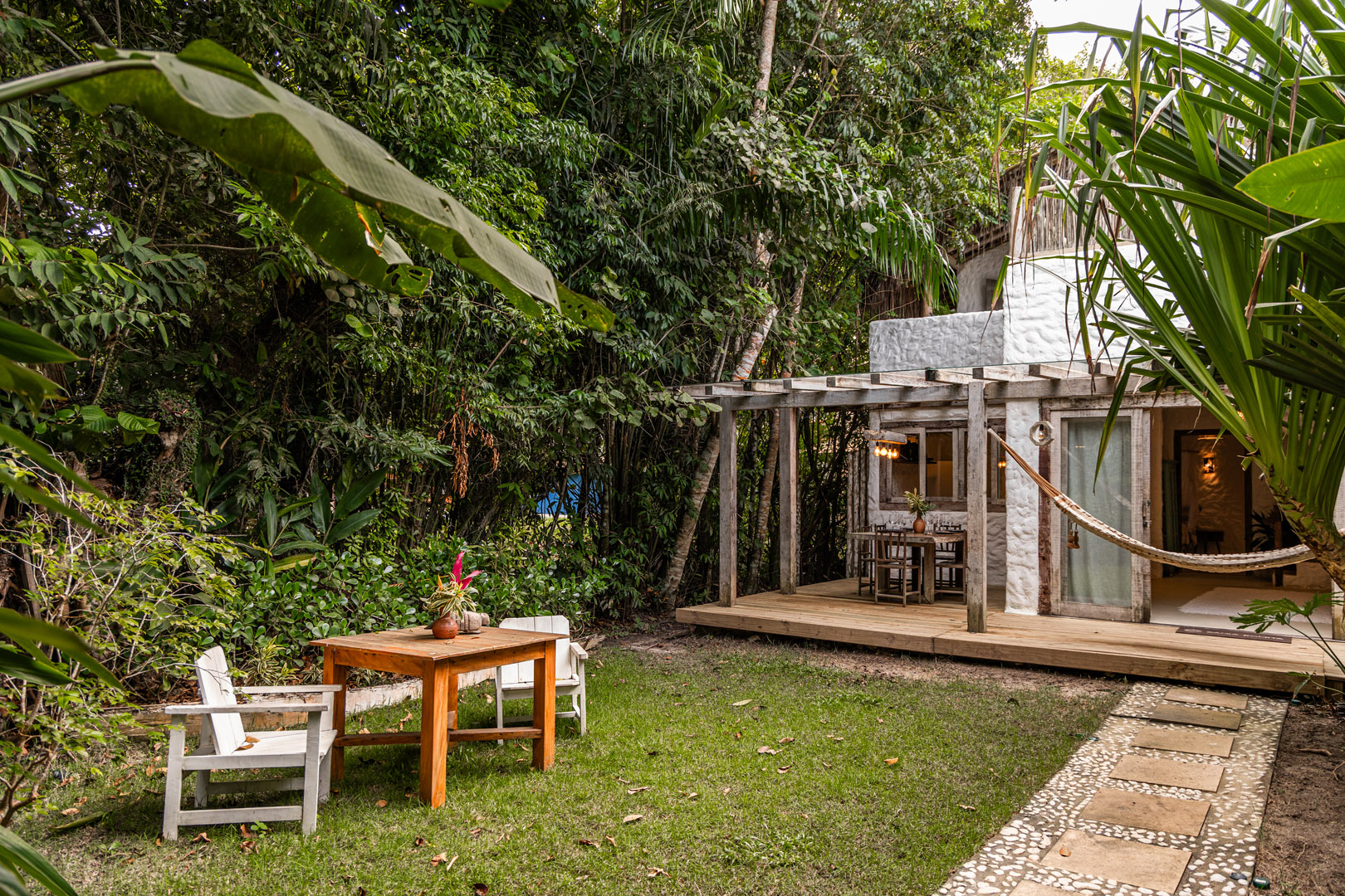 Com 100m², 2 suítes king-size amplas e piscina privativa cercada por jardim tropical. Arquitetura baiana que valoriza luminosidade e simplicidade elegante. Combina privacidade de casa com serviços completos de hotel boutique em Trancoso.