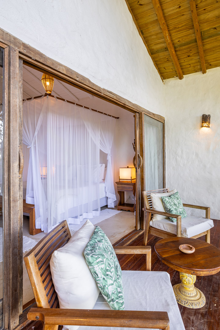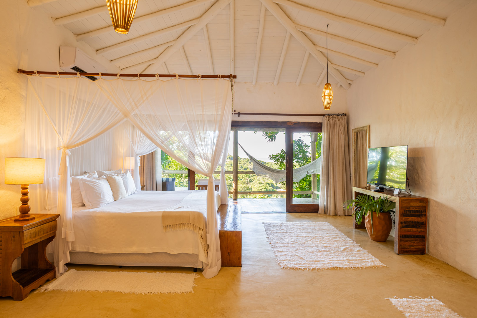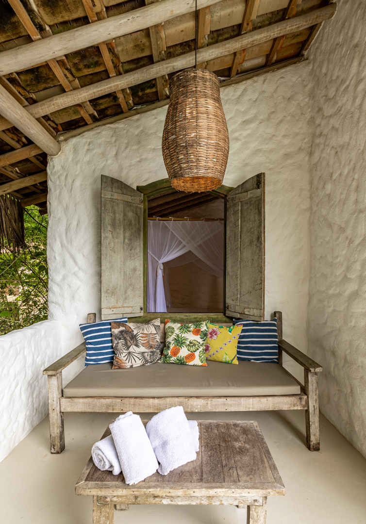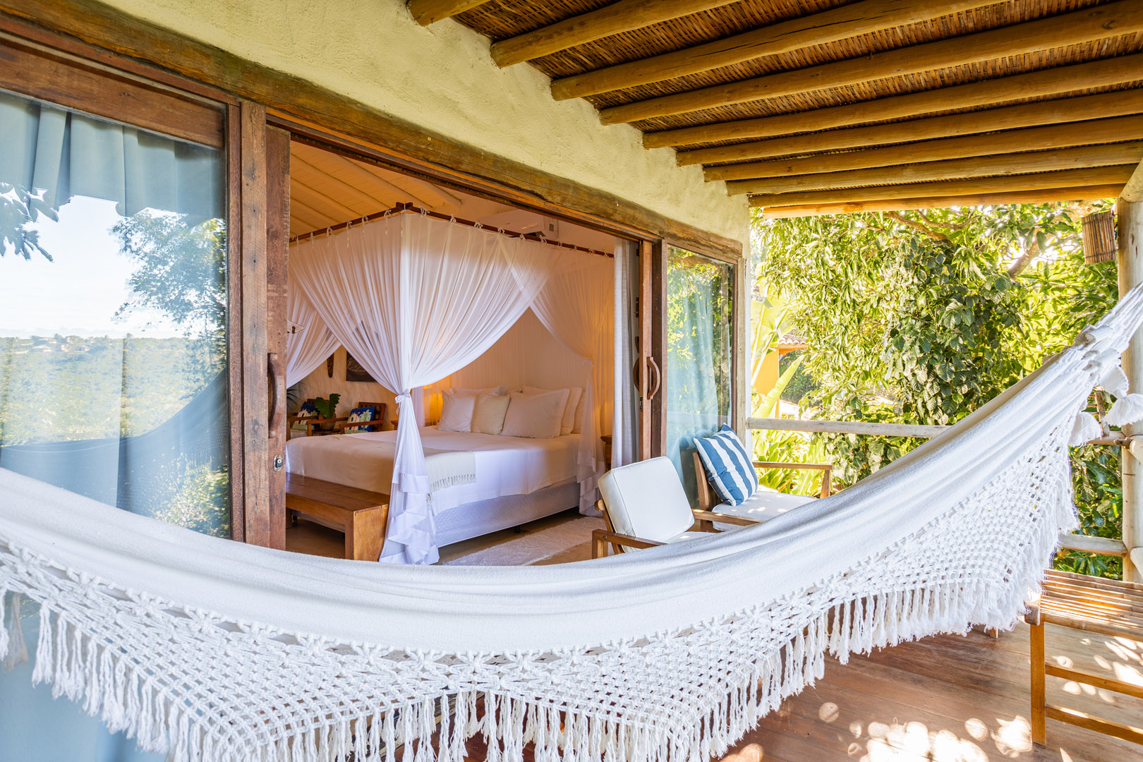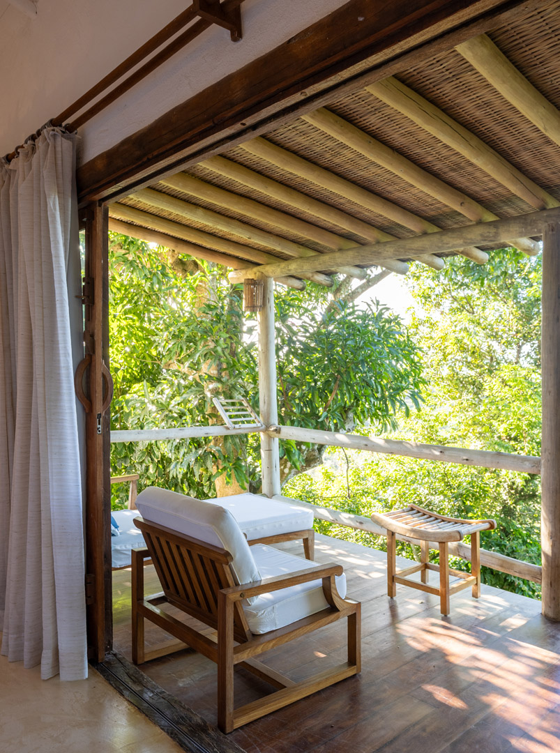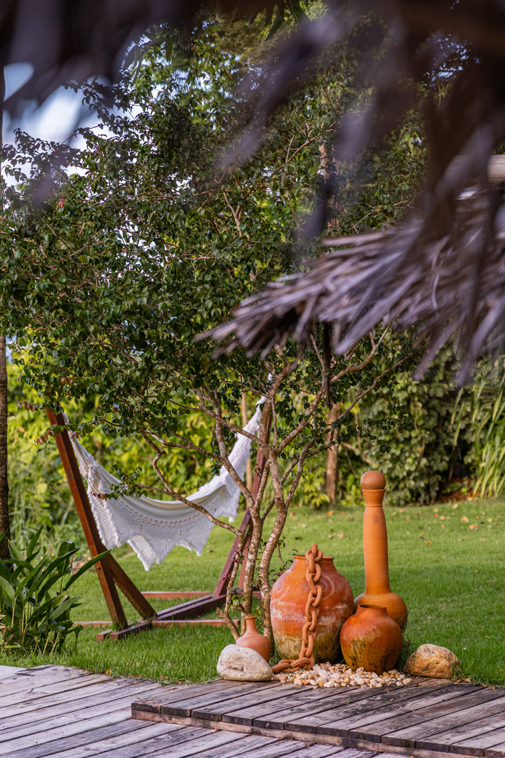 Suíte de 65m² no térreo com varanda privativa, rede e vista para jardim cercado pela Mata Atlântica. Cama king-size com mosquiteiro dossel, closet amplo e decoração com elementos naturais baianos. Conforto acessível para até 3 pessoas.