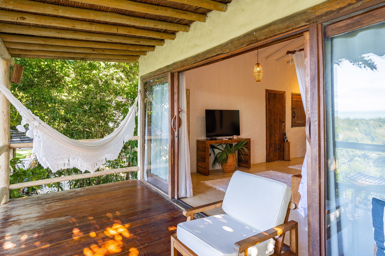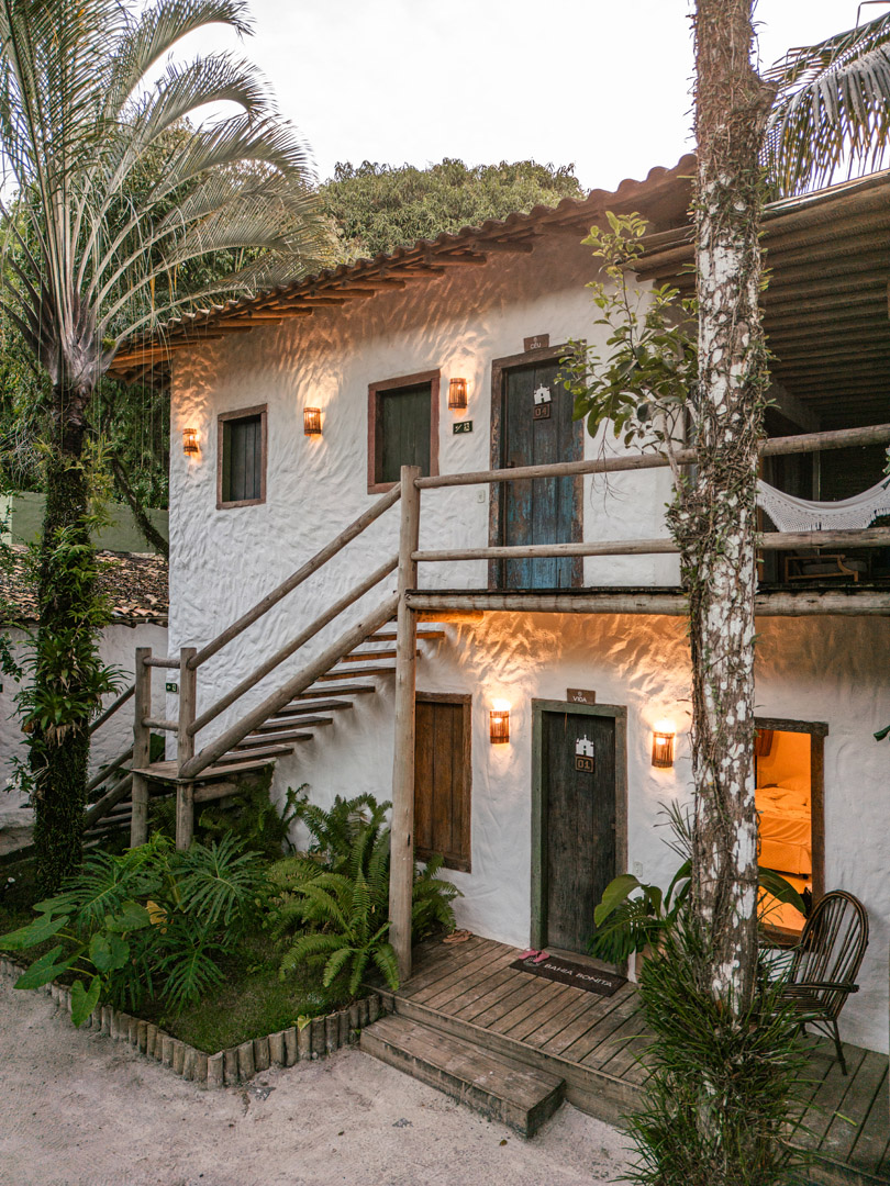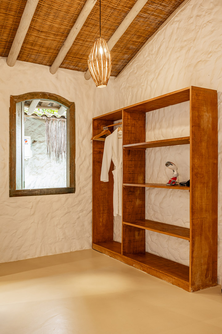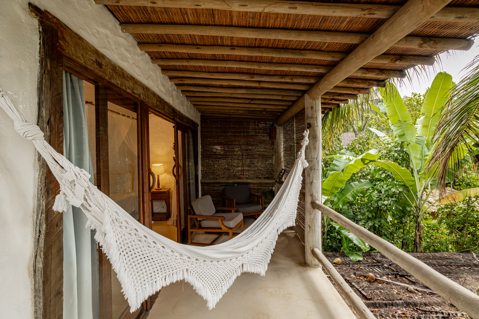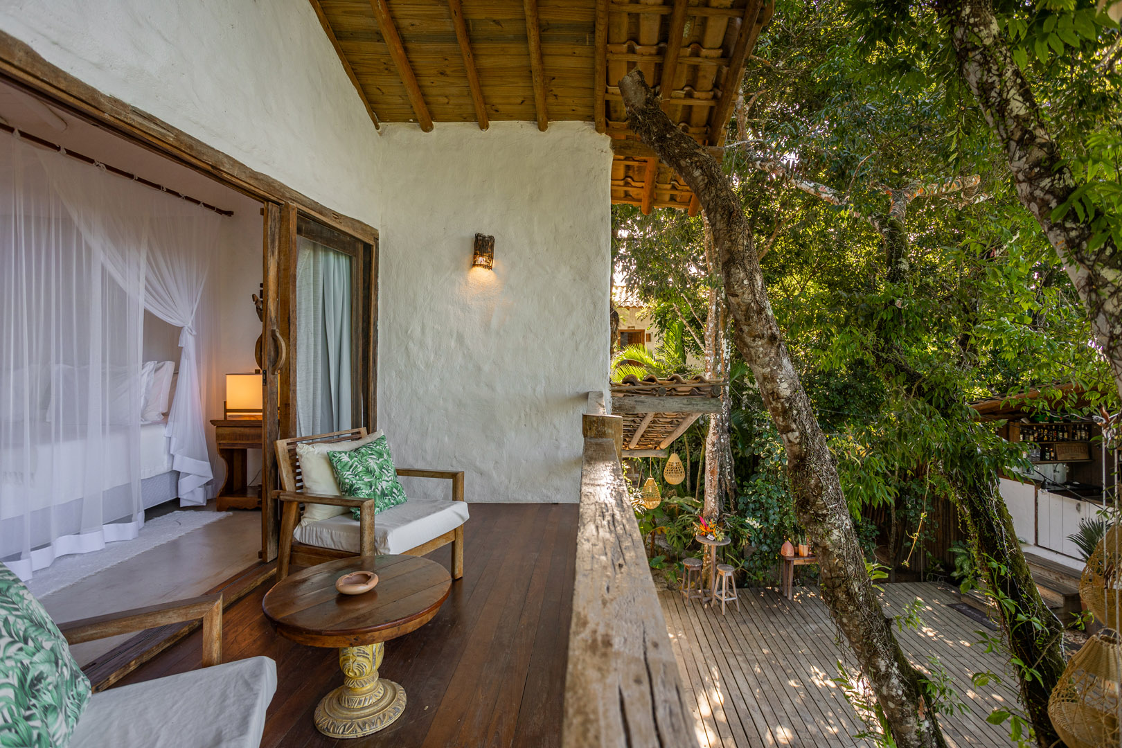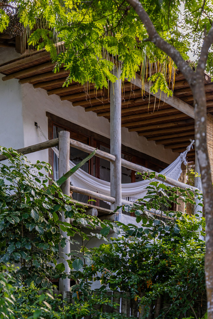 Suíte de 65m² no térreo com varanda privativa, rede e vista para jardim cercado pela Mata Atlântica. Cama king-size com mosquiteiro dossel, closet amplo e decoração com elementos naturais baianos. Conforto acessível para até 3 pessoas.