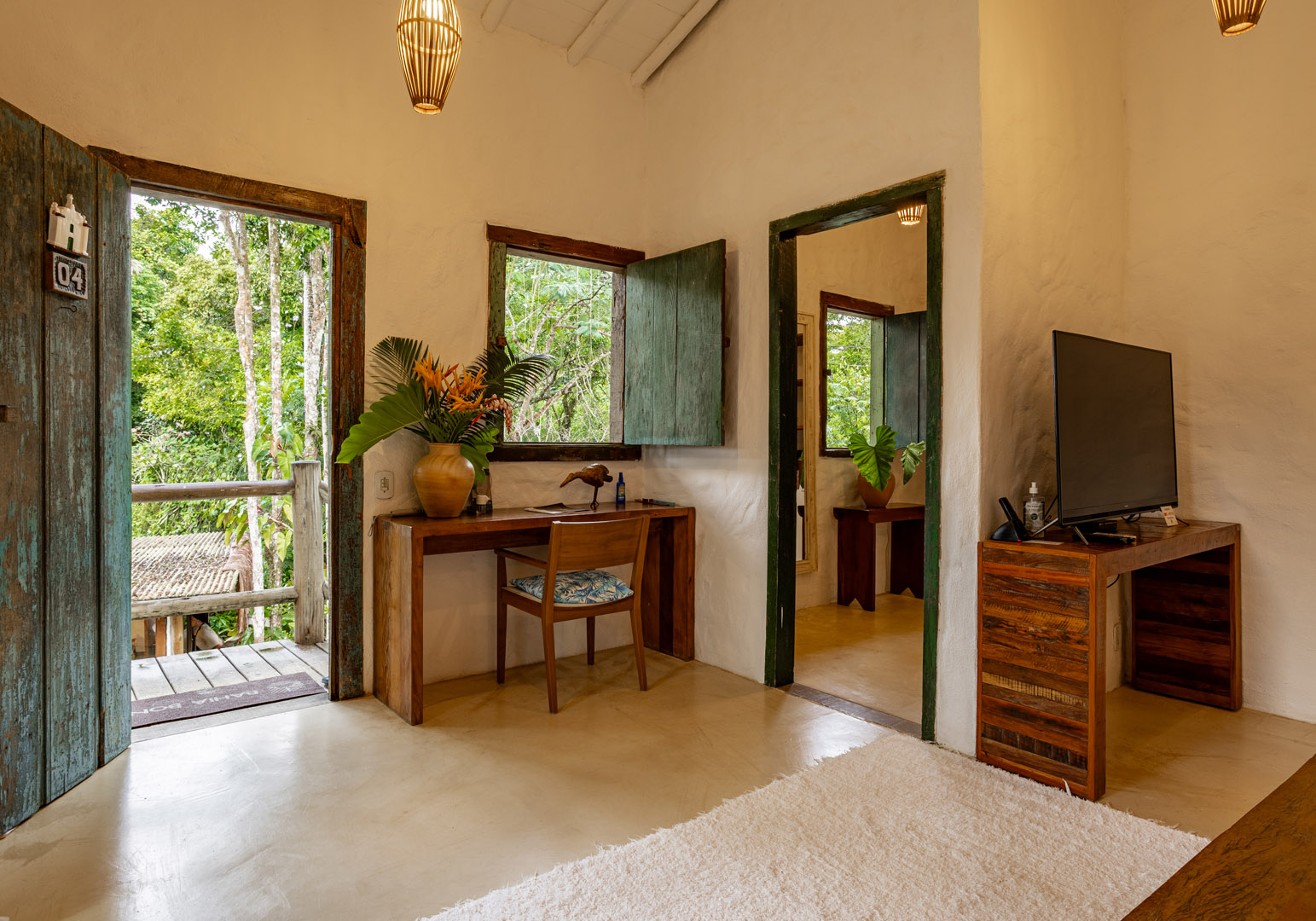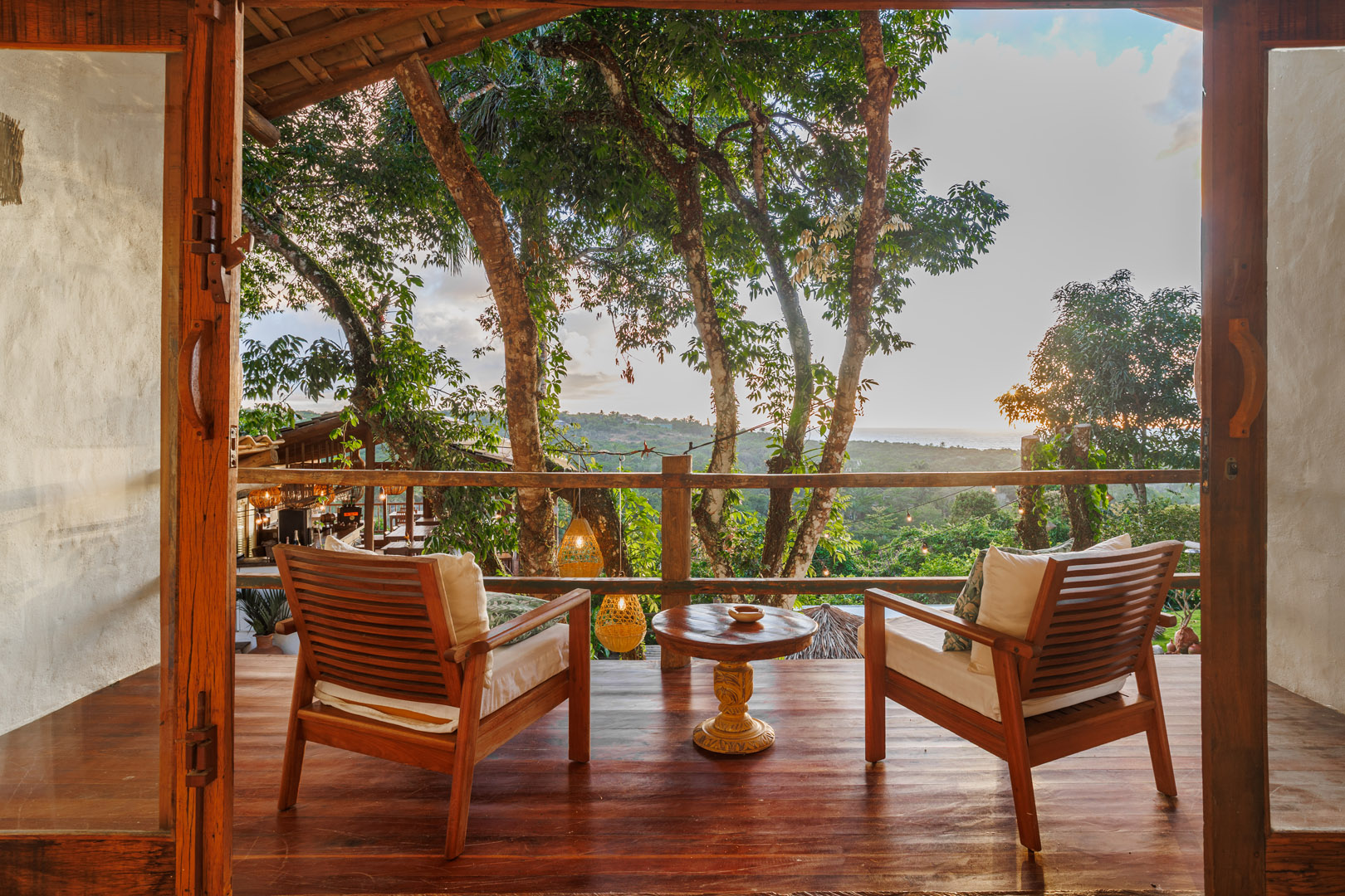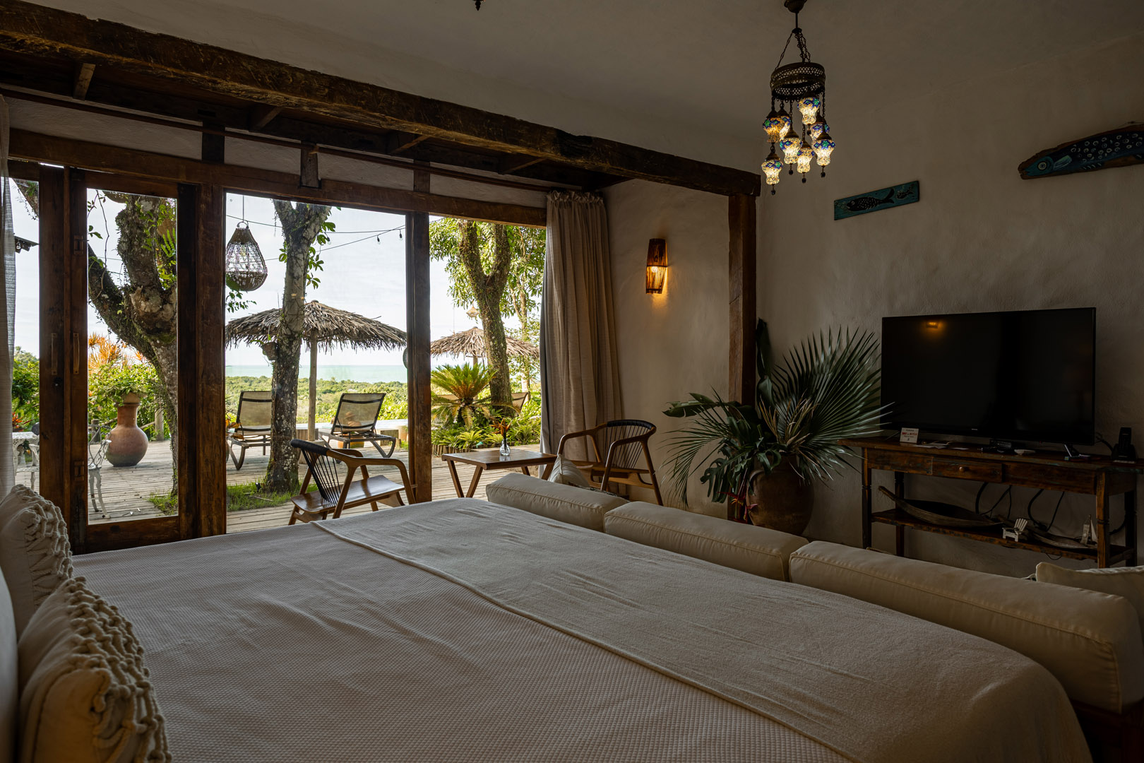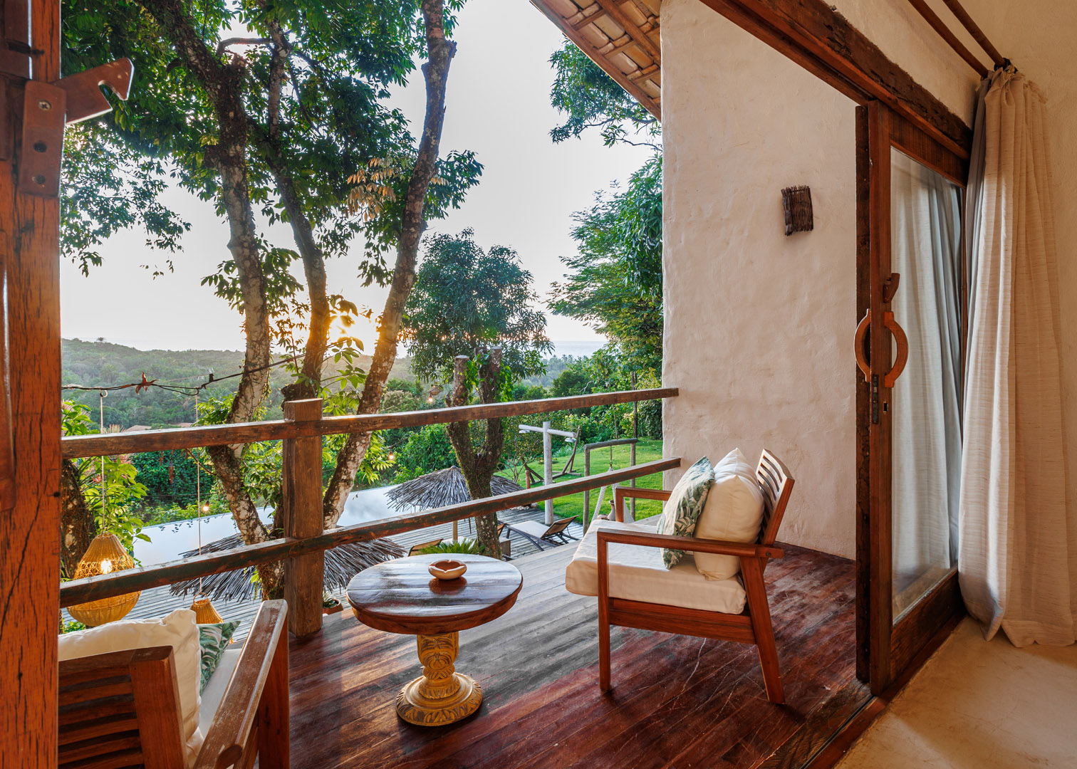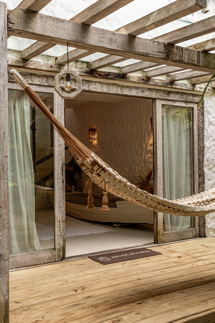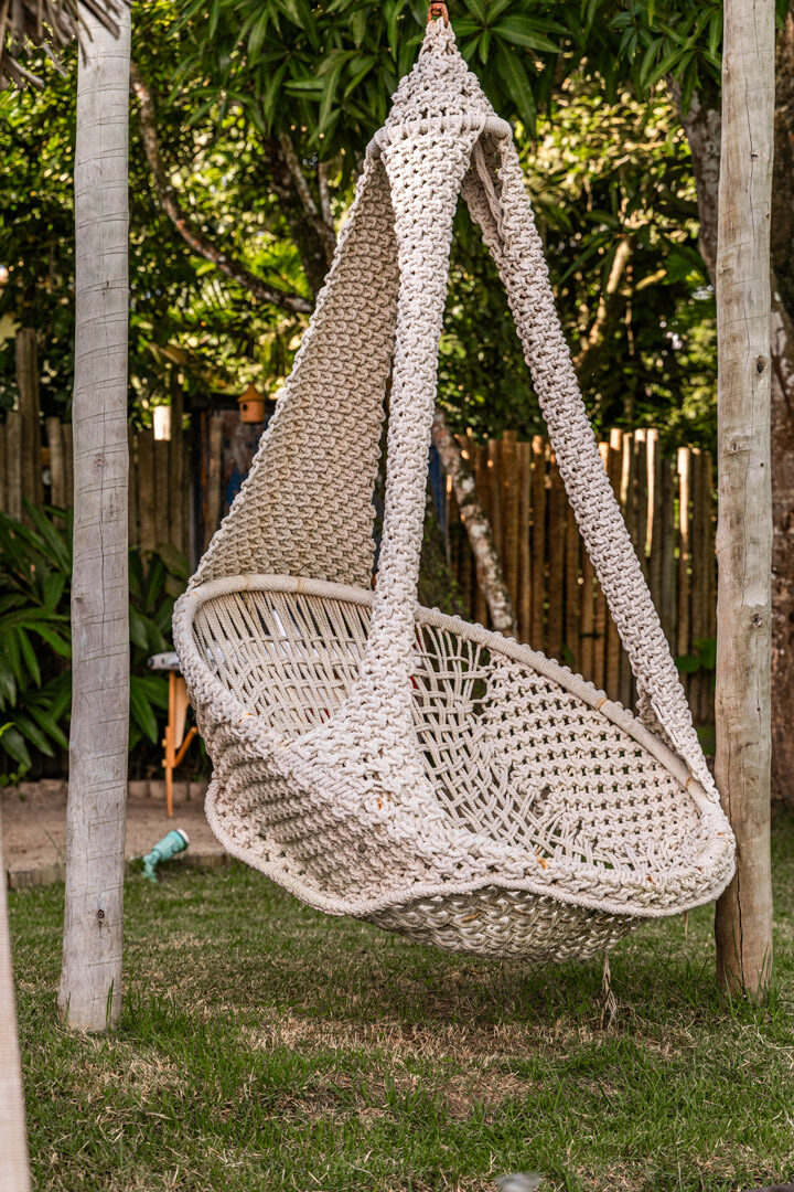 Suíte de 65m² no térreo com varanda privativa, rede e vista para jardim cercado pela Mata Atlântica. Cama king-size com mosquiteiro dossel, closet amplo e decoração com elementos naturais baianos. Conforto acessível para até 3 pessoas.