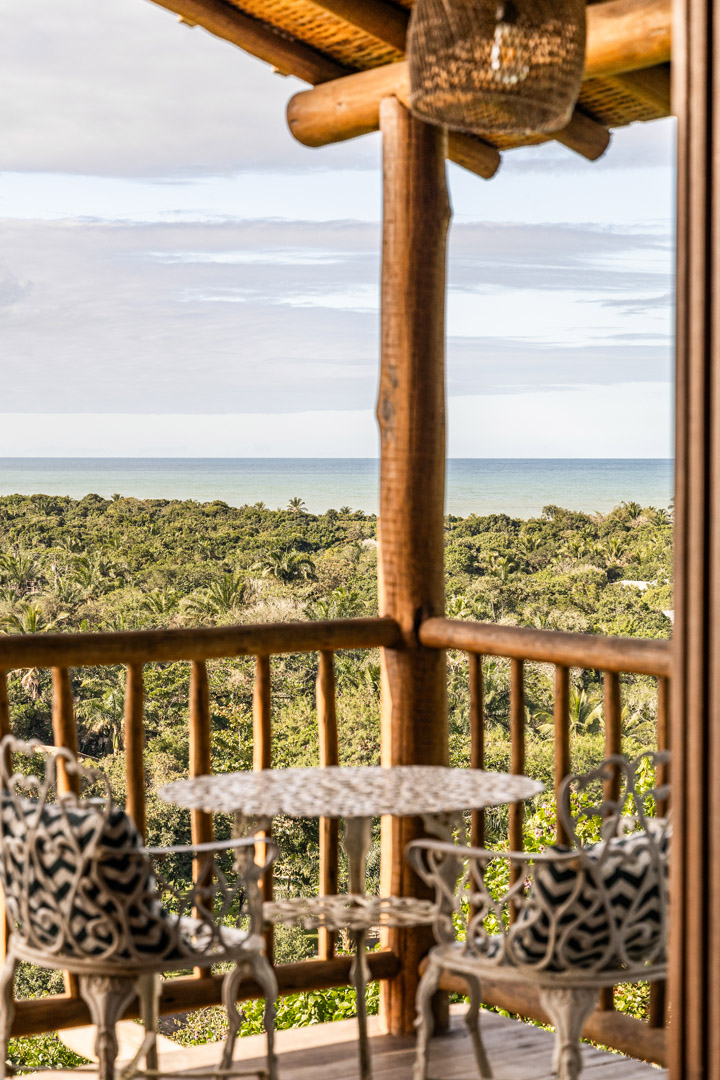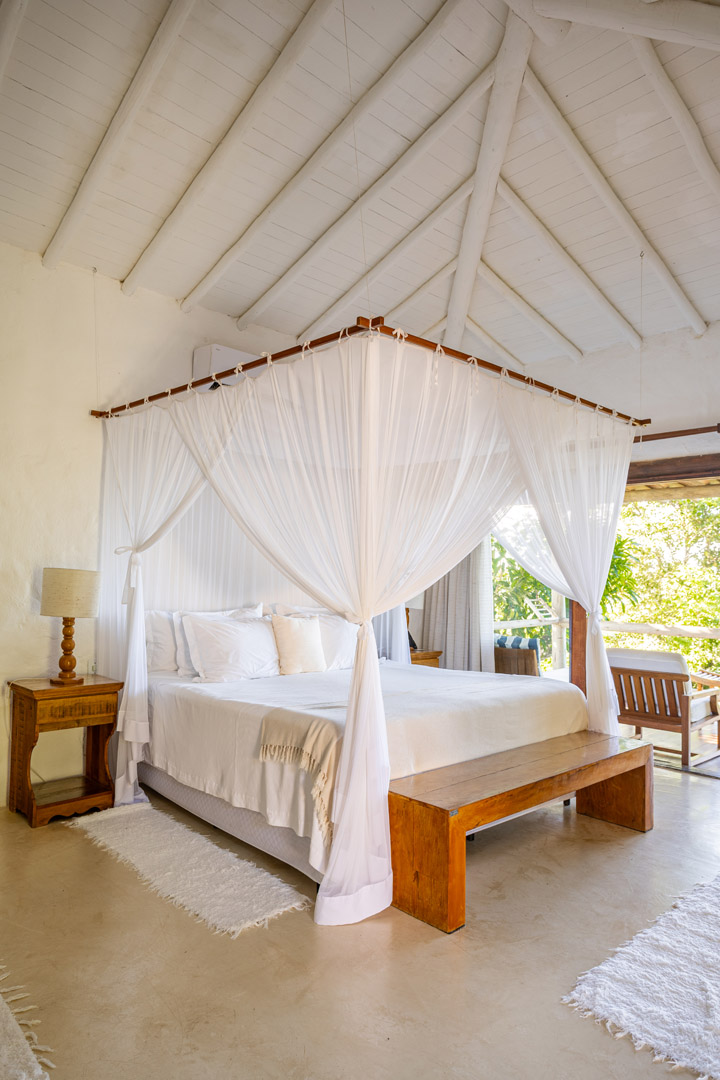 Suíte master de 80m² no primeiro andar com varanda privativa e vista panorâmica do mar. Cama king-size com mosquiteiro dossel, chuveiro duplo, closet amplo e área de estar. Elegância tropical cercada pela Mata Atlântica em Trancoso.