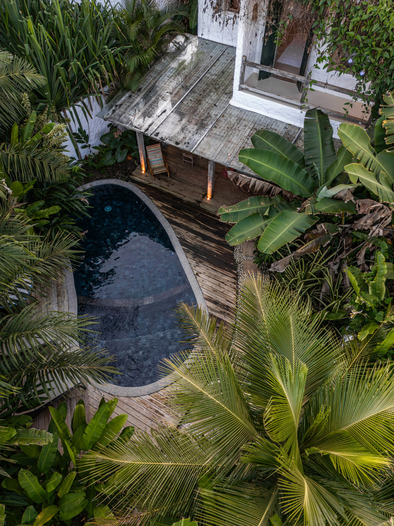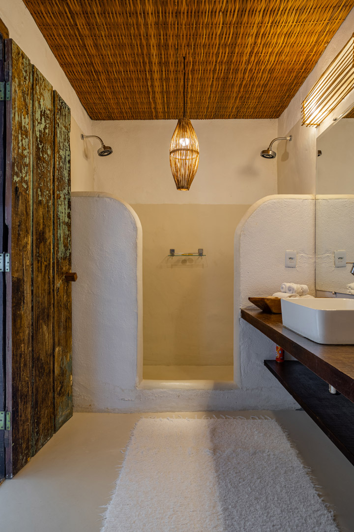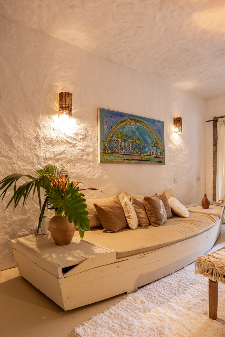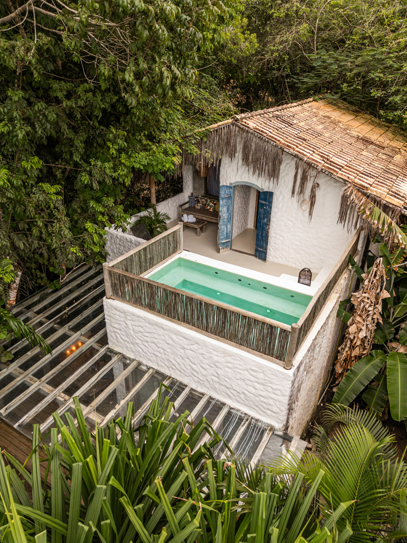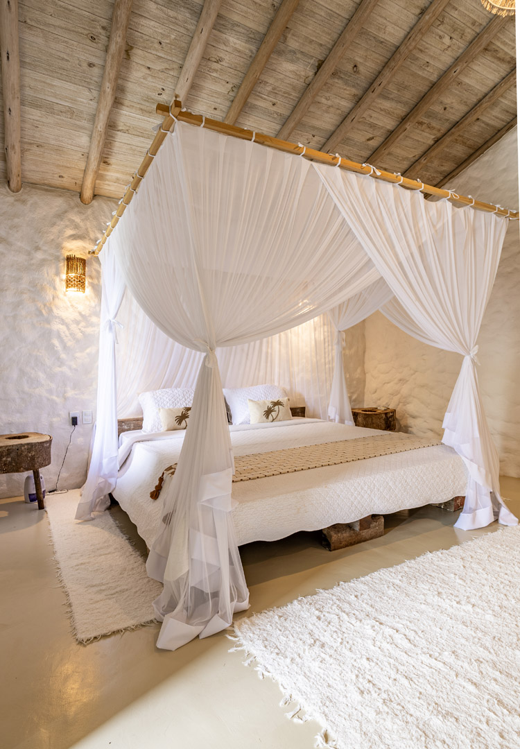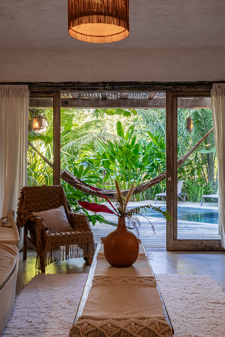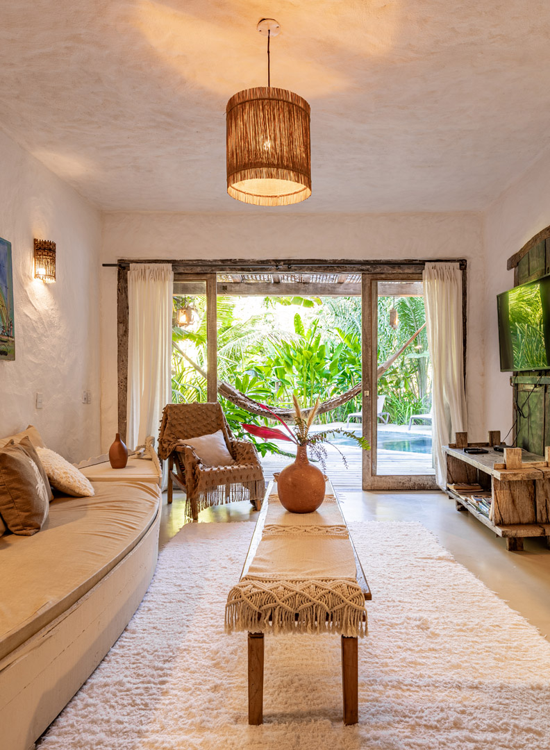 Com 100m² , 3 suítes king-size e mosquiteiros dossel, piscina-jacuzzi privativa no terraço com vista para jardim tropical. Arquitetura baiana contemporânea com áreas fluidas e integradas. Serviços completos de hotel boutique para até 6 pessoas.