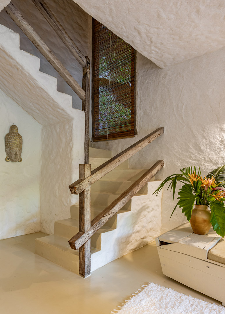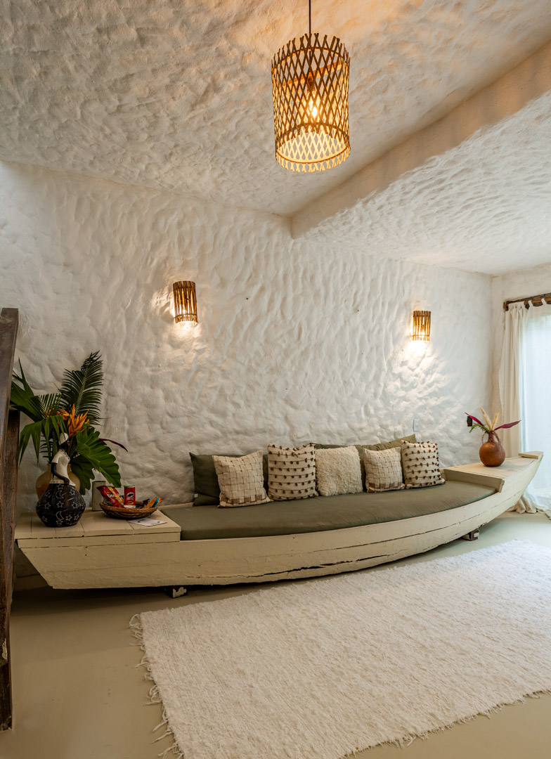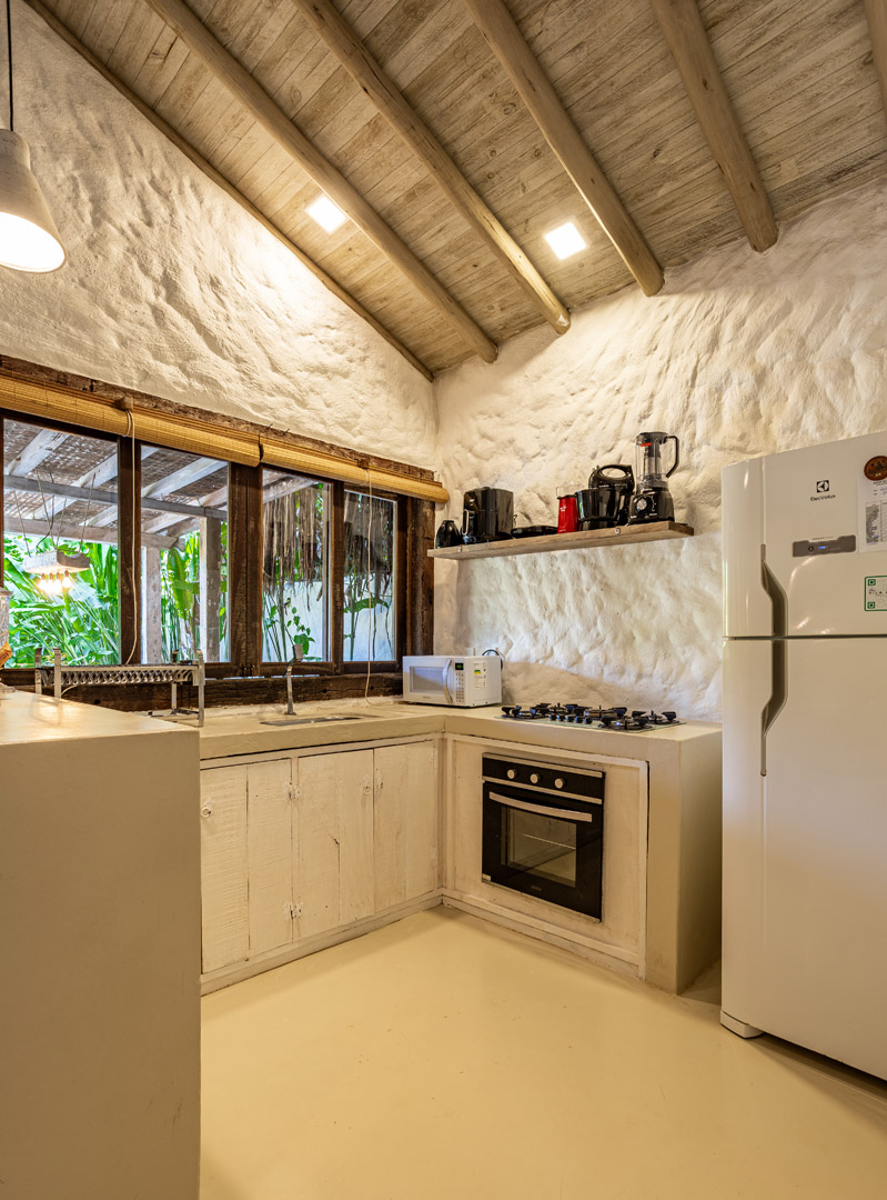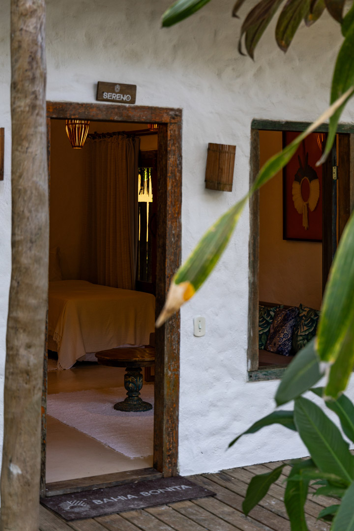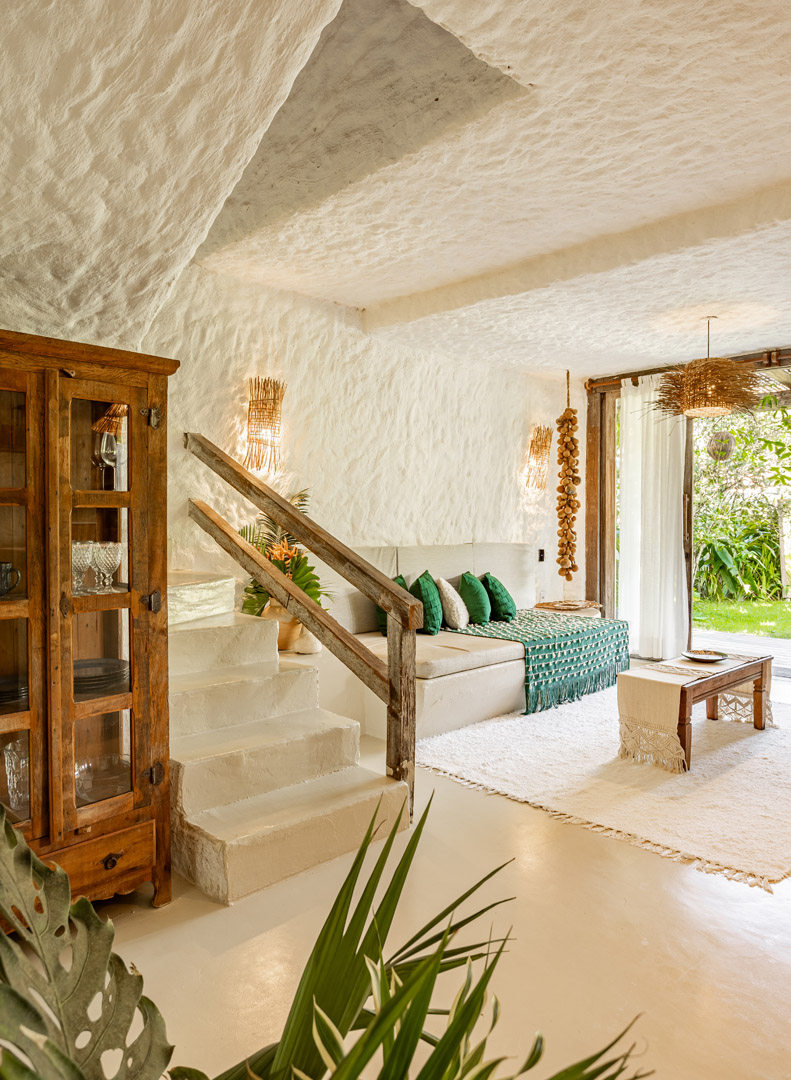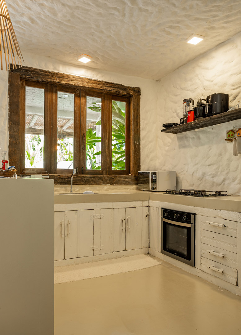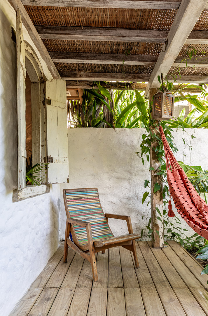 Com 100m² , 3 suítes king-size e mosquiteiros dossel, piscina-jacuzzi privativa no terraço com vista para jardim tropical. Arquitetura baiana contemporânea com áreas fluidas e integradas. Serviços completos de hotel boutique para até 6 pessoas.