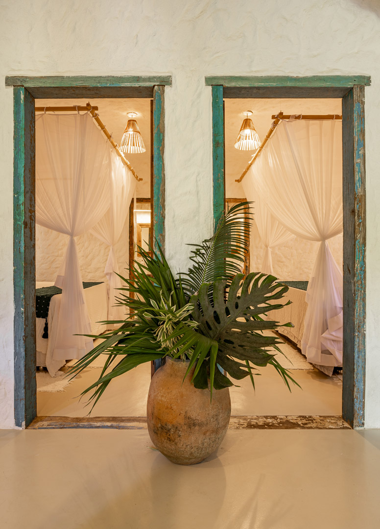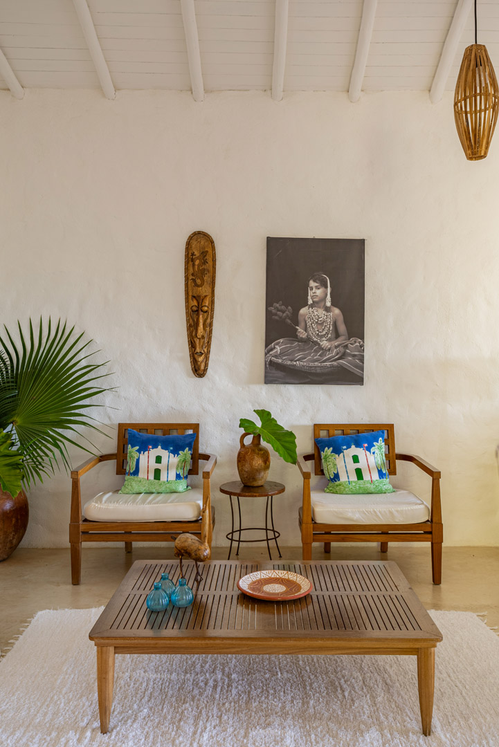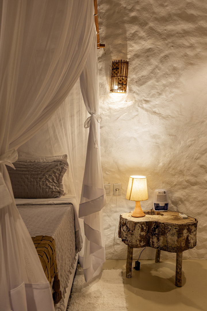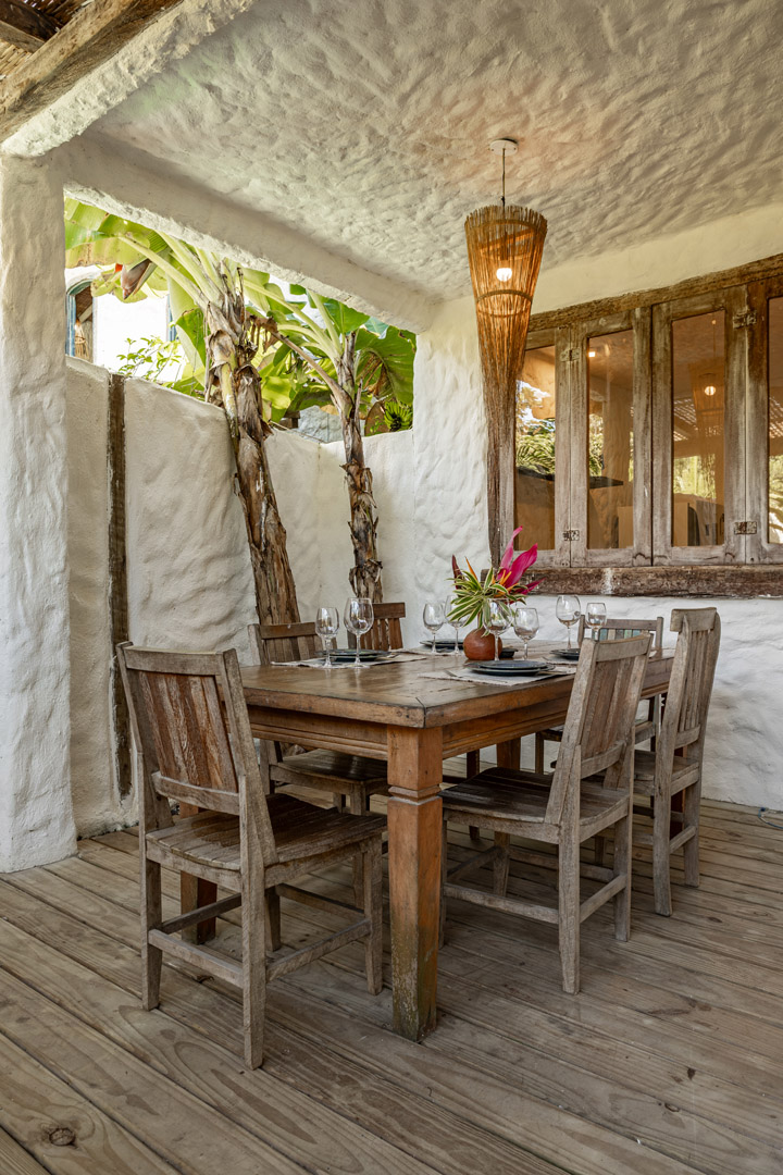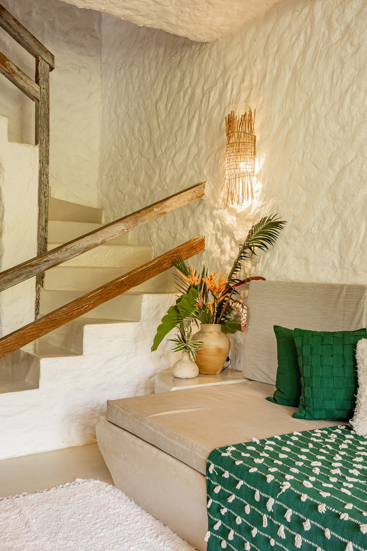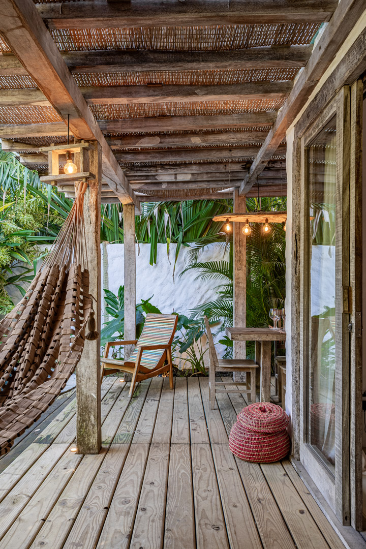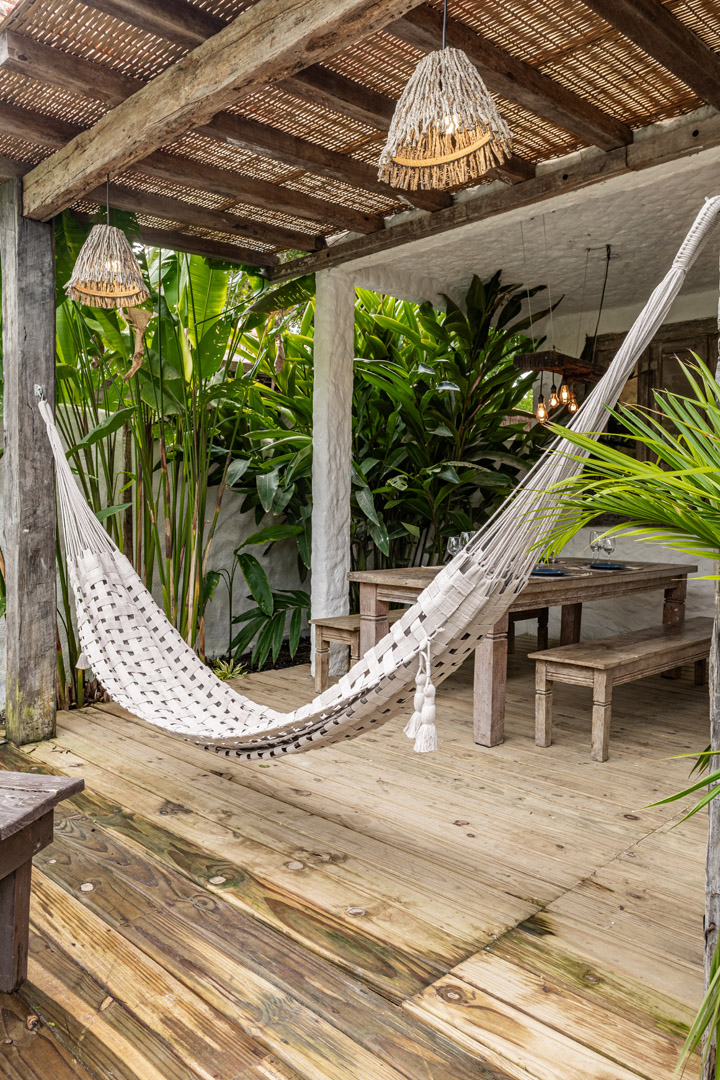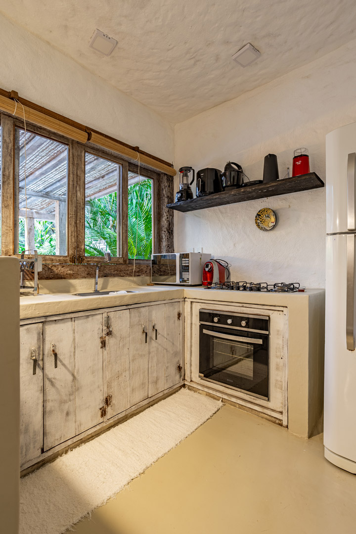 Com 100m² , 3 suítes king-size e mosquiteiros dossel, piscina-jacuzzi privativa no terraço com vista para jardim tropical. Arquitetura baiana contemporânea com áreas fluidas e integradas. Serviços completos de hotel boutique para até 6 pessoas.