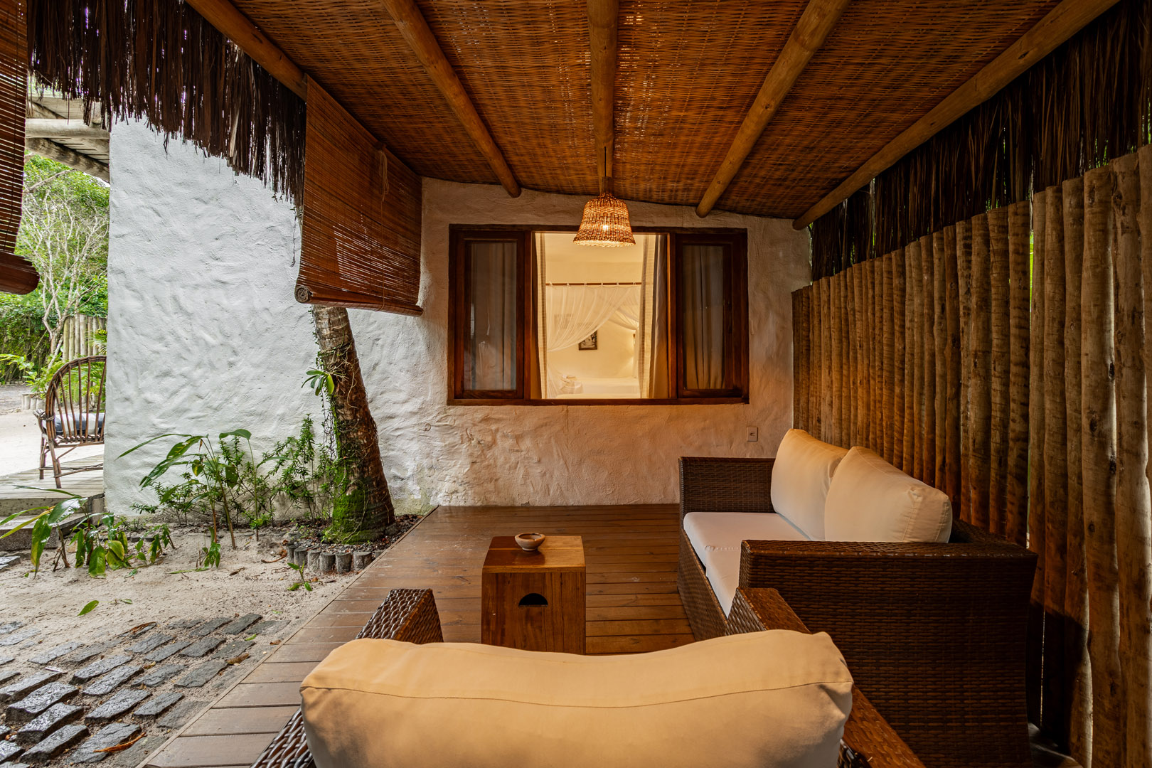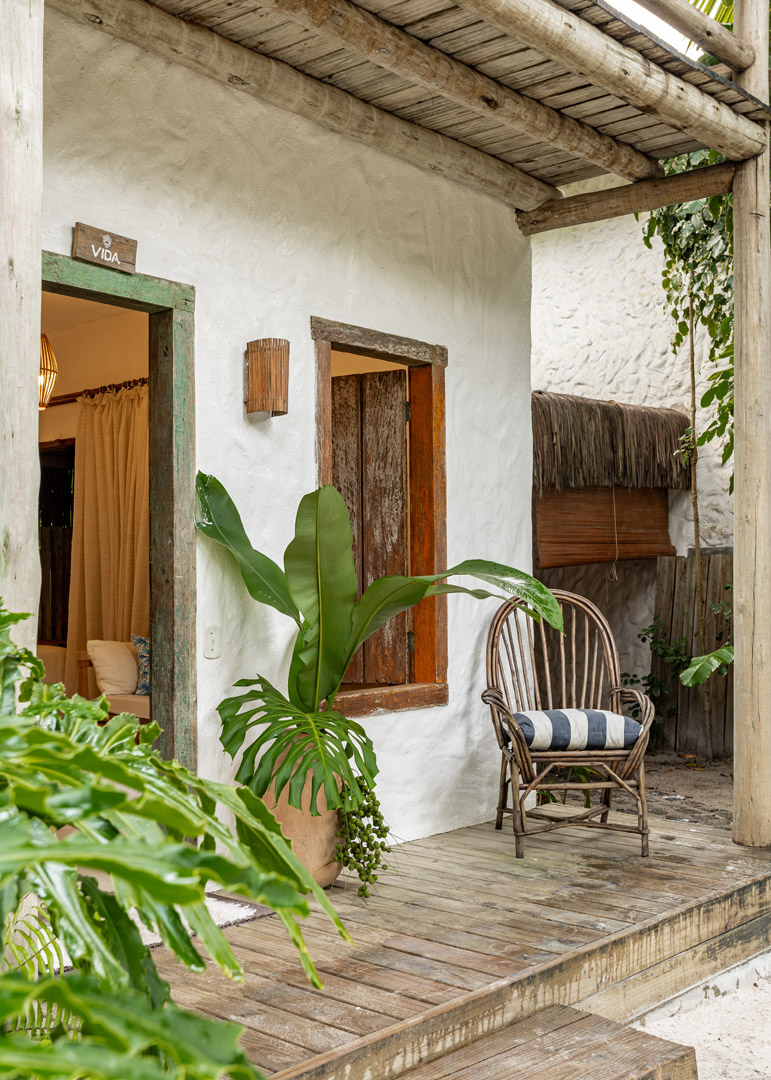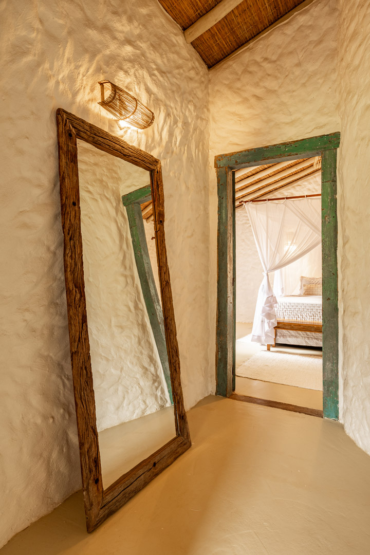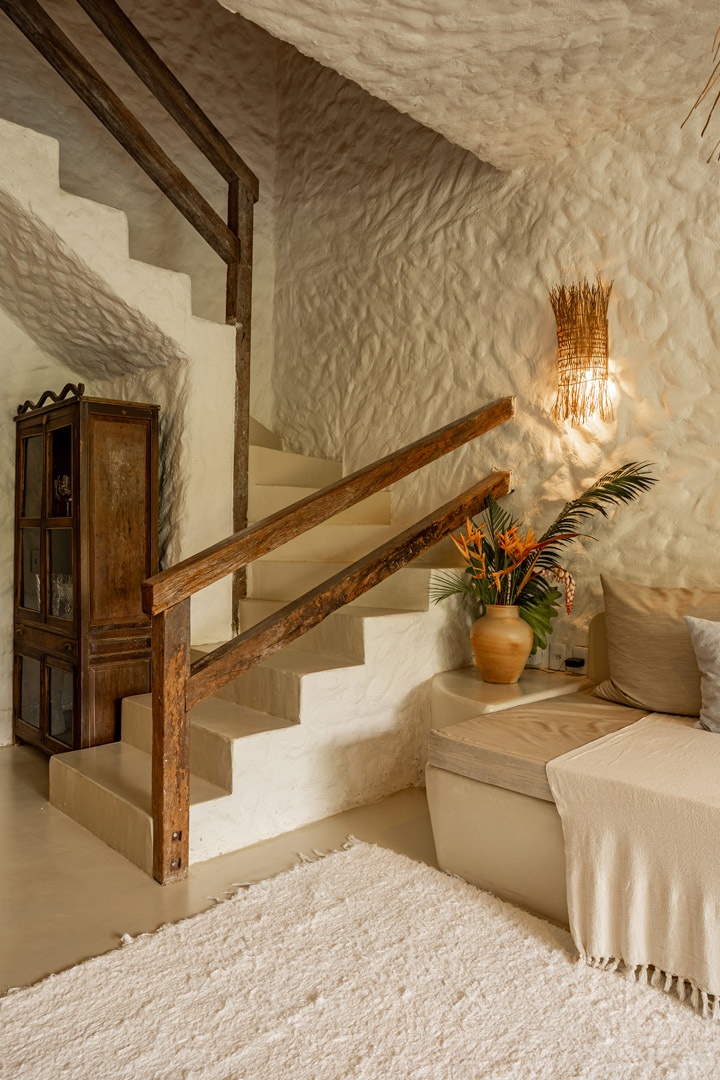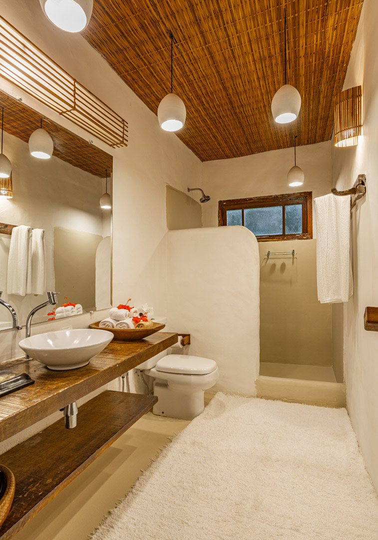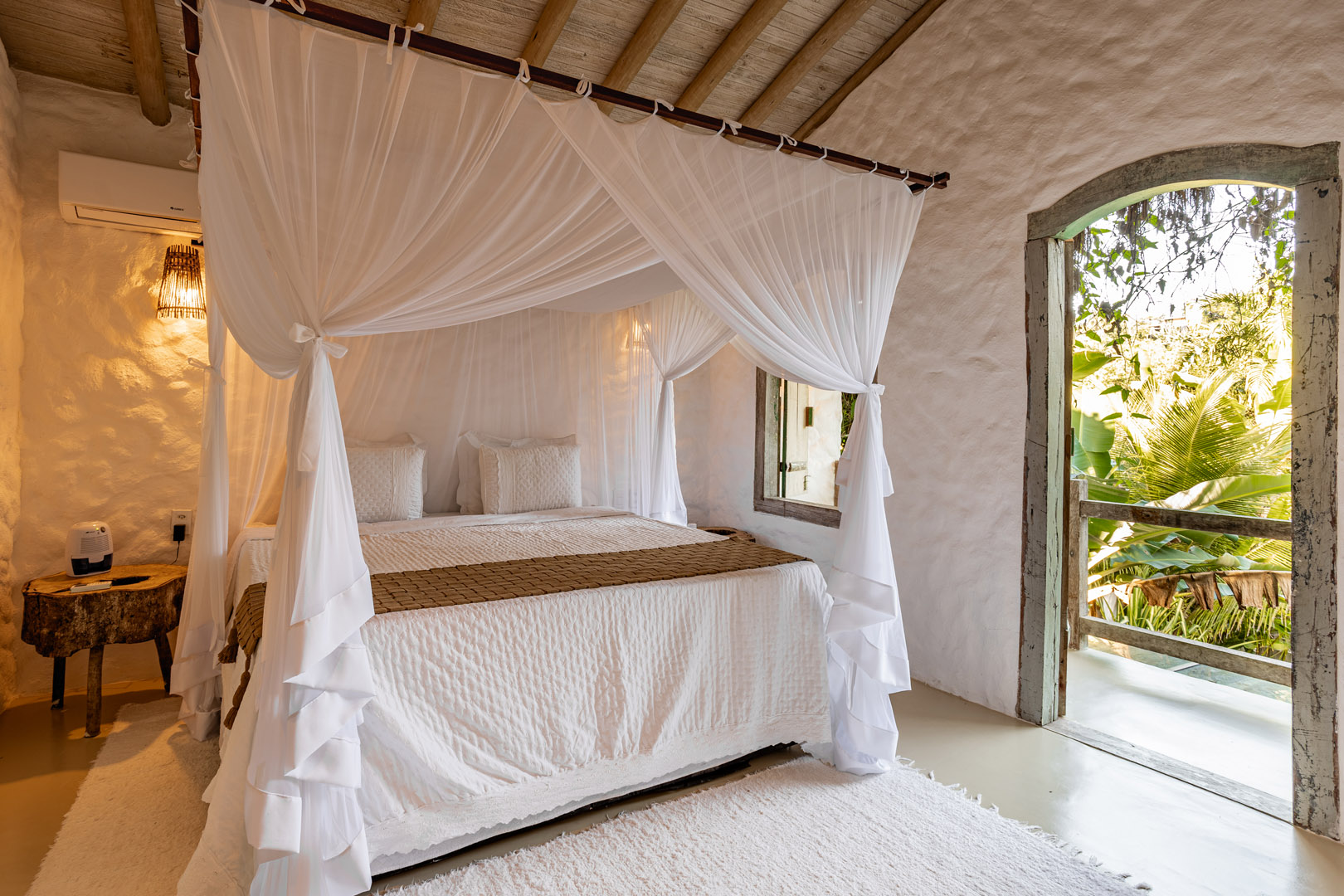Com 100m² , 3 suítes king-size e mosquiteiros dossel, piscina-jacuzzi privativa no terraço com vista para jardim tropical. Arquitetura baiana contemporânea com áreas fluidas e integradas. Serviços completos de hotel boutique para até 6 pessoas.