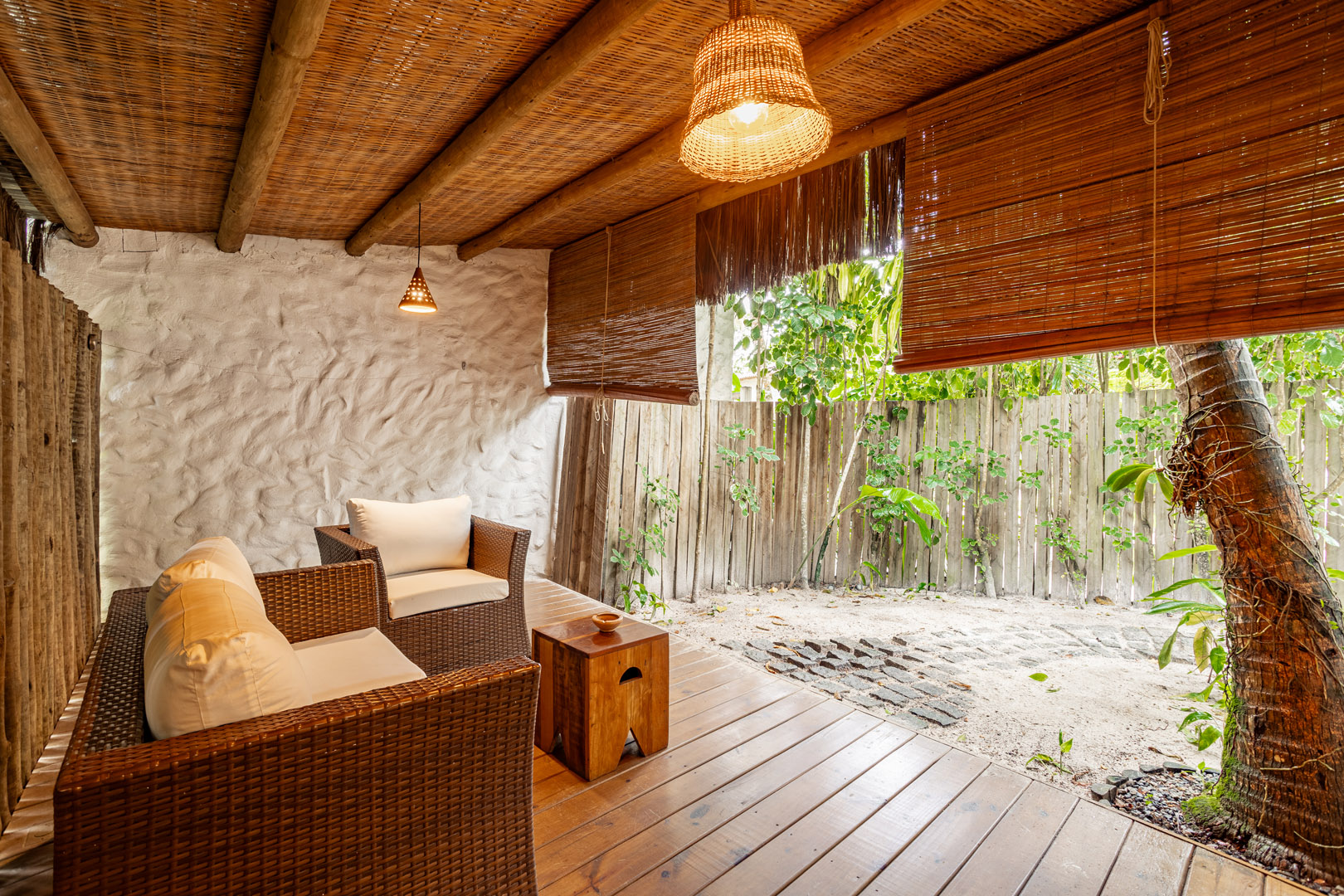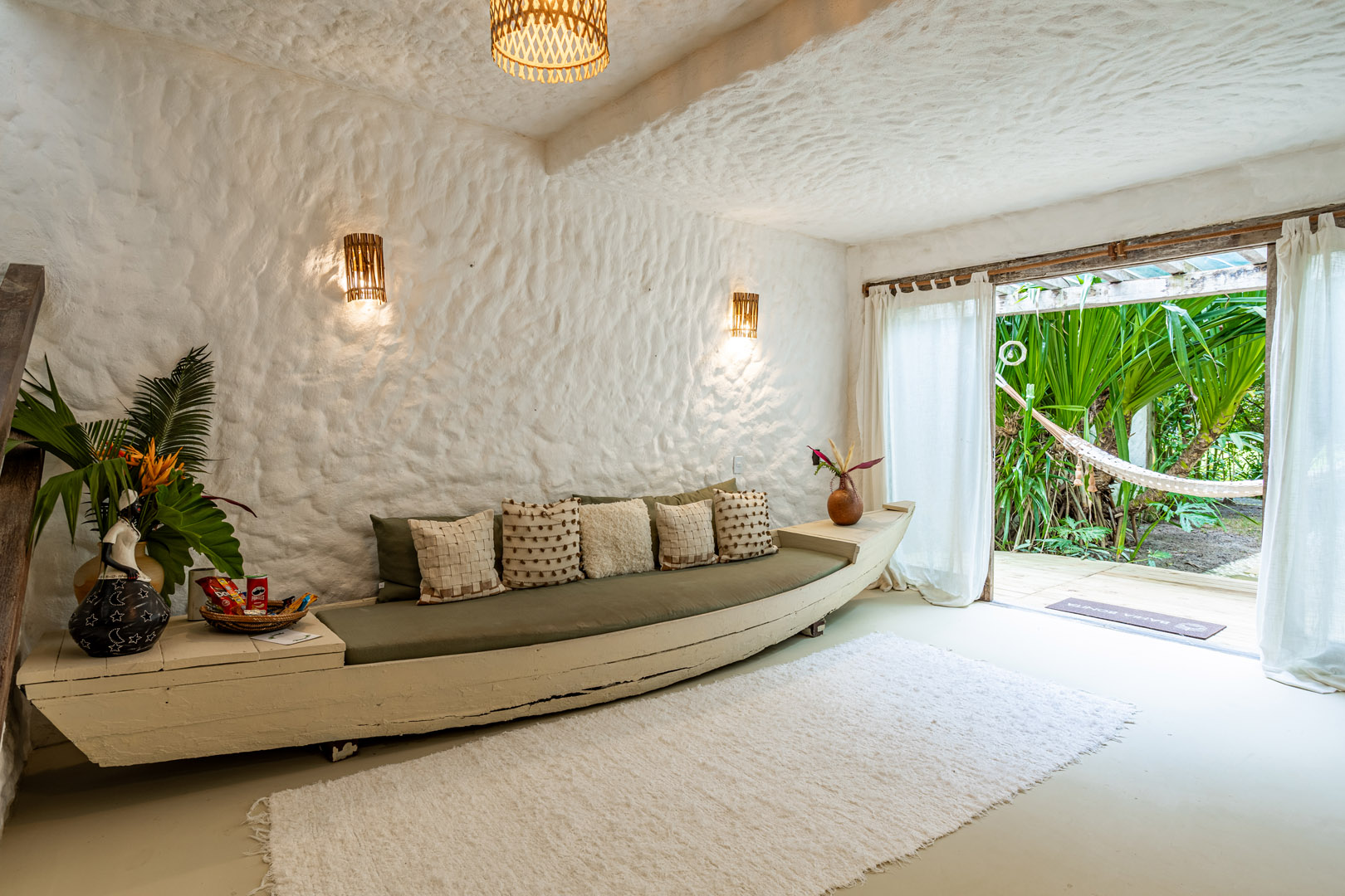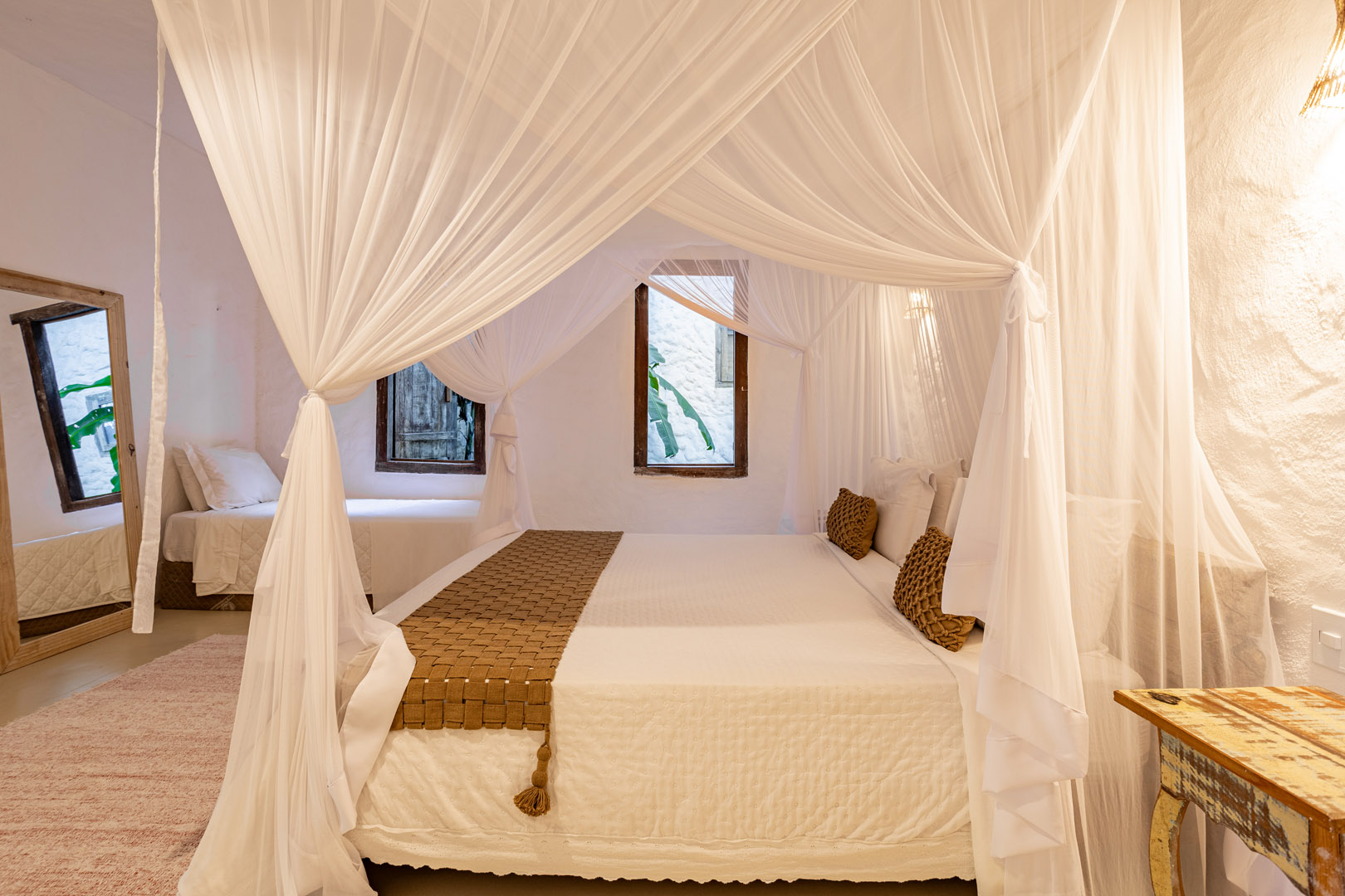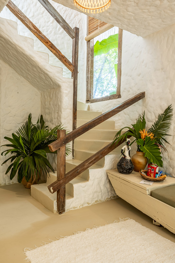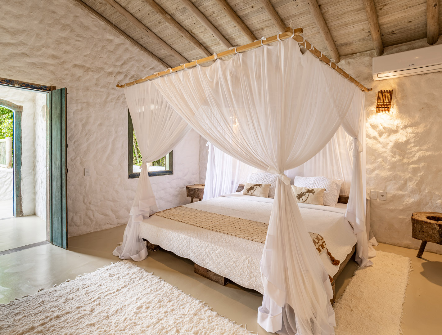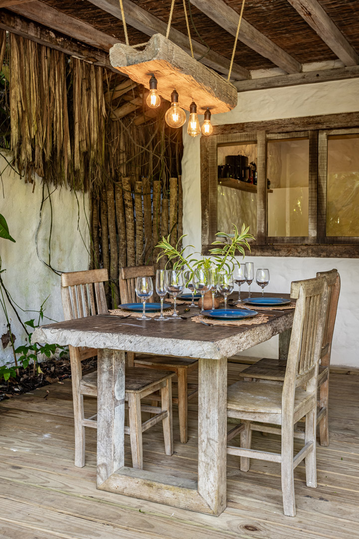 Com 100m² , 3 suítes king-size e mosquiteiros dossel, piscina-jacuzzi privativa no terraço com vista para jardim tropical. Arquitetura baiana contemporânea com áreas fluidas e integradas. Serviços completos de hotel boutique para até 6 pessoas.