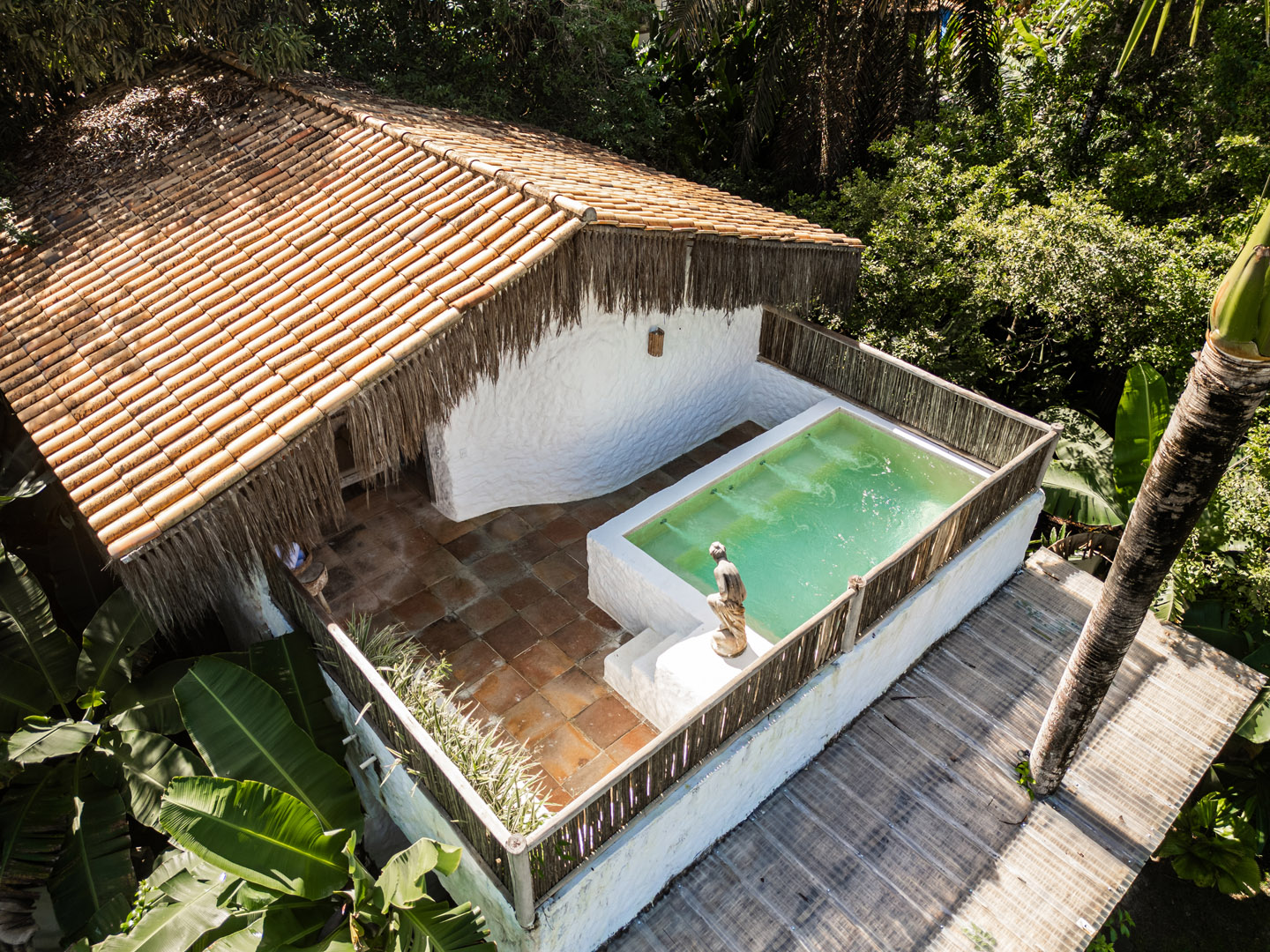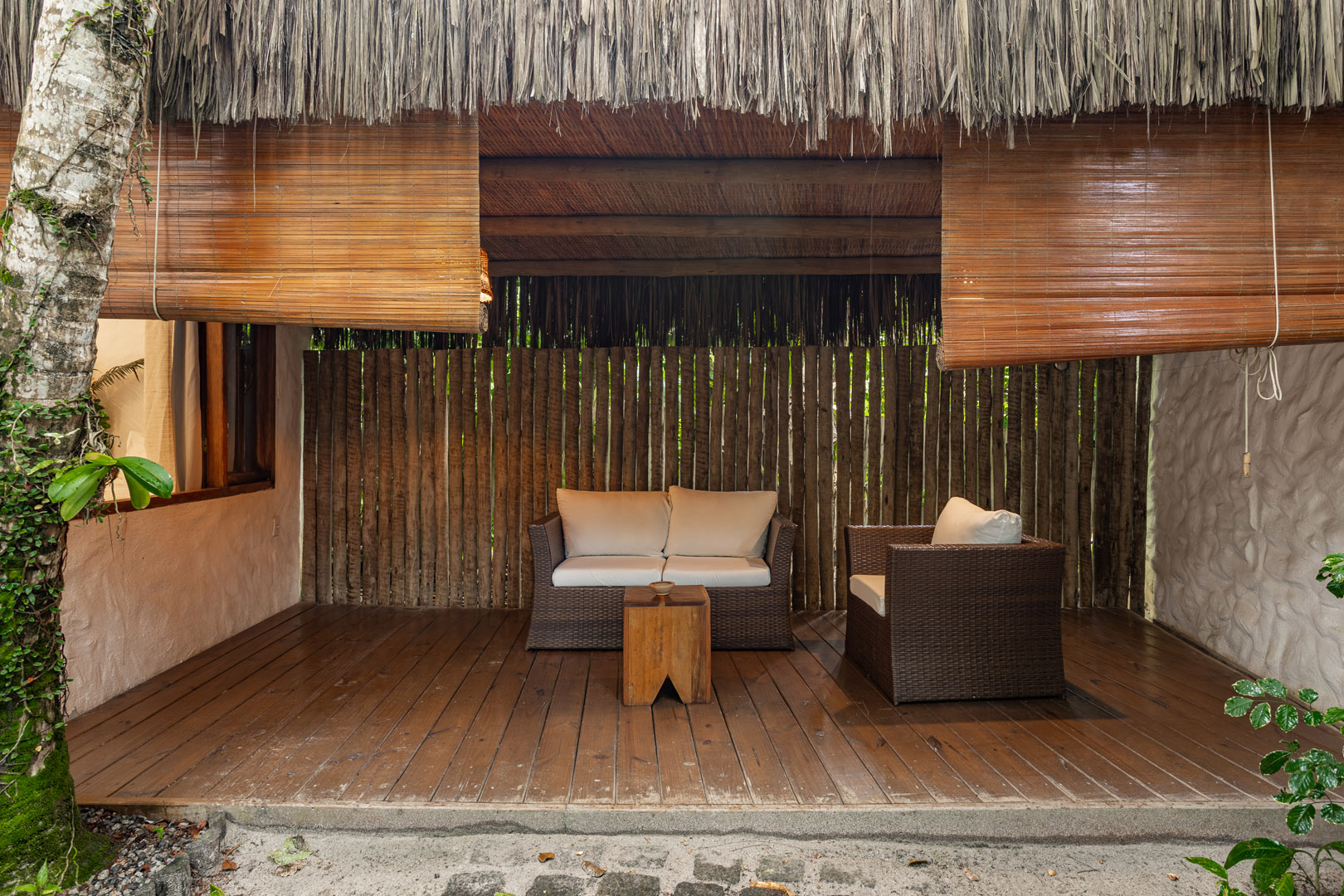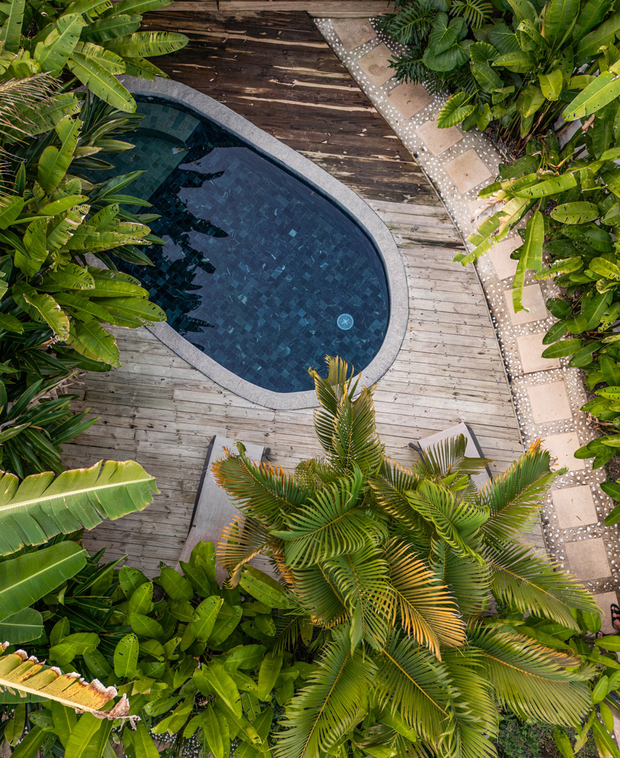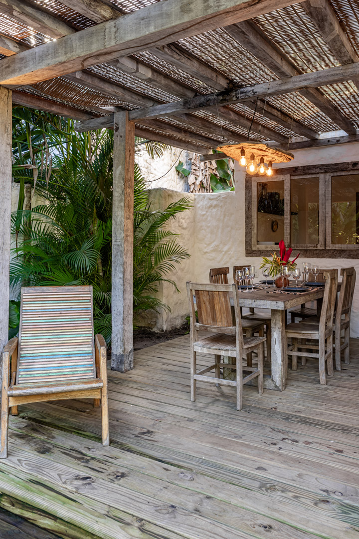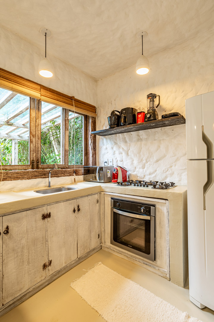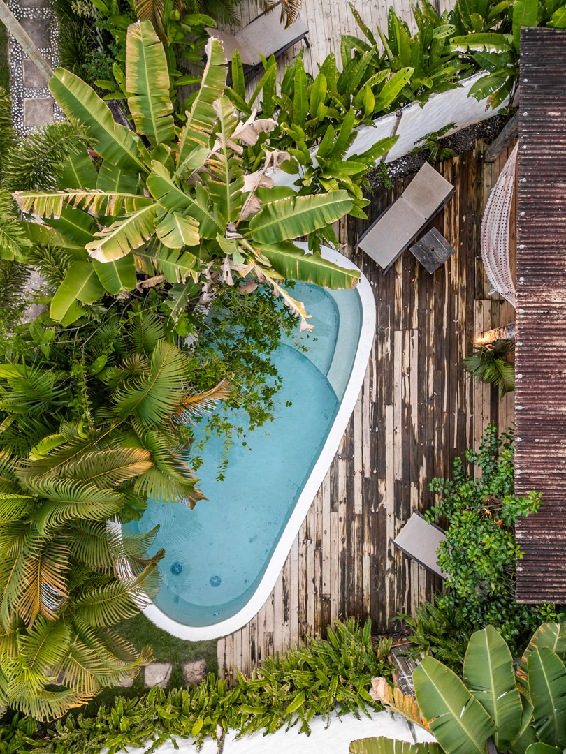 Com 100m² , 3 suítes king-size e mosquiteiros dossel, piscina-jacuzzi privativa no terraço com vista para jardim tropical. Arquitetura baiana contemporânea com áreas fluidas e integradas. Serviços completos de hotel boutique para até 6 pessoas.