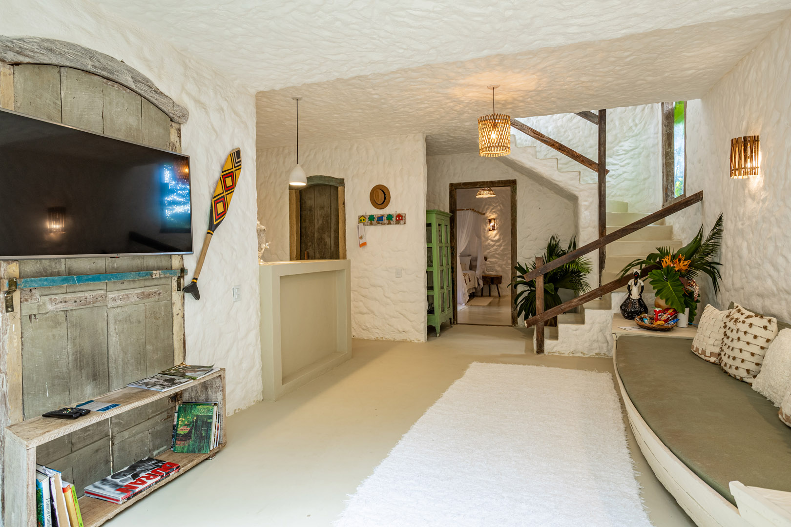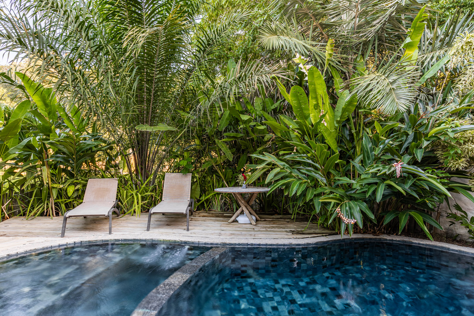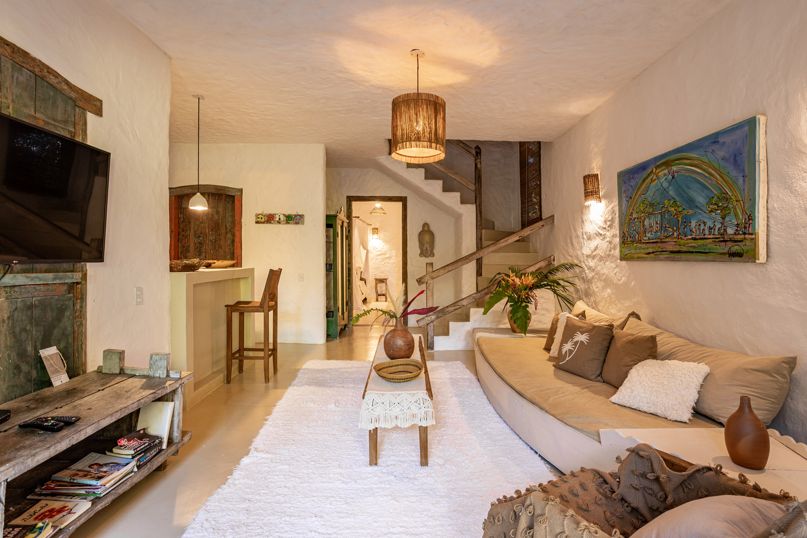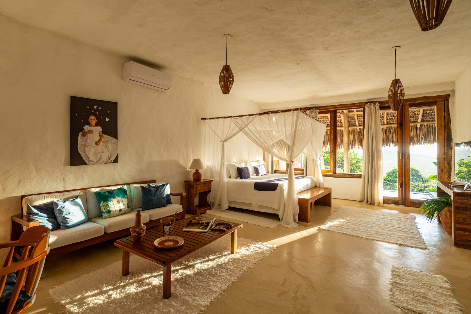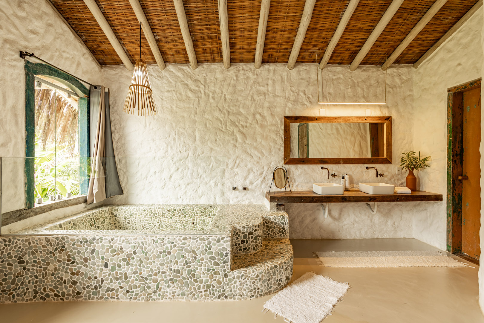 Com 100m² , 3 suítes king-size e mosquiteiros dossel, piscina-jacuzzi privativa no terraço com vista para jardim tropical. Arquitetura baiana contemporânea com áreas fluidas e integradas. Serviços completos de hotel boutique para até 6 pessoas.