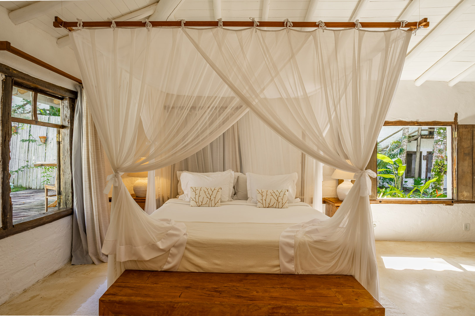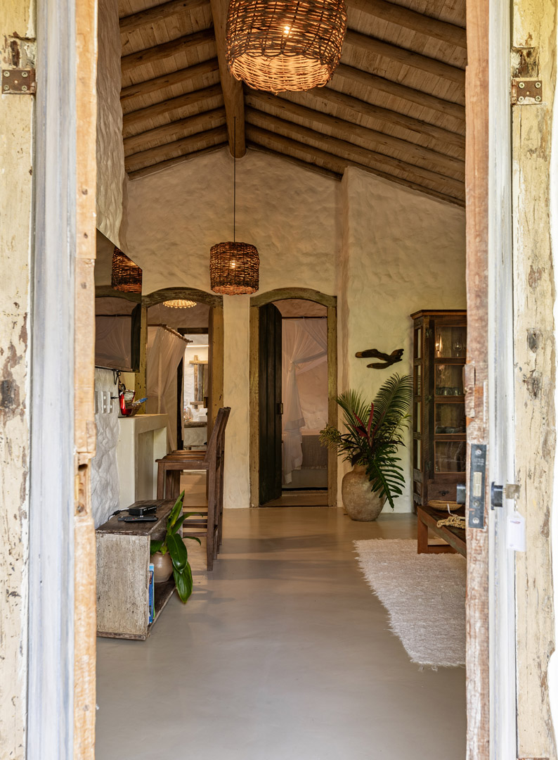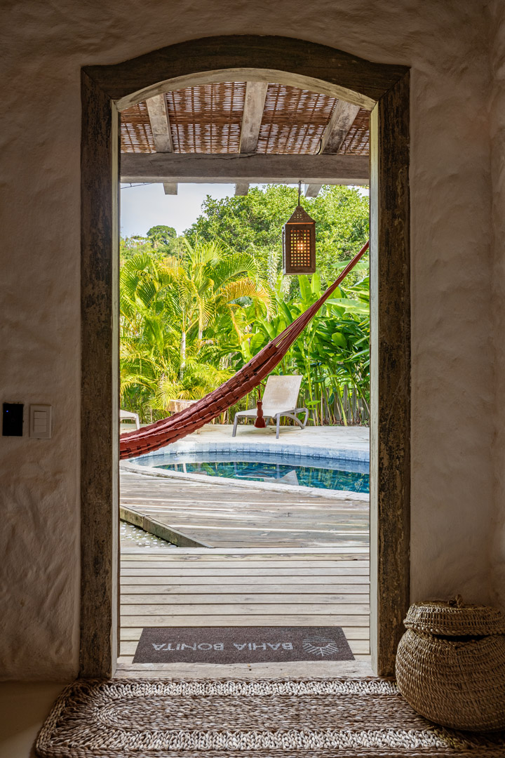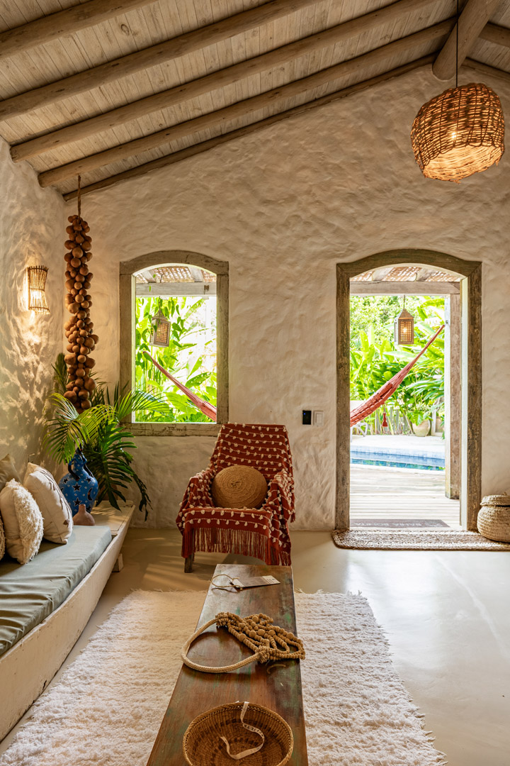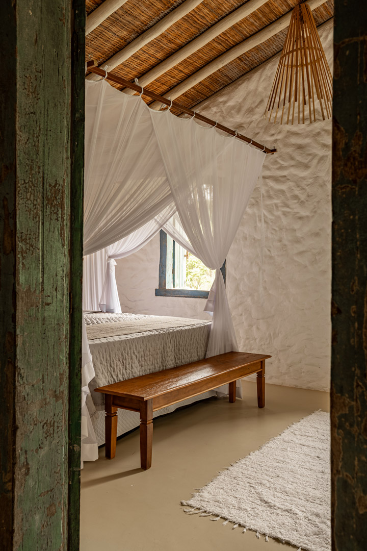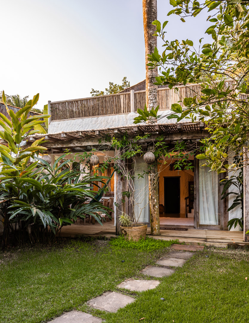 Com 100m² com 3 suítes king-size e mosquiteiros dossel, piscina privativa cercada por jardim tropical. Arquitetura baiana com espaços amplos e integrados à natureza. Serviços completos de hotel boutique para até 6 pessoas em Trancoso.