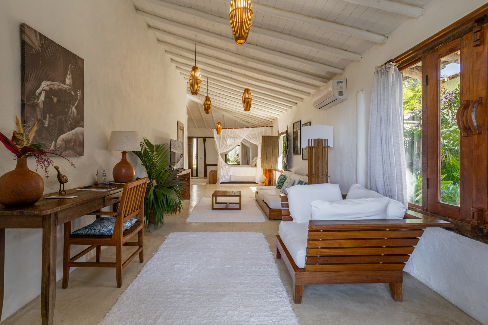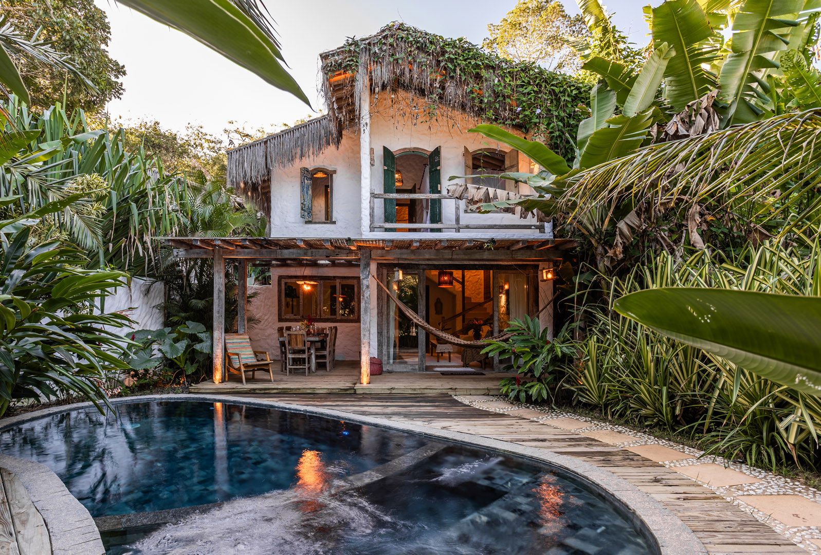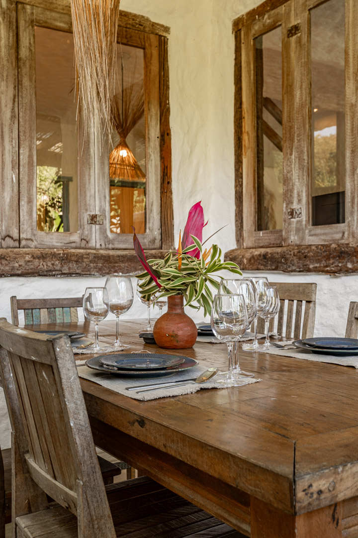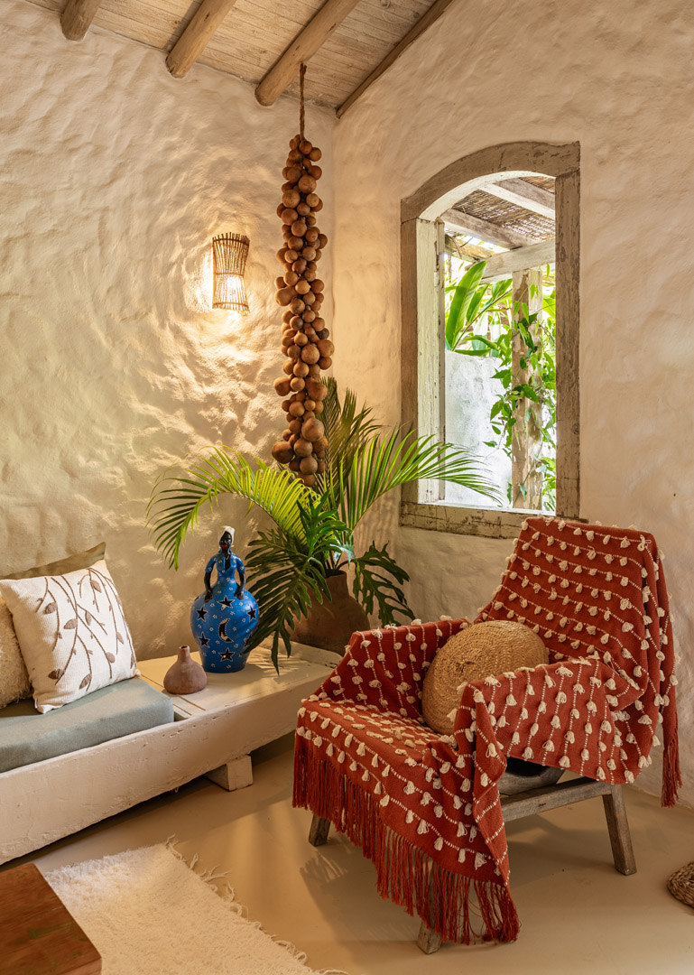 Com 100m² com 3 suítes king-size e mosquiteiros dossel, piscina privativa cercada por jardim tropical. Arquitetura baiana com espaços amplos e integrados à natureza. Serviços completos de hotel boutique para até 6 pessoas em Trancoso.