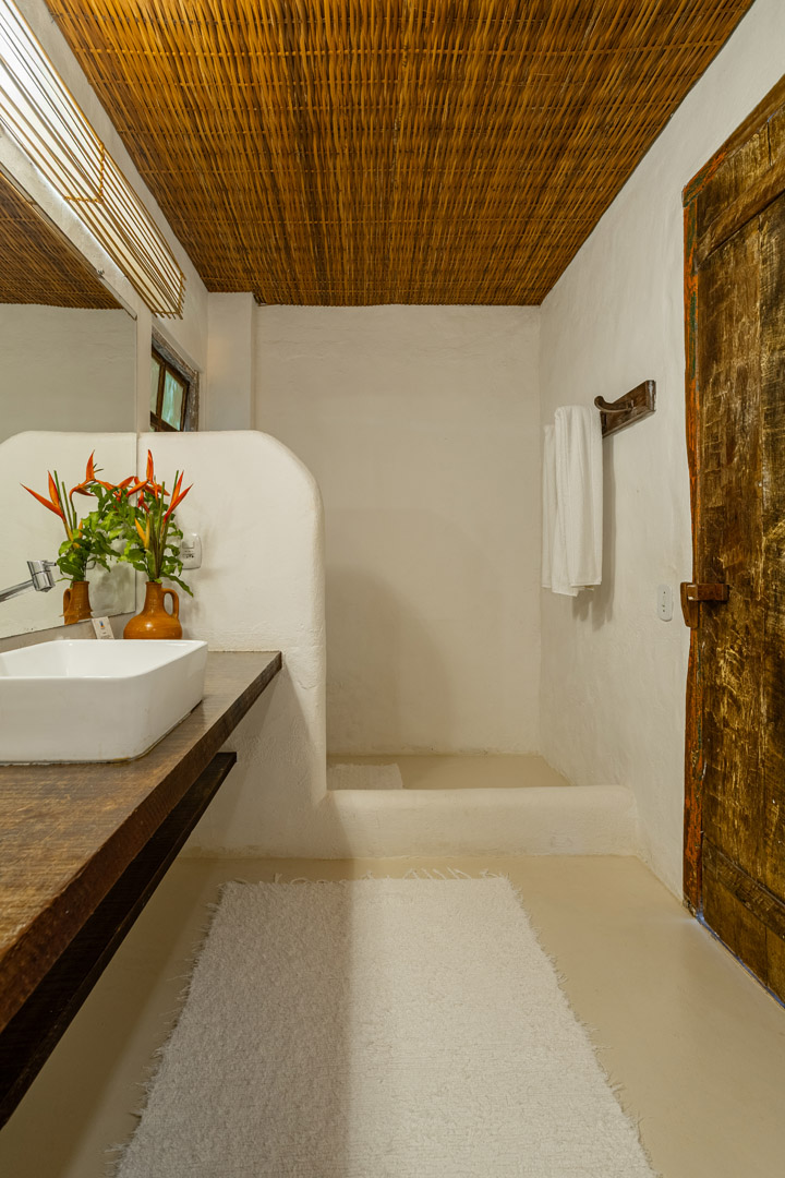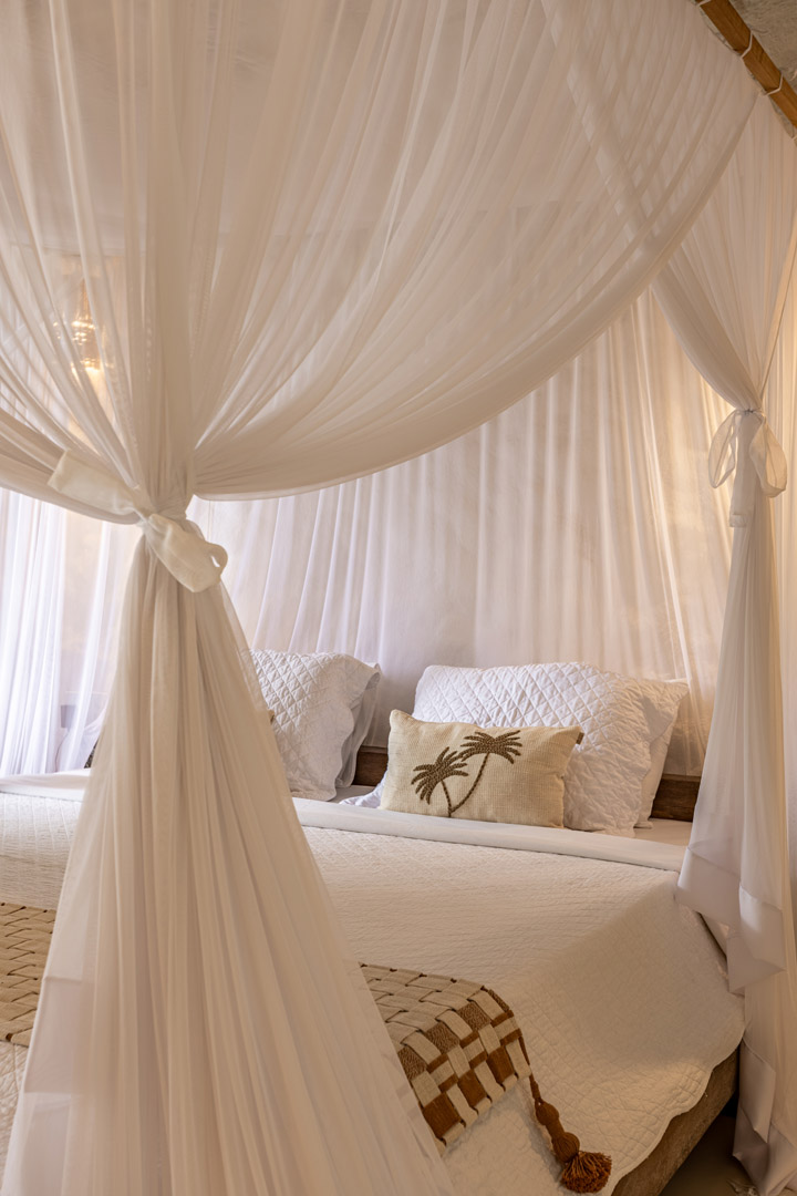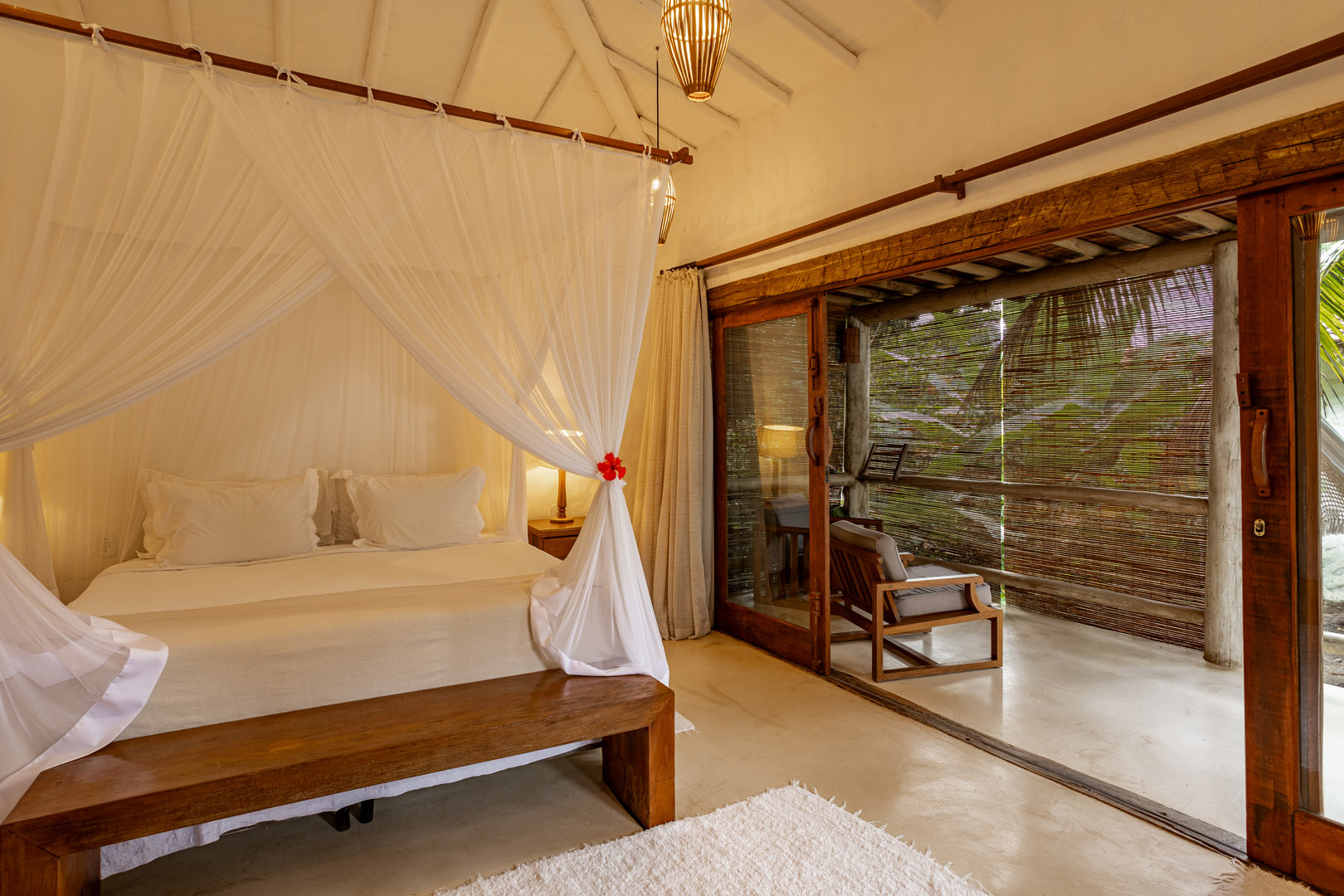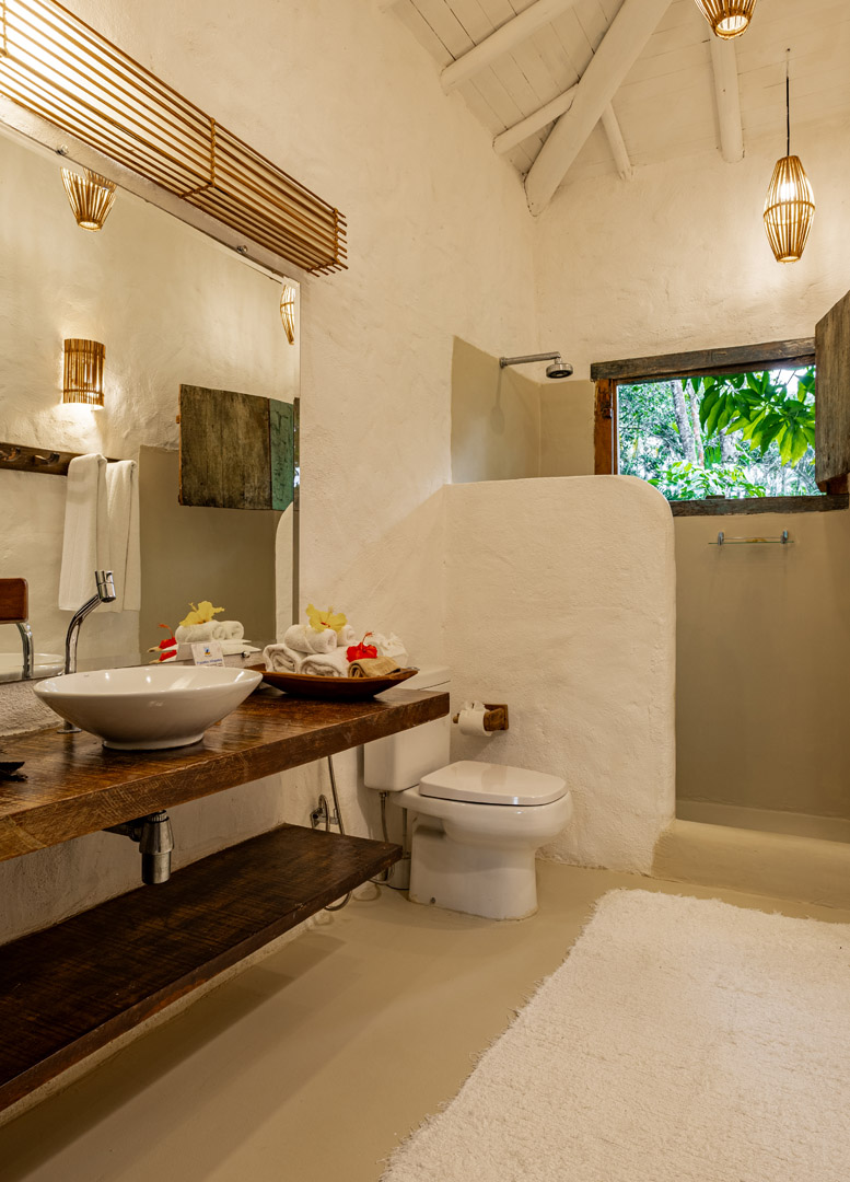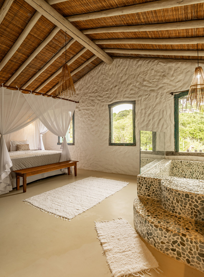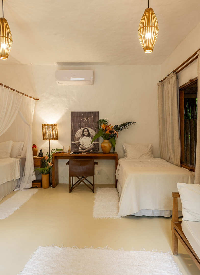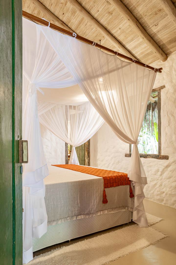 Suíte de 60m² com cama king-size, mosquiteiro dossel e varanda privativa com rede cercada pela Mata Atlântica. Closet amplo, área de estar e banheiro com amenities premium. Luxo despretensioso em meio ao jardim tropical de Trancoso.