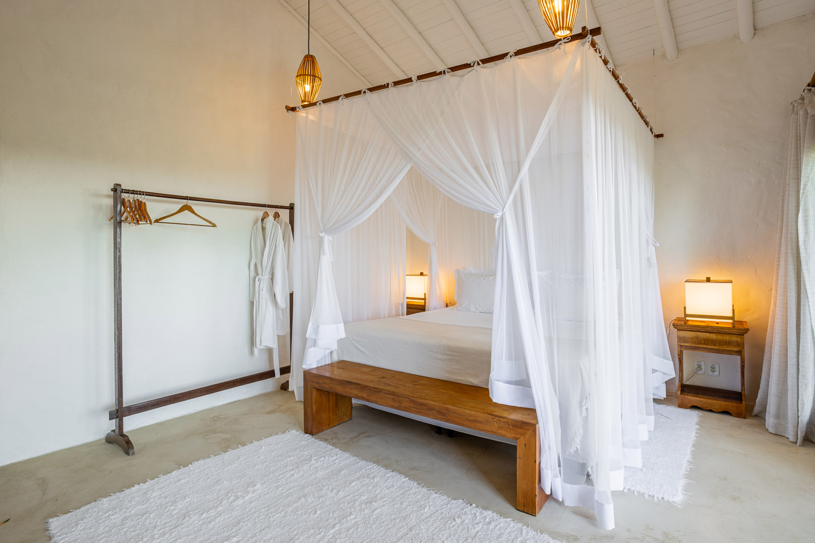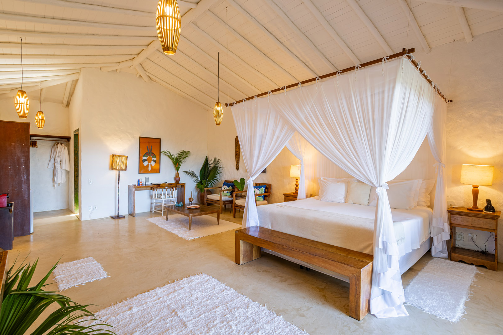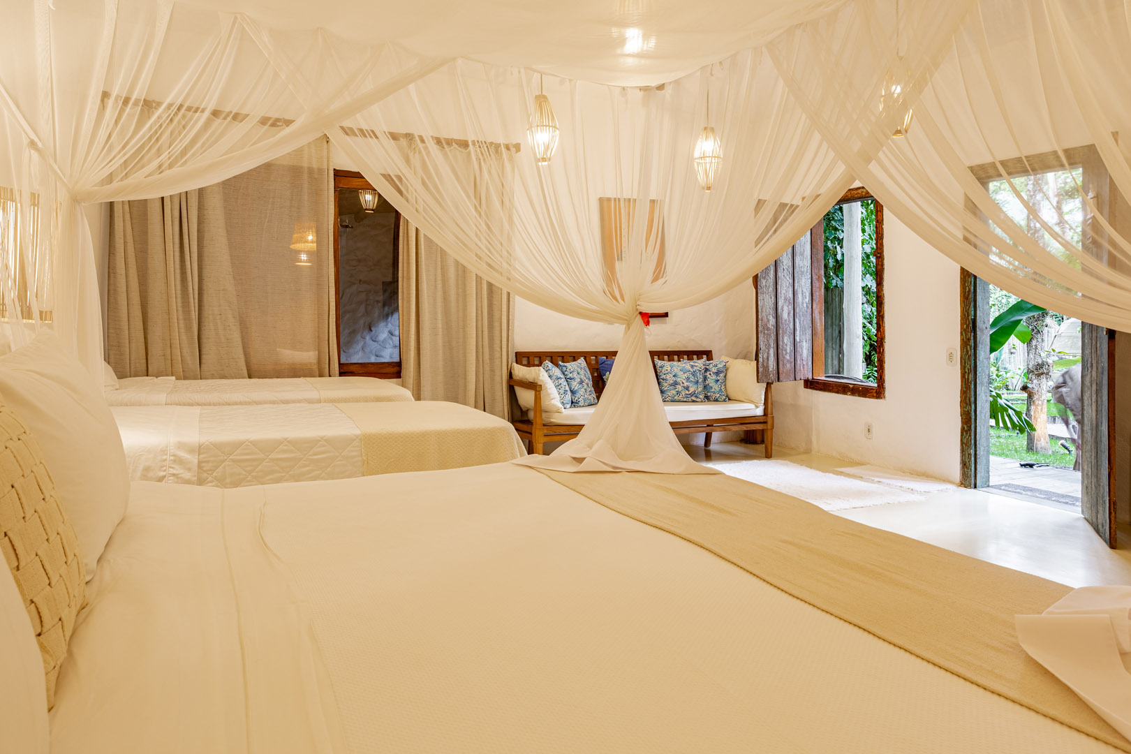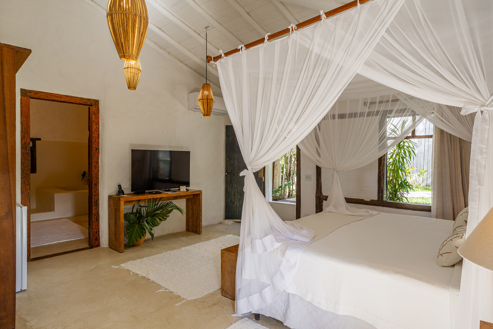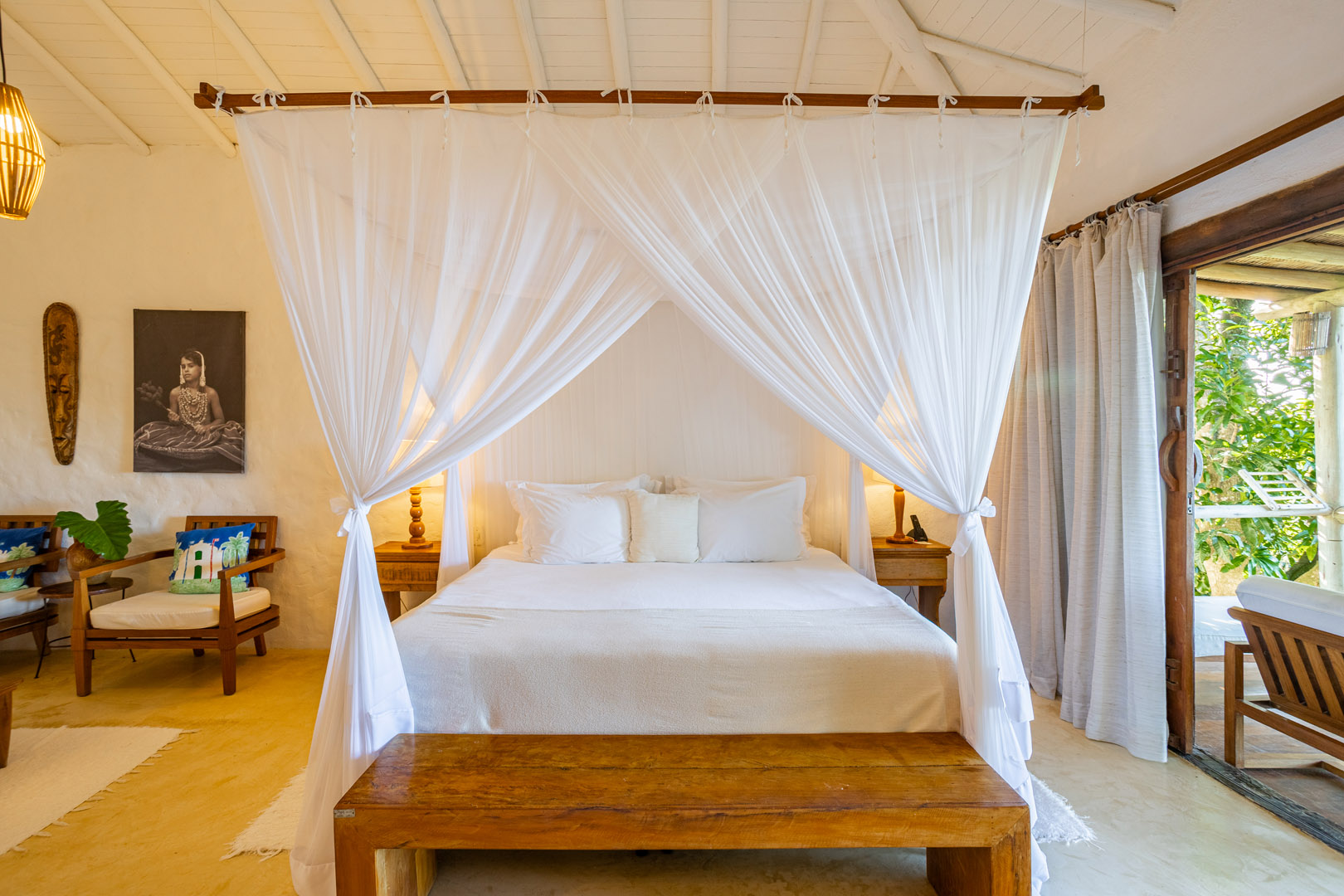 Suíte de 60m² com cama king-size, mosquiteiro dossel e varanda privativa com rede cercada pela Mata Atlântica. Closet amplo, área de estar e banheiro com amenities premium. Luxo despretensioso em meio ao jardim tropical de Trancoso.