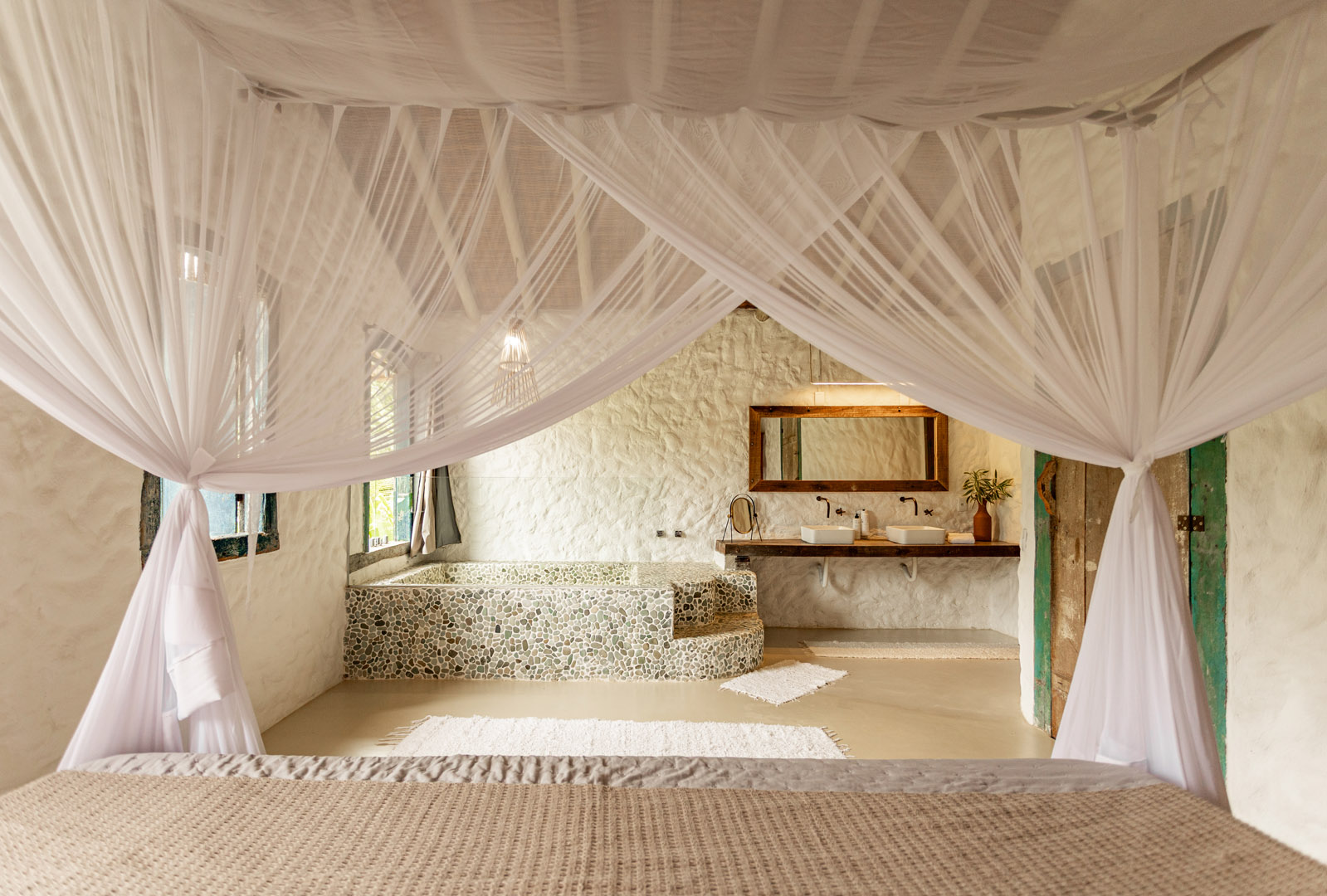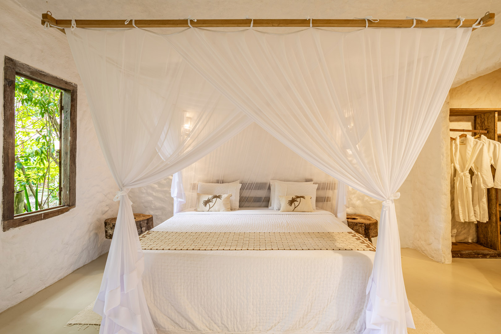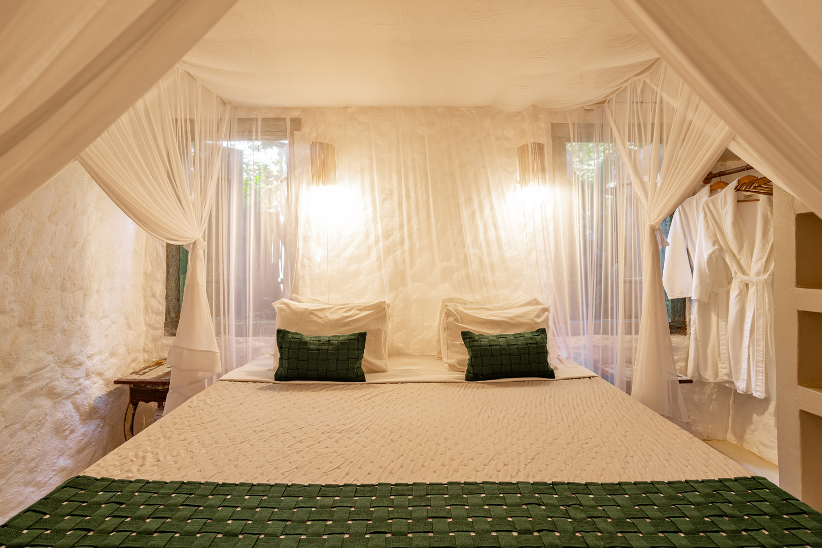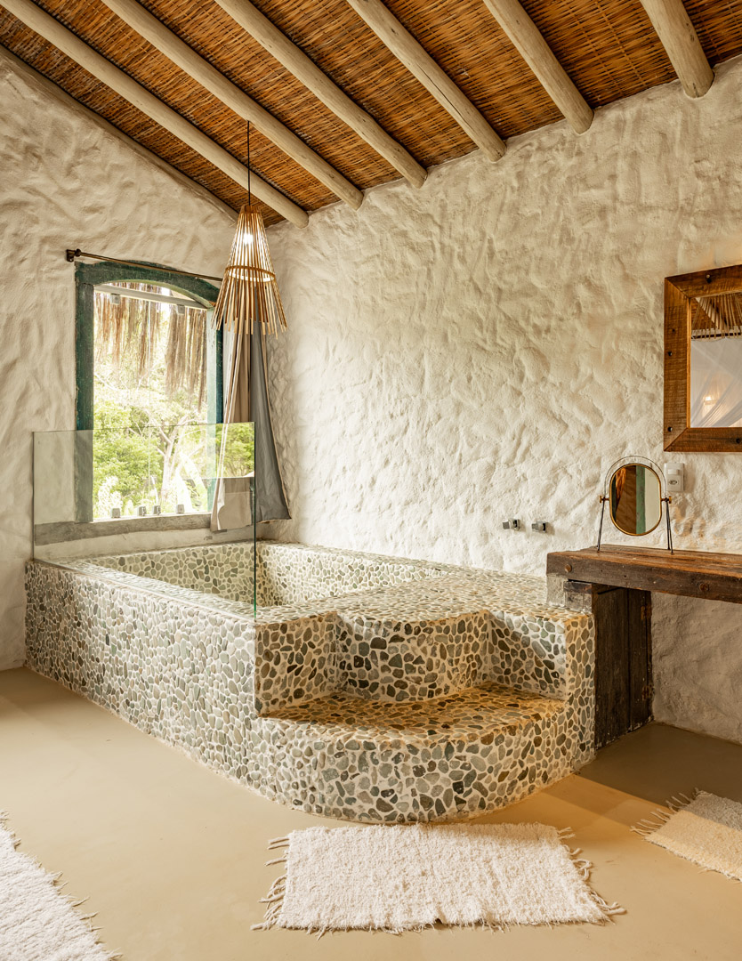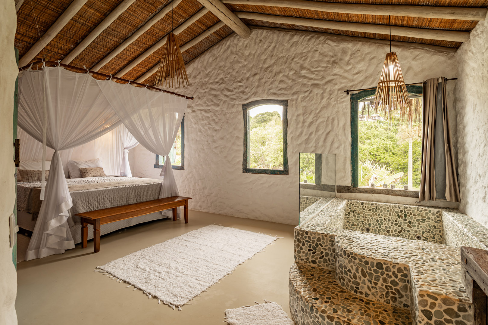 Suíte de 60m² com cama king-size, mosquiteiro dossel e varanda privativa com rede cercada pela Mata Atlântica. Closet amplo, área de estar e banheiro com amenities premium. Luxo despretensioso em meio ao jardim tropical de Trancoso.
