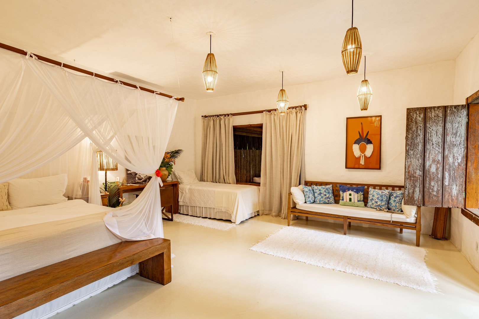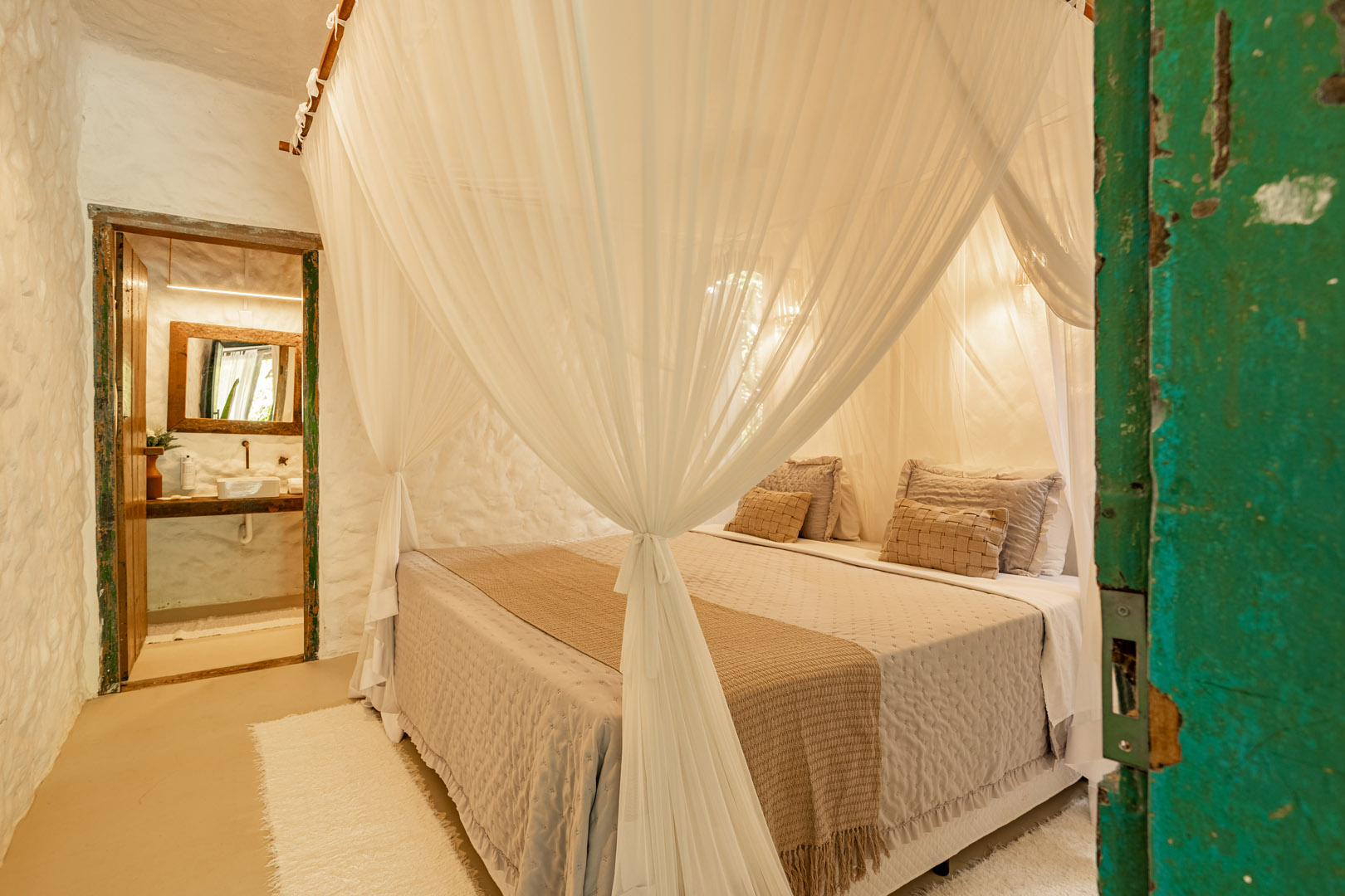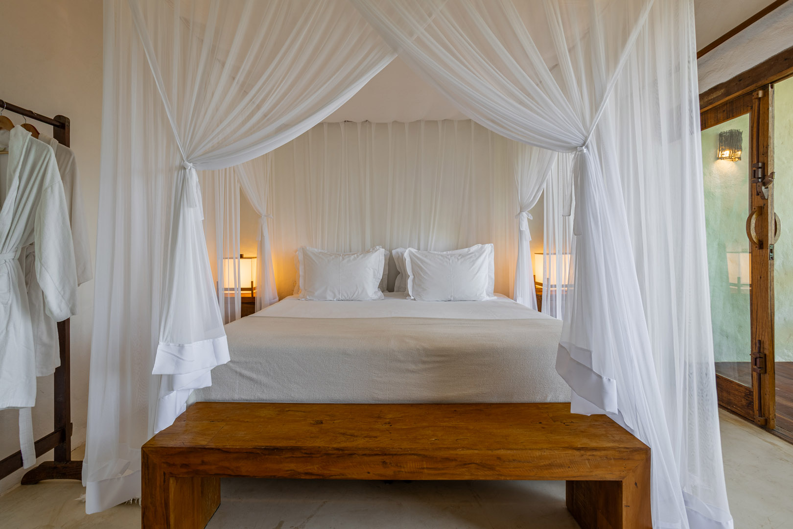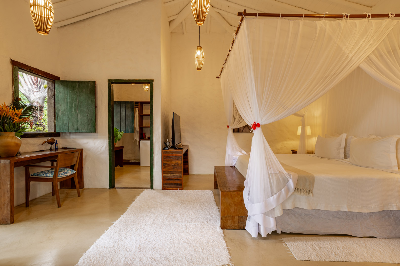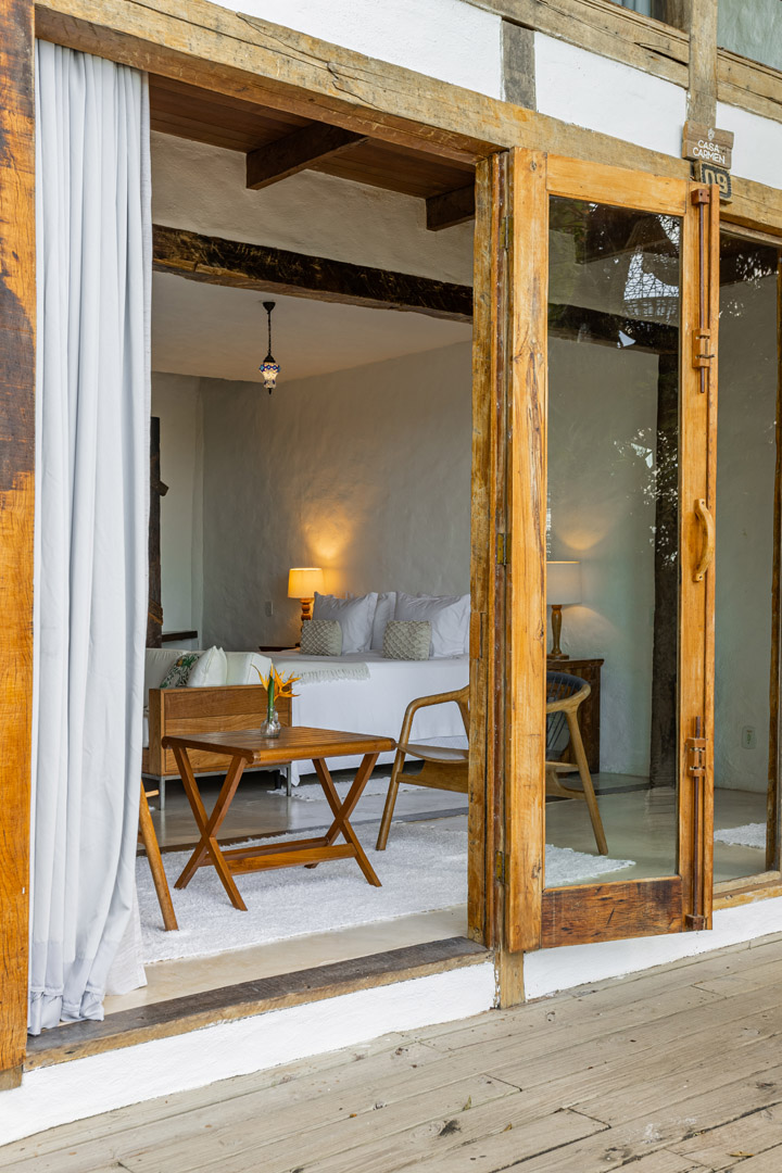 Suíte de 60m² com cama king-size, mosquiteiro dossel e varanda privativa com rede cercada pela Mata Atlântica. Closet amplo, área de estar e banheiro com amenities premium. Luxo despretensioso em meio ao jardim tropical de Trancoso.