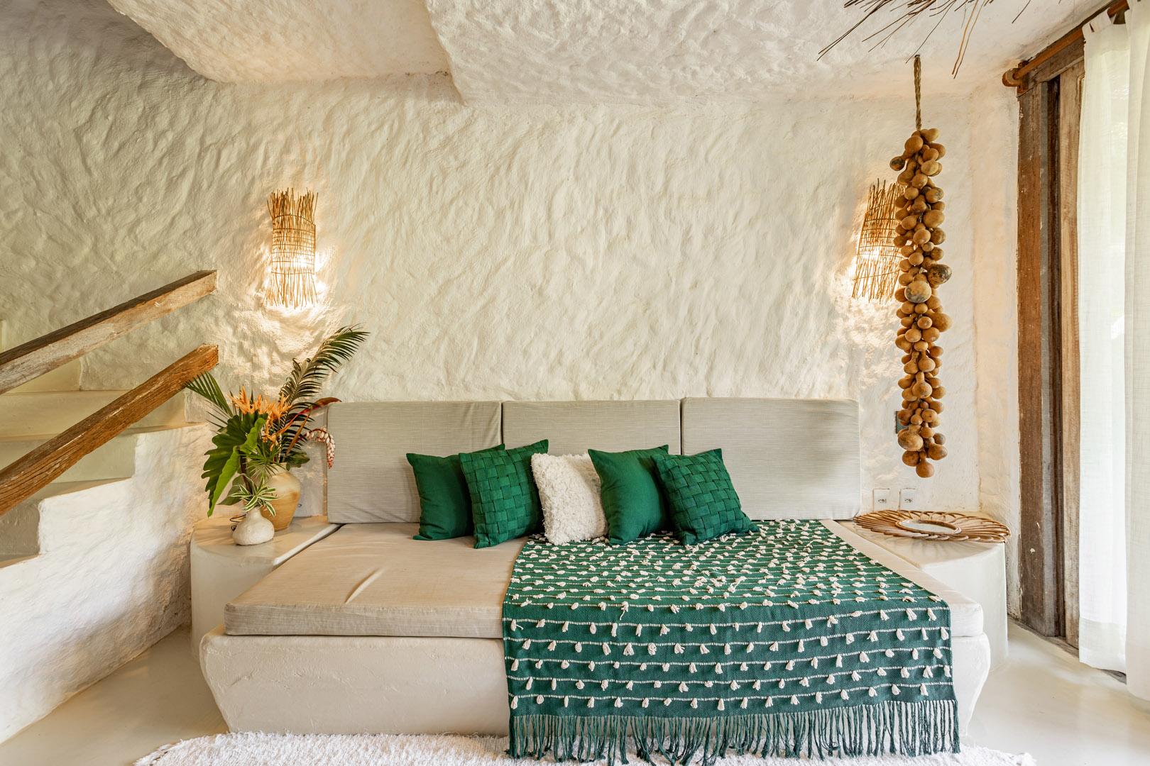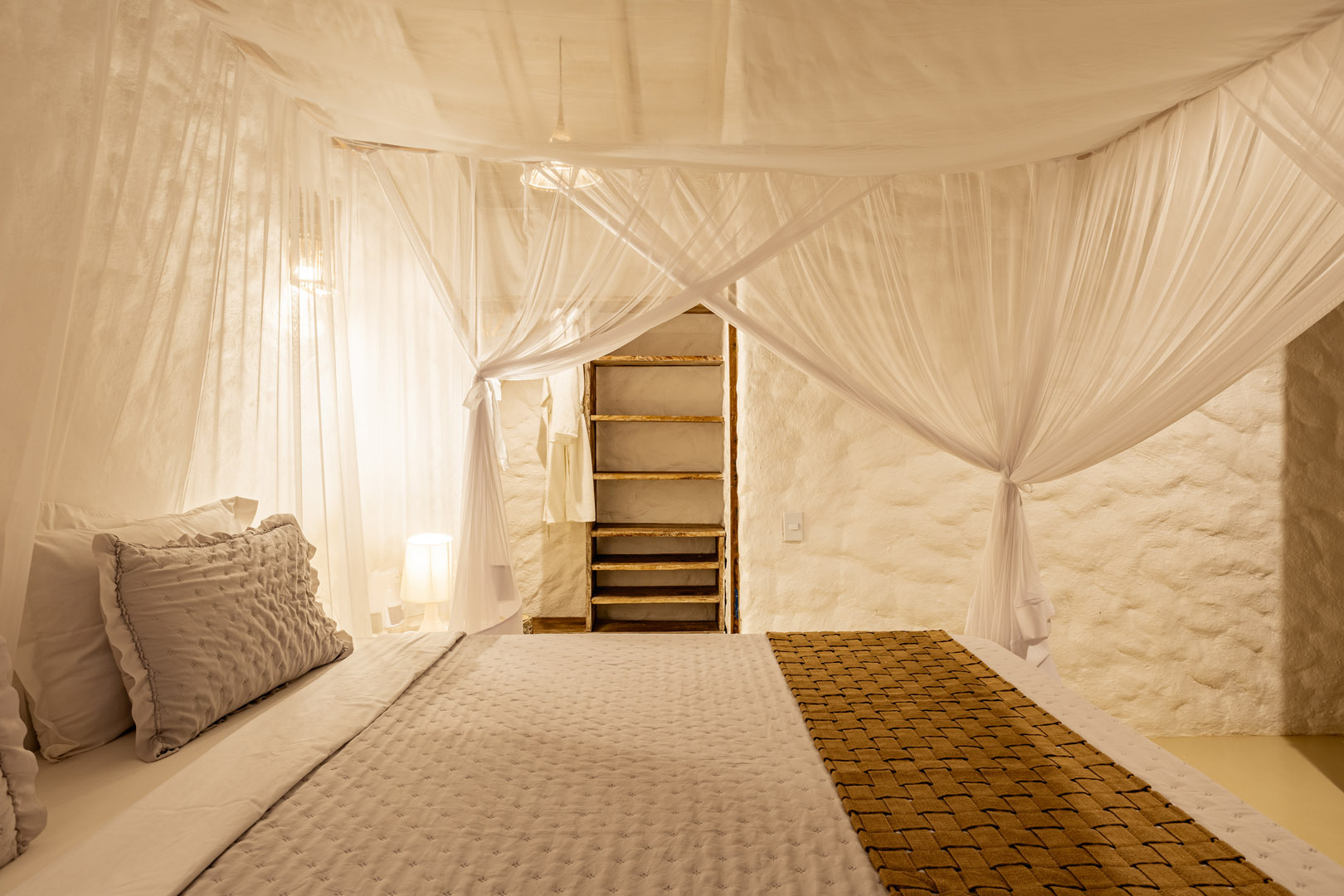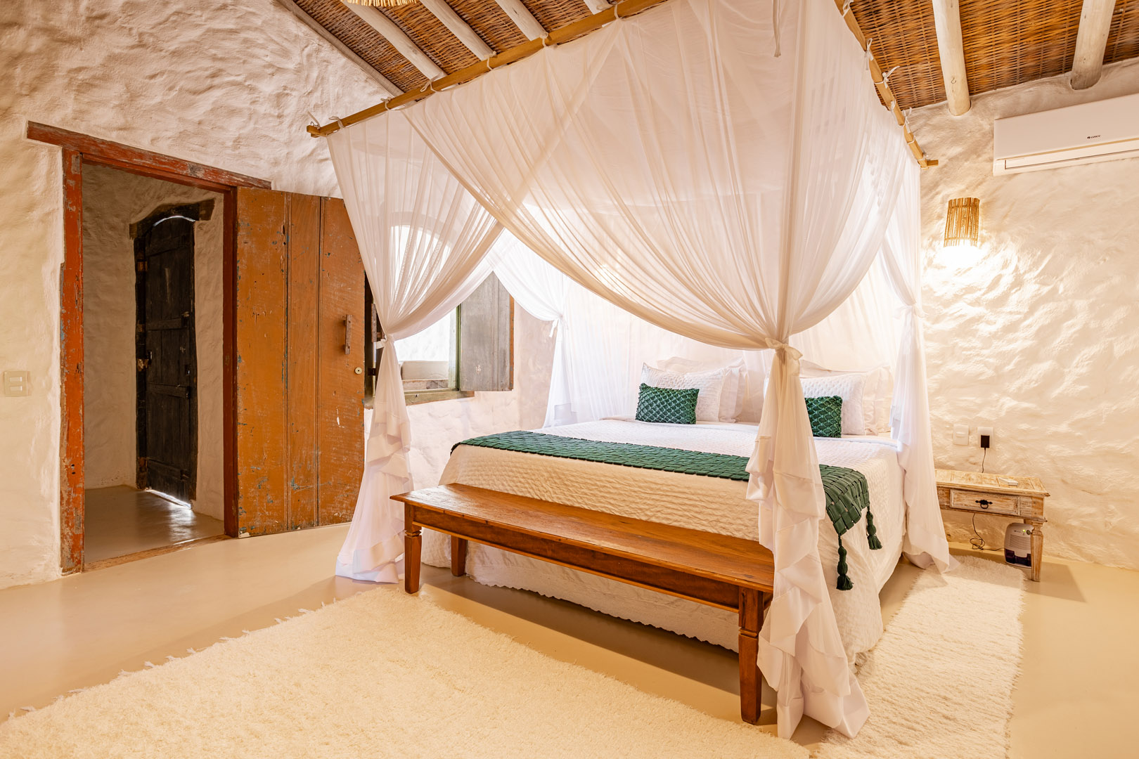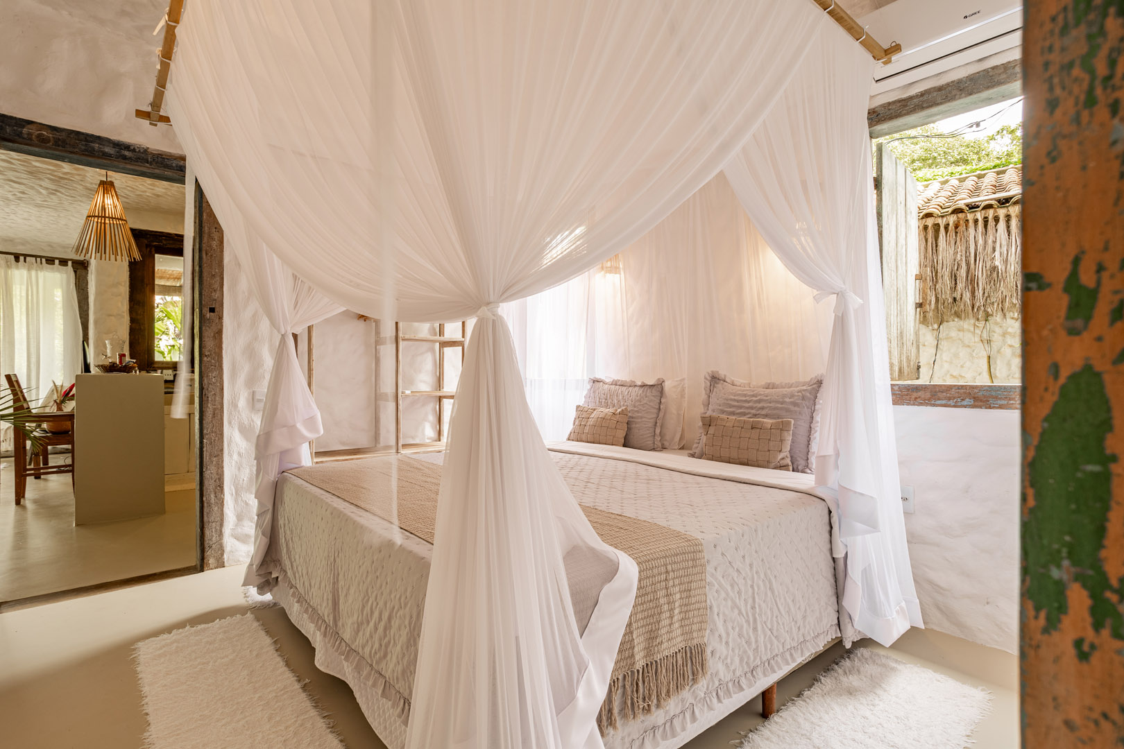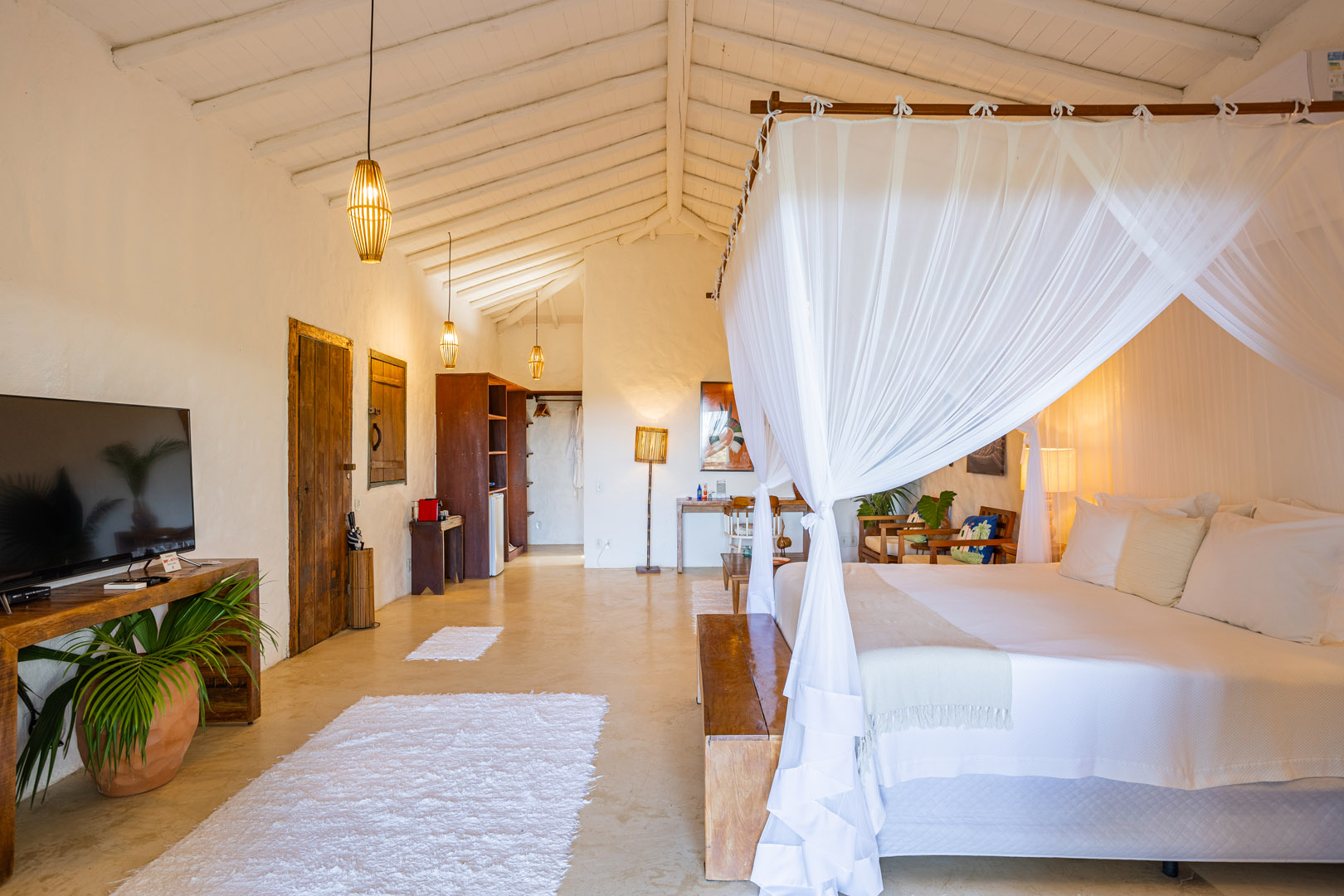 Suíte de 60m² com cama king-size, mosquiteiro dossel e varanda privativa com rede cercada pela Mata Atlântica. Closet amplo, área de estar e banheiro com amenities premium. Luxo despretensioso em meio ao jardim tropical de Trancoso.
