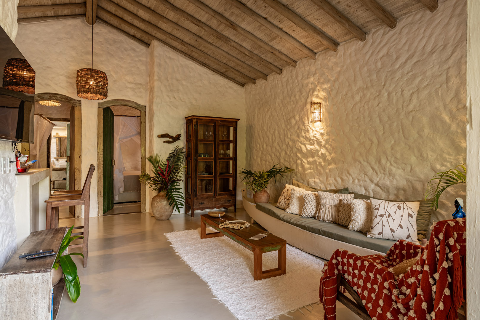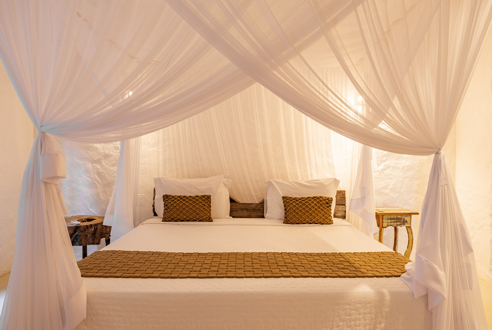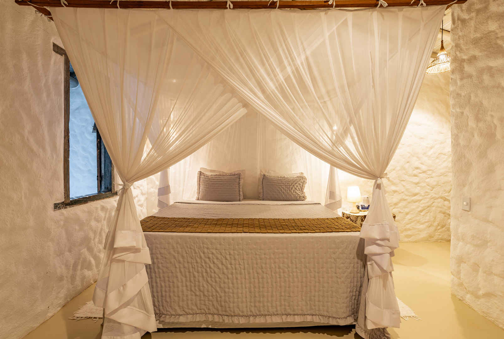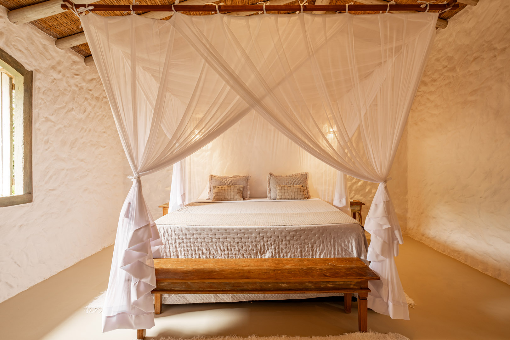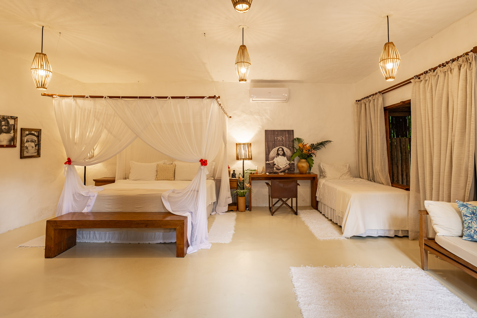 Suíte de 60m² com cama king-size, mosquiteiro dossel e varanda privativa com rede cercada pela Mata Atlântica. Closet amplo, área de estar e banheiro com amenities premium. Luxo despretensioso em meio ao jardim tropical de Trancoso.