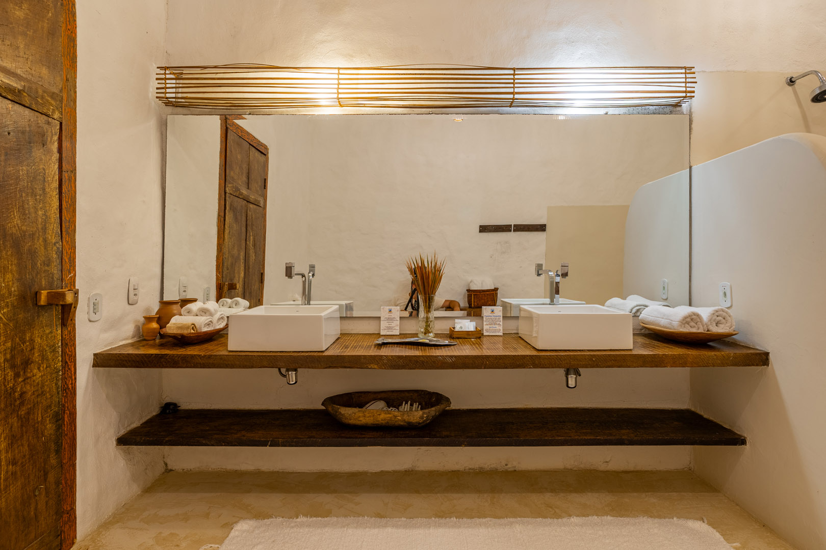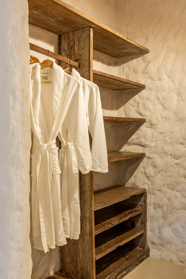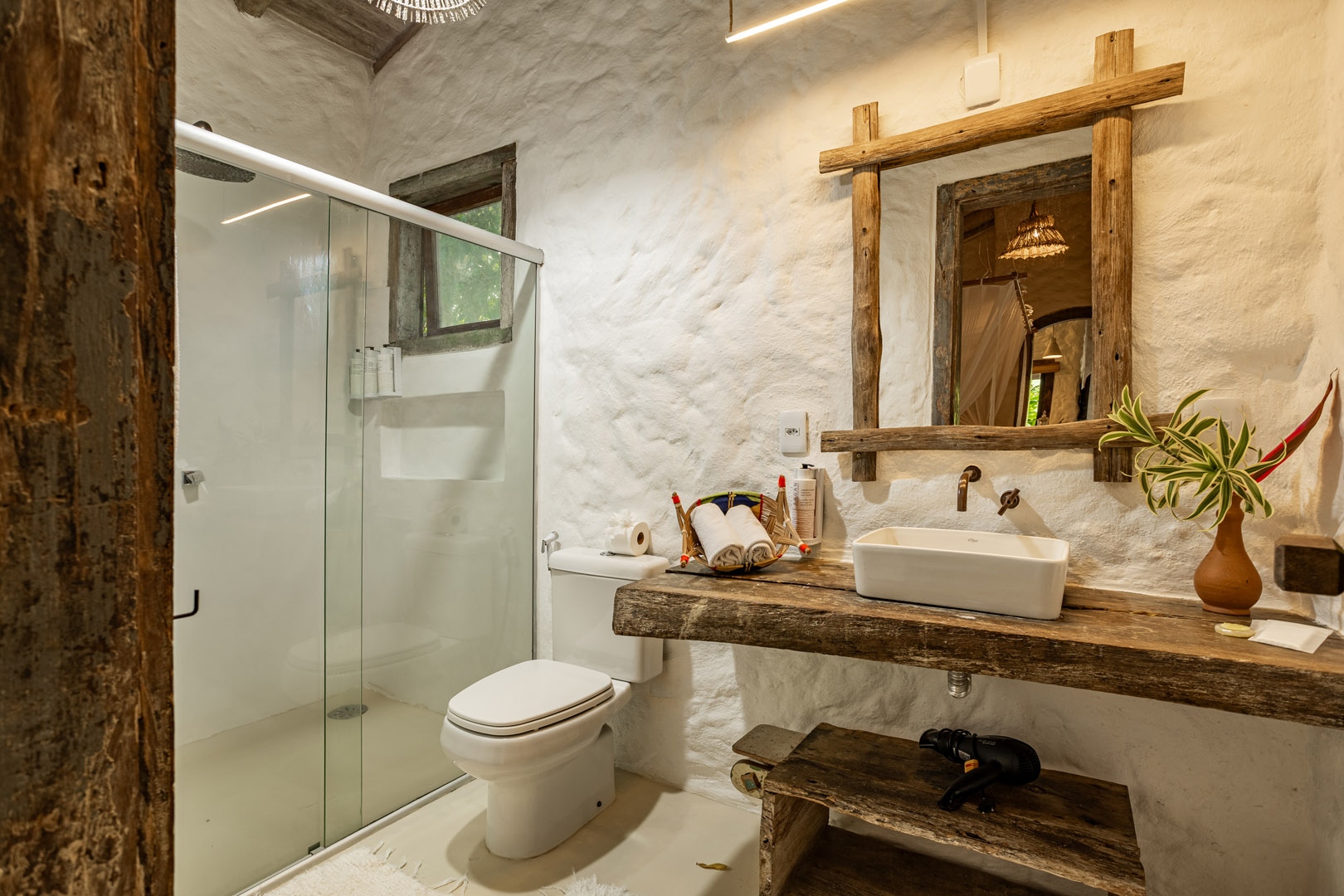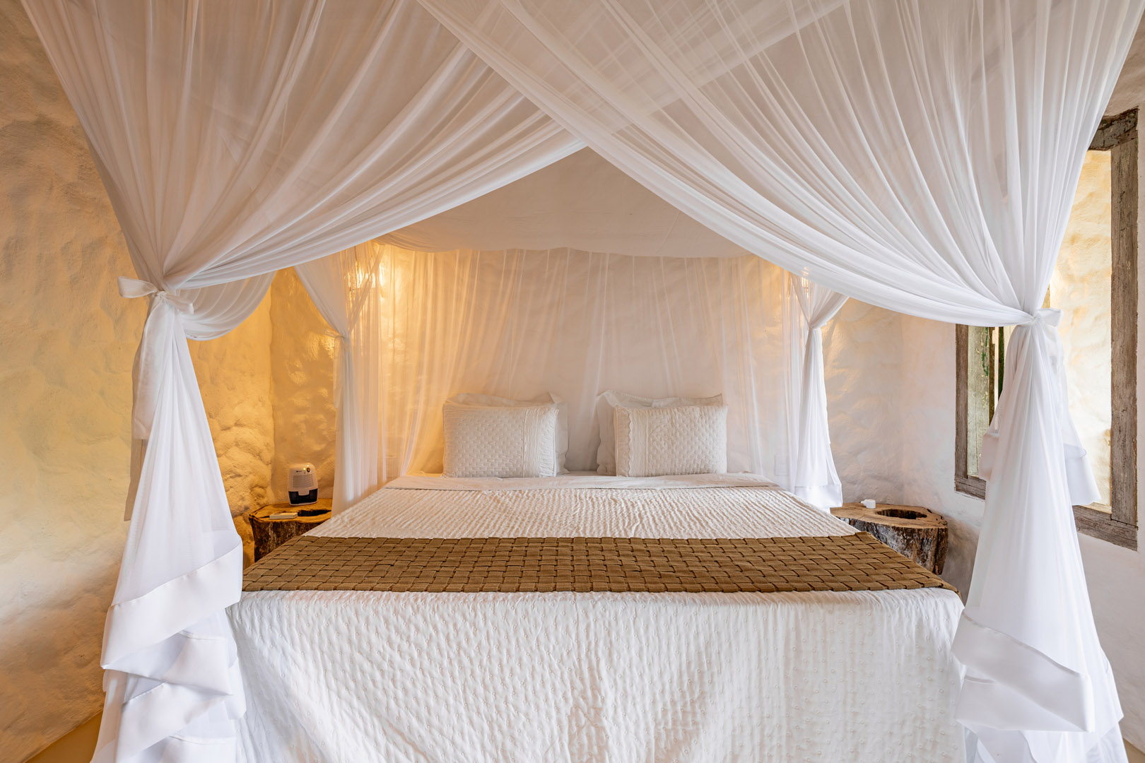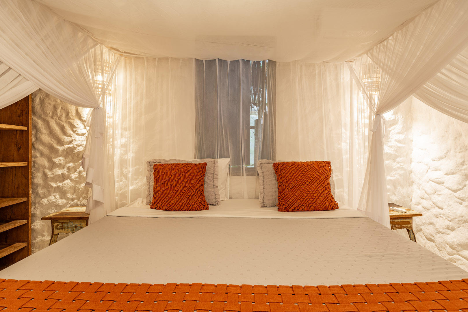 Suíte de 60m² com cama king-size, mosquiteiro dossel e varanda privativa com rede cercada pela Mata Atlântica. Closet amplo, área de estar e banheiro com amenities premium. Luxo despretensioso em meio ao jardim tropical de Trancoso.