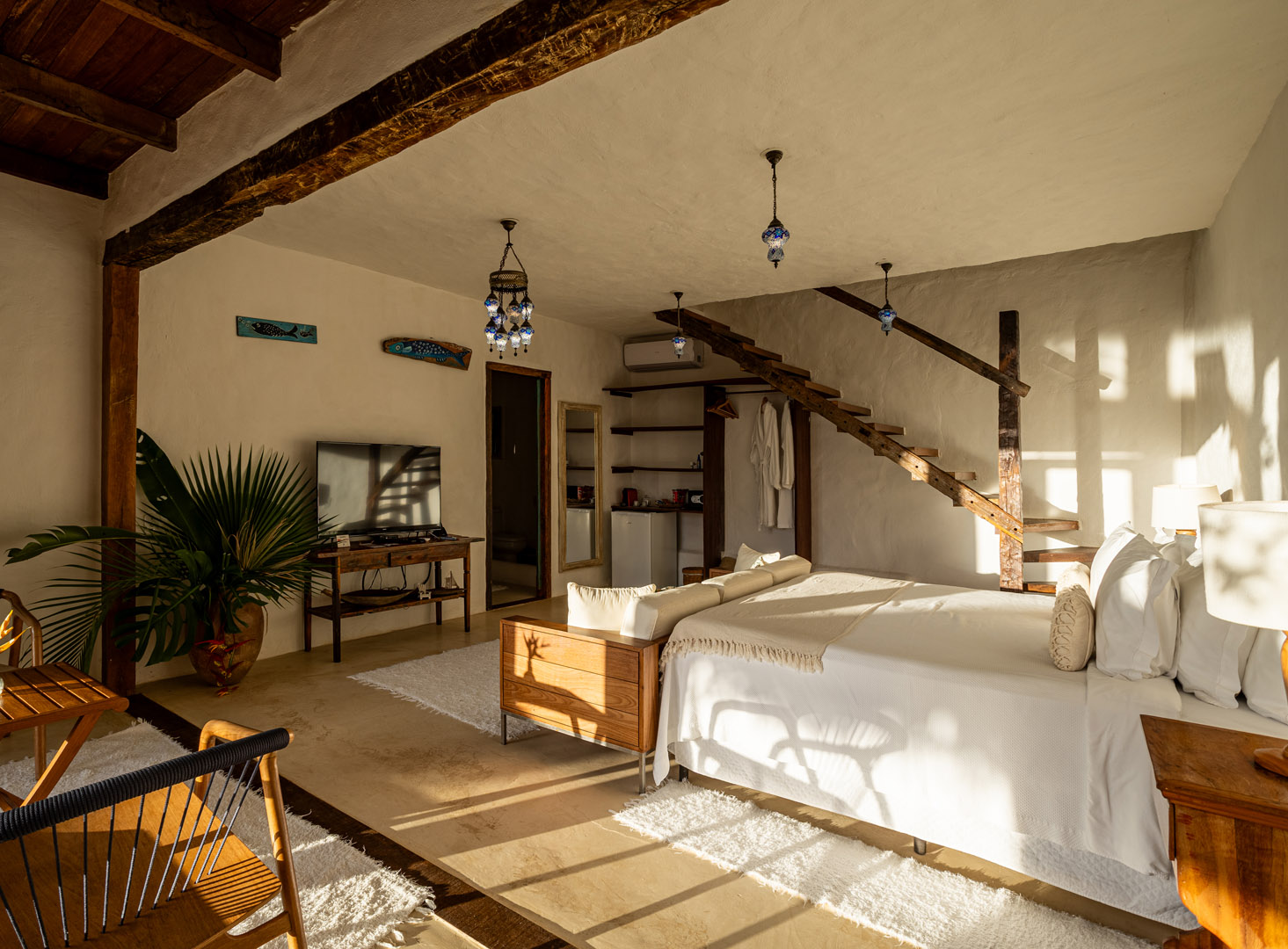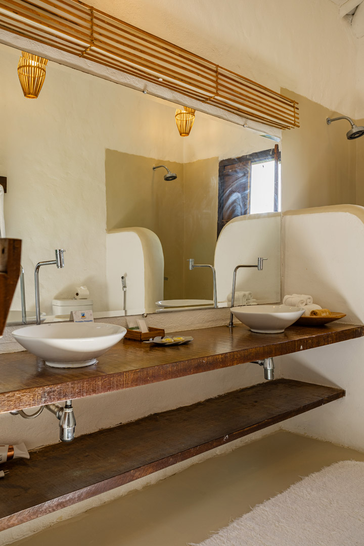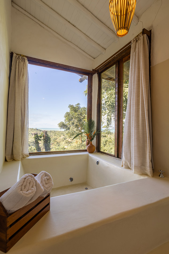 Suíte duplex de 110m² em dois andares com banheira de hidromassagem privativa e vista panorâmica do mar. Duas camas king-size com mosquiteiros, amplo terraço e sala de estar. Elegância e privacidade absoluta em Trancoso para até 4 pessoas.