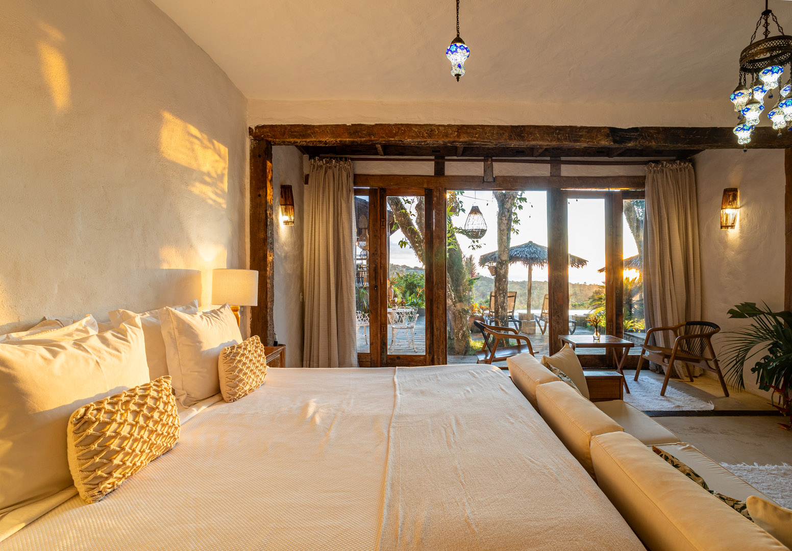 Suíte deluxe de 100m² com banheira de hidromassagem, duas duchas e vista para o mar. Cama king-size com mosquiteiro dossel, closet amplo, sala de estar e varanda privativa. Elegância natural cercada pela Mata Atlântica para até 4 pessoas.