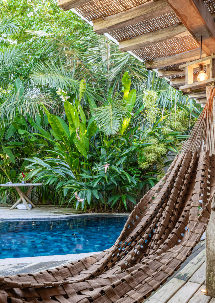 Duas suítes king em arquitetura assinada, piscina privativa em jardim tropical e o serviço boutique Bahia Bonita.