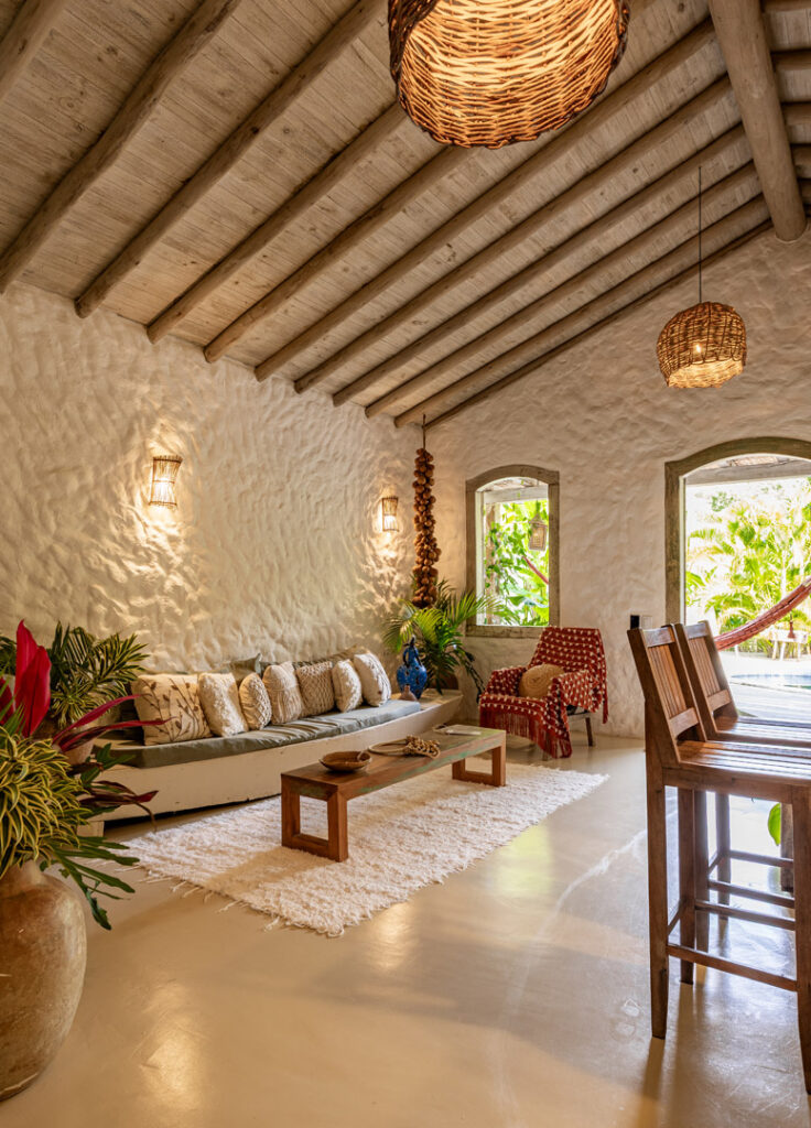 Muitas casas em Trancoso apenas têm “cara de Trancoso”. A Casa Tupã tem a alma. Assinada por Iata, cada escolha aqui tem propósito: amplitude que não desperdiça espaço, luz natural que substitui lâmpadas até o fim da tarde, materiais naturais que melhoram com o tempo.
