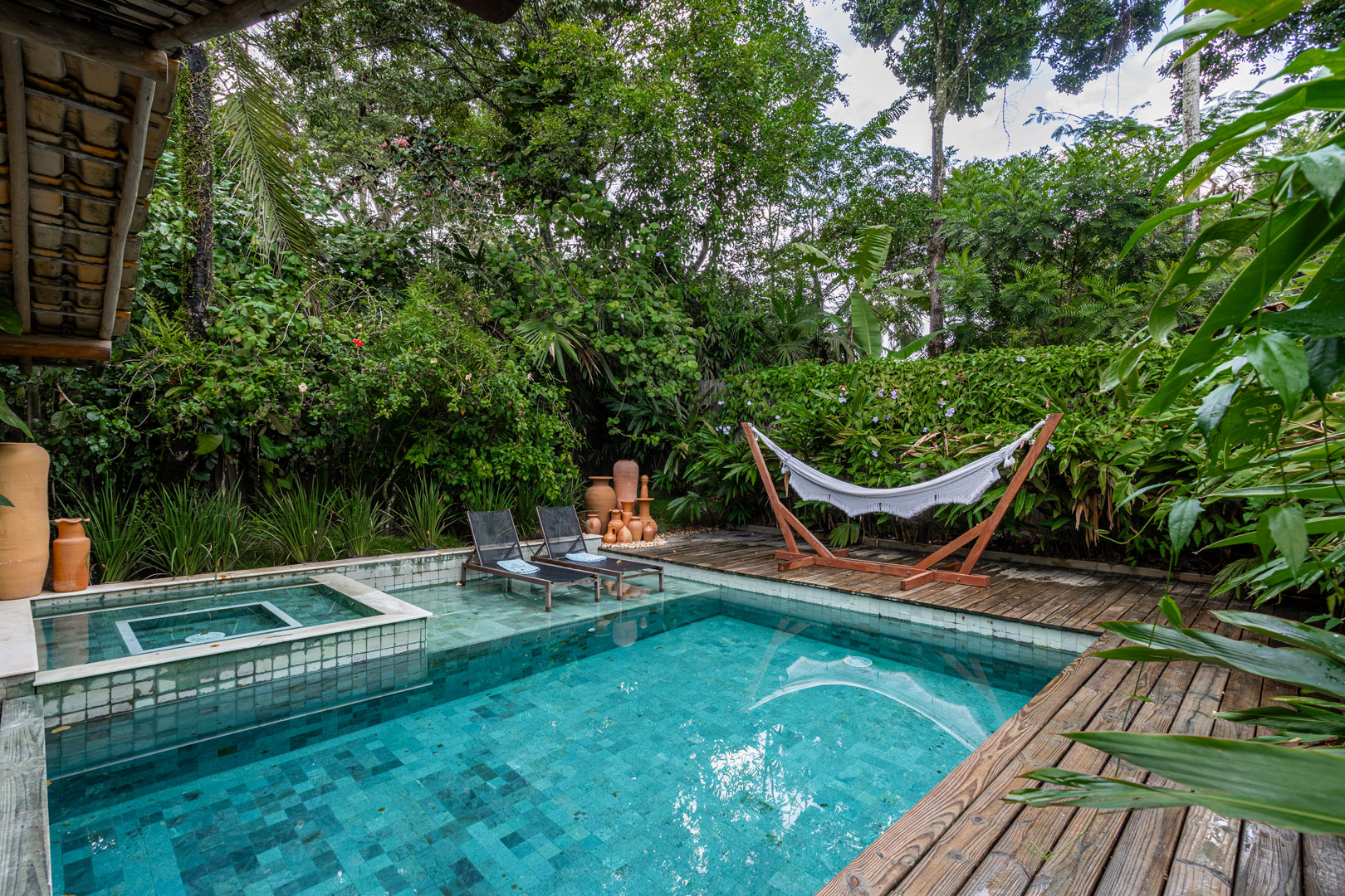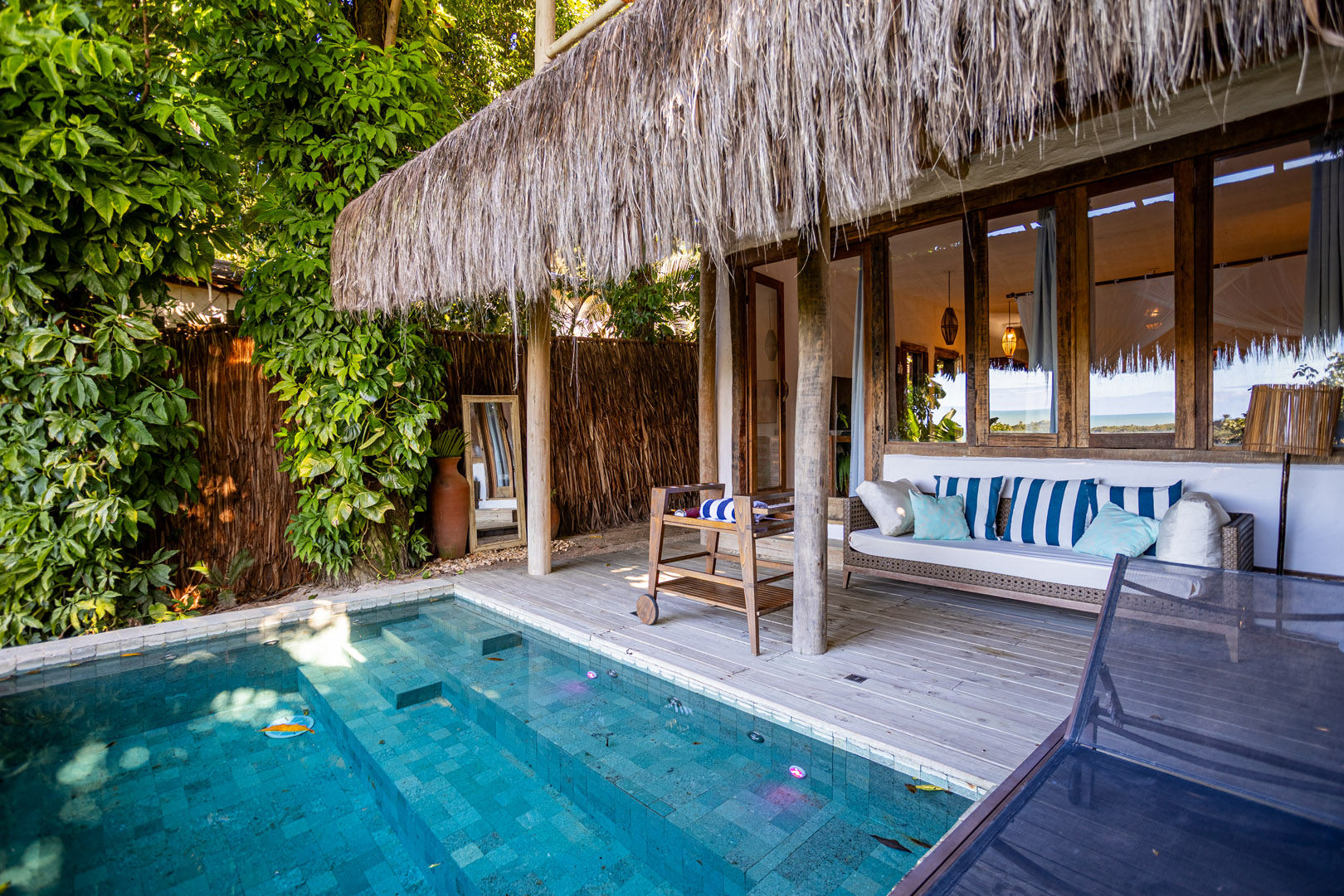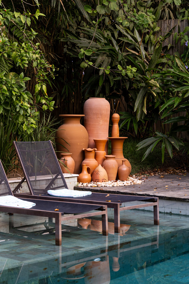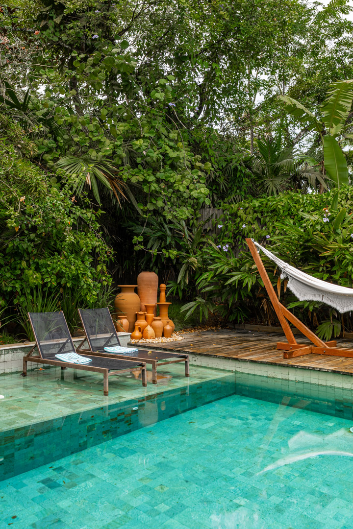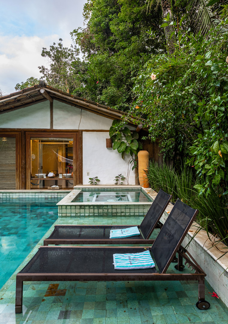 No exterior, desfrute de momentos de lazer na sua piscina privativa, envolta por um belíssimo jardim tropical que assegura privacidade e contato direto com a natureza.