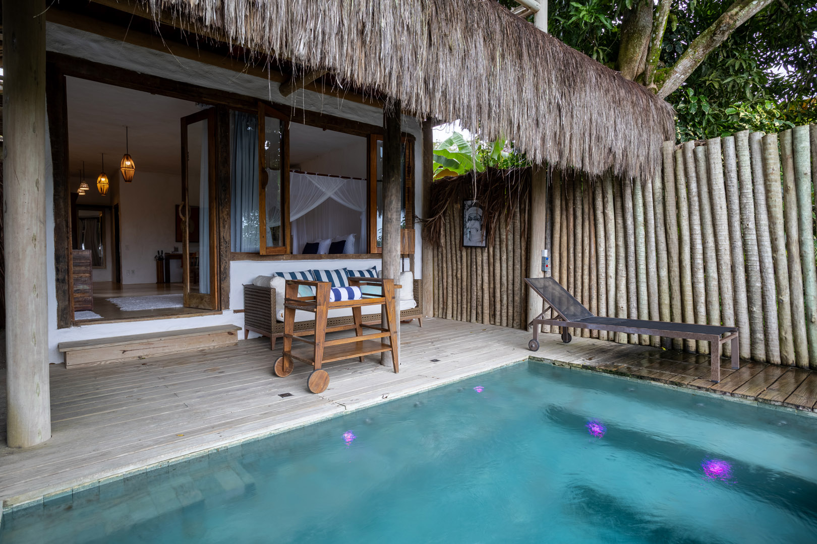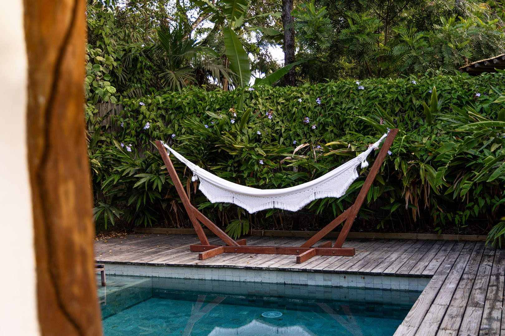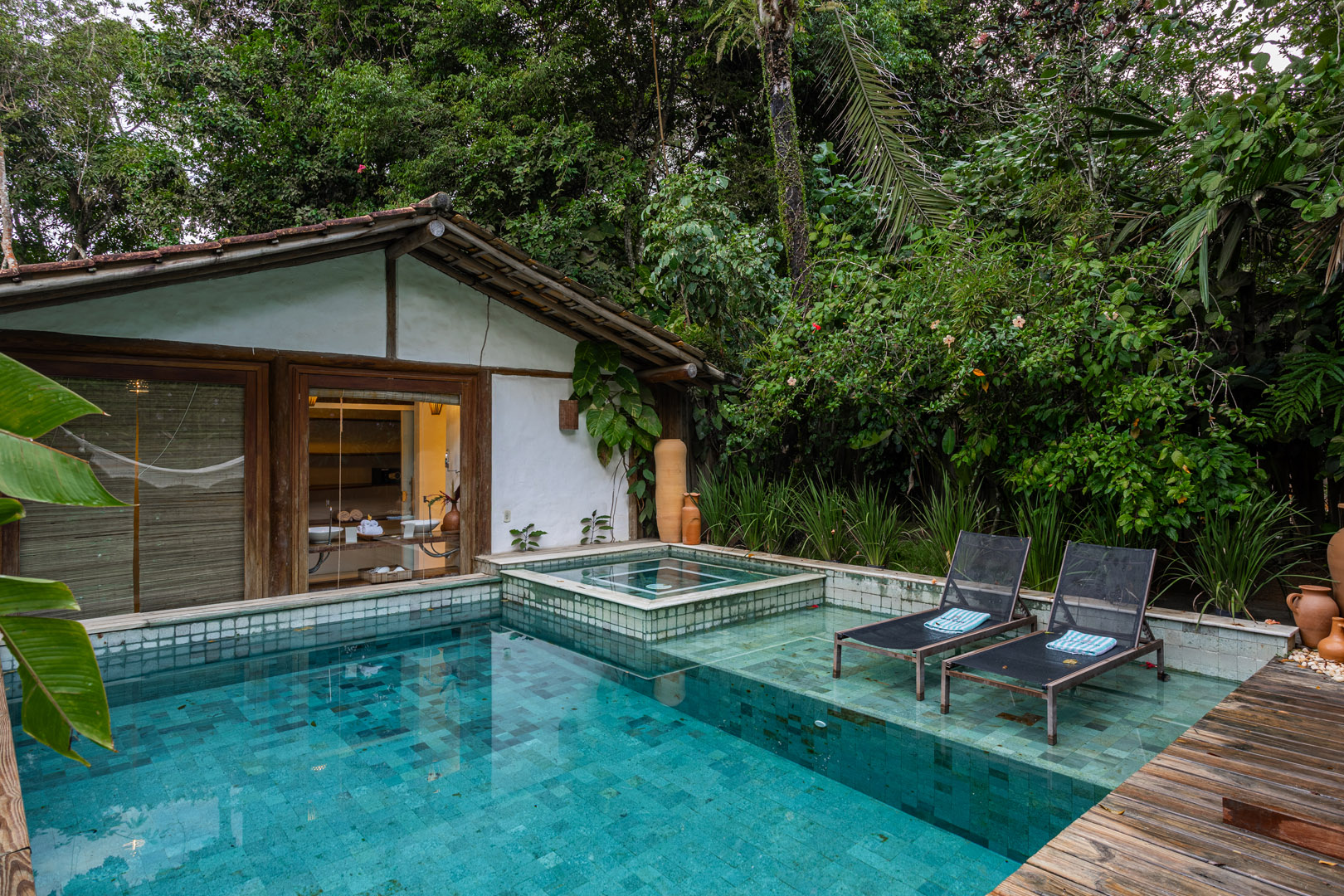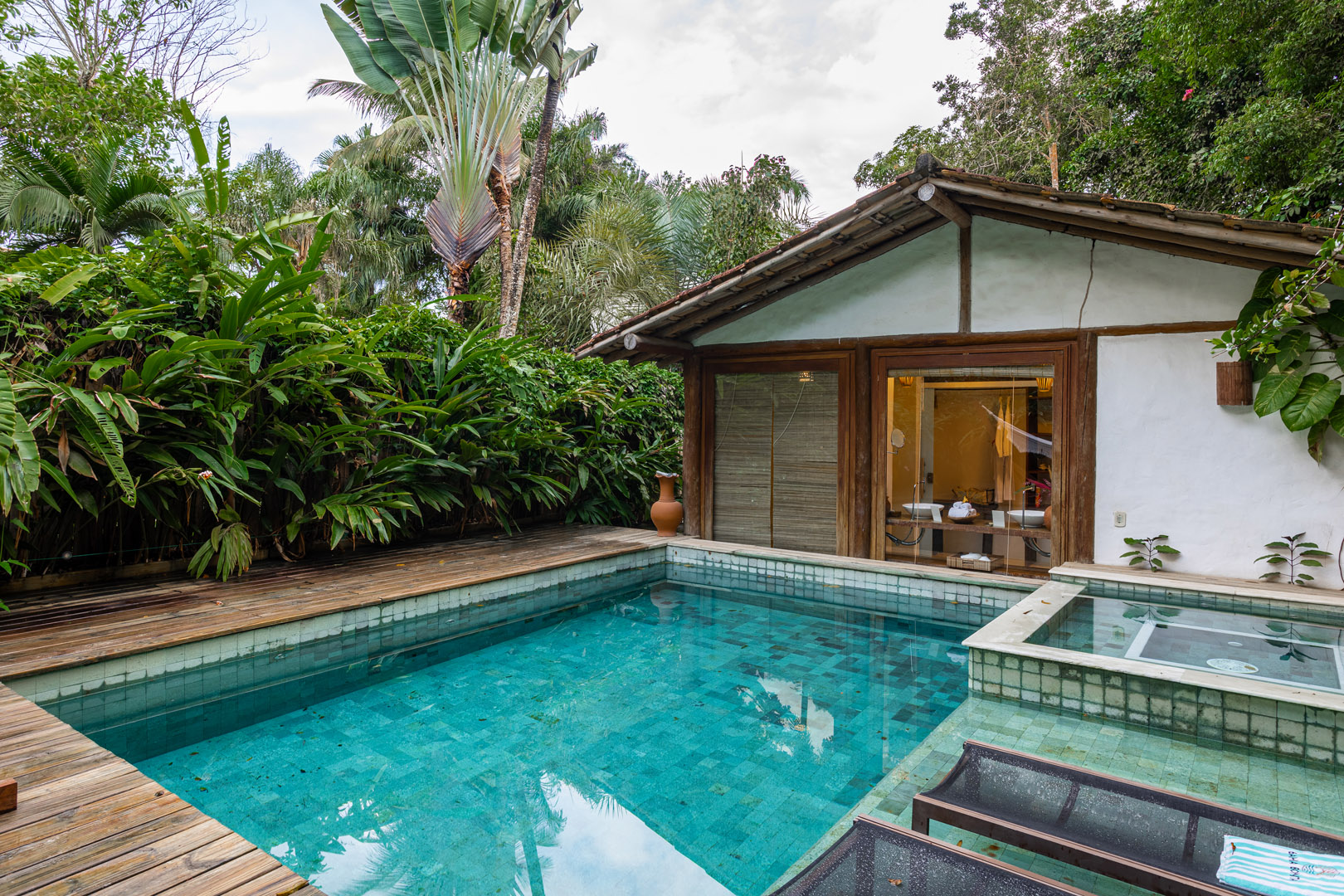 No exterior, desfrute de momentos de lazer na sua piscina privativa, envolta por um belíssimo jardim tropical que assegura privacidade e contato direto com a natureza.