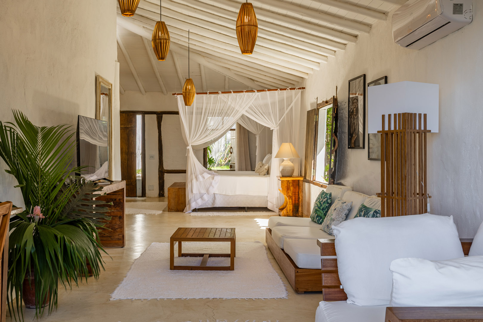 O ambiente interno é um convite ao relaxamento: a cama king-size, vestida com sofisticado enxoval Premium e adornada por um charmoso mosquiteiro dossel, confere requinte e romantismo, enquanto o espaçoso closet e a área de estar com chaise e sofá garantem funcionalidade e aconchego.
